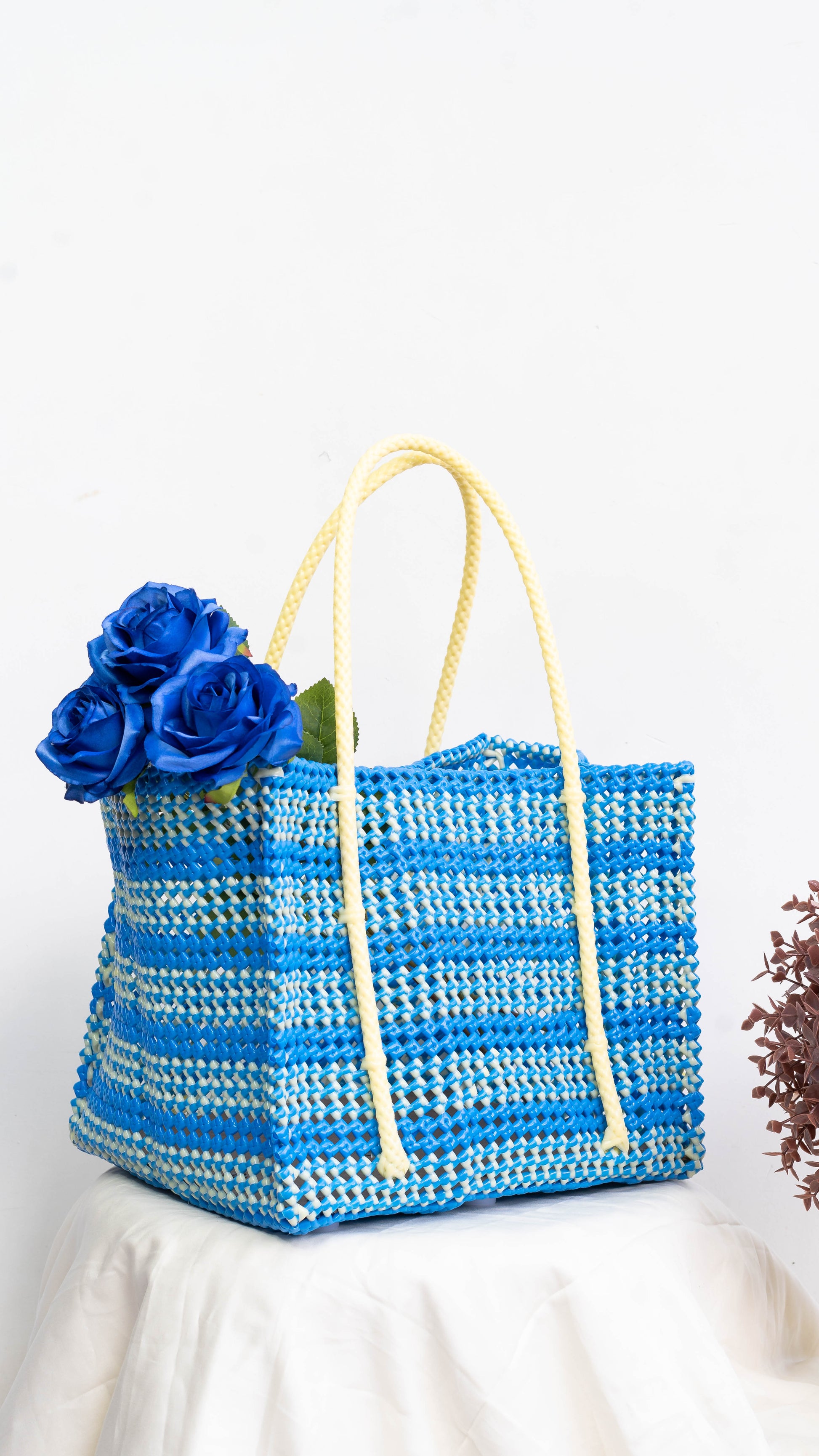 Bring home an expertly crafted handbag made out of recyclable plastic wires. A colorful Blue & White delight in the form of a light and spacious basket that blends together sustainability with style. This technique weaves environmentally sustainable plastic wires tightly together in a criss-cross or basket-like style. This bag holds its form, is waterproof and rip-resistant, courtesy of its composition.