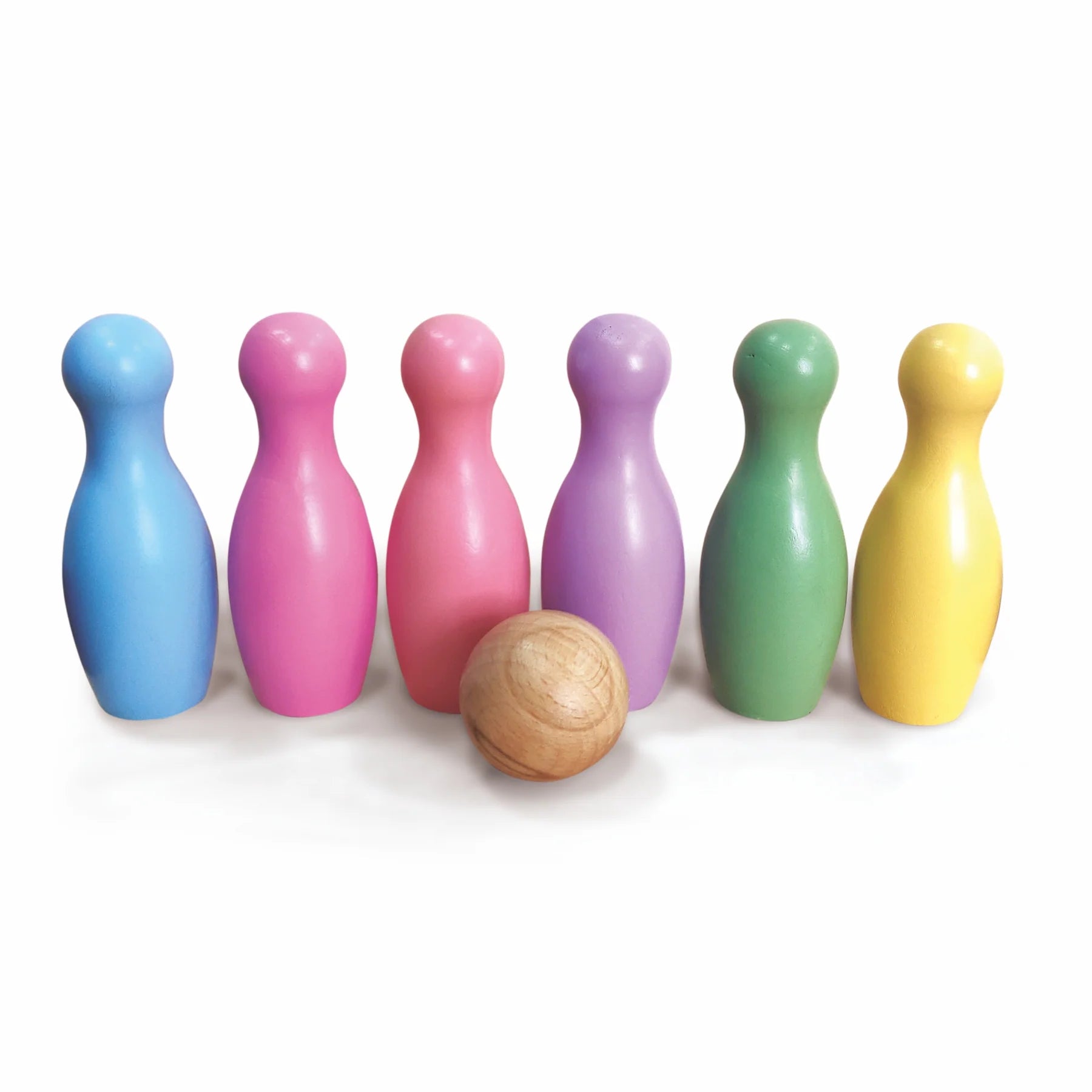 This Wooden Bowling Pin Set is a great setup for fun and excitement. The set includes six bowling pins in sweet pastel colours, along with a ball that glides smoothly. They stimulate active movement as well as skill development while allowing children to practice their aim, coordination, and turn-taking, all the while.