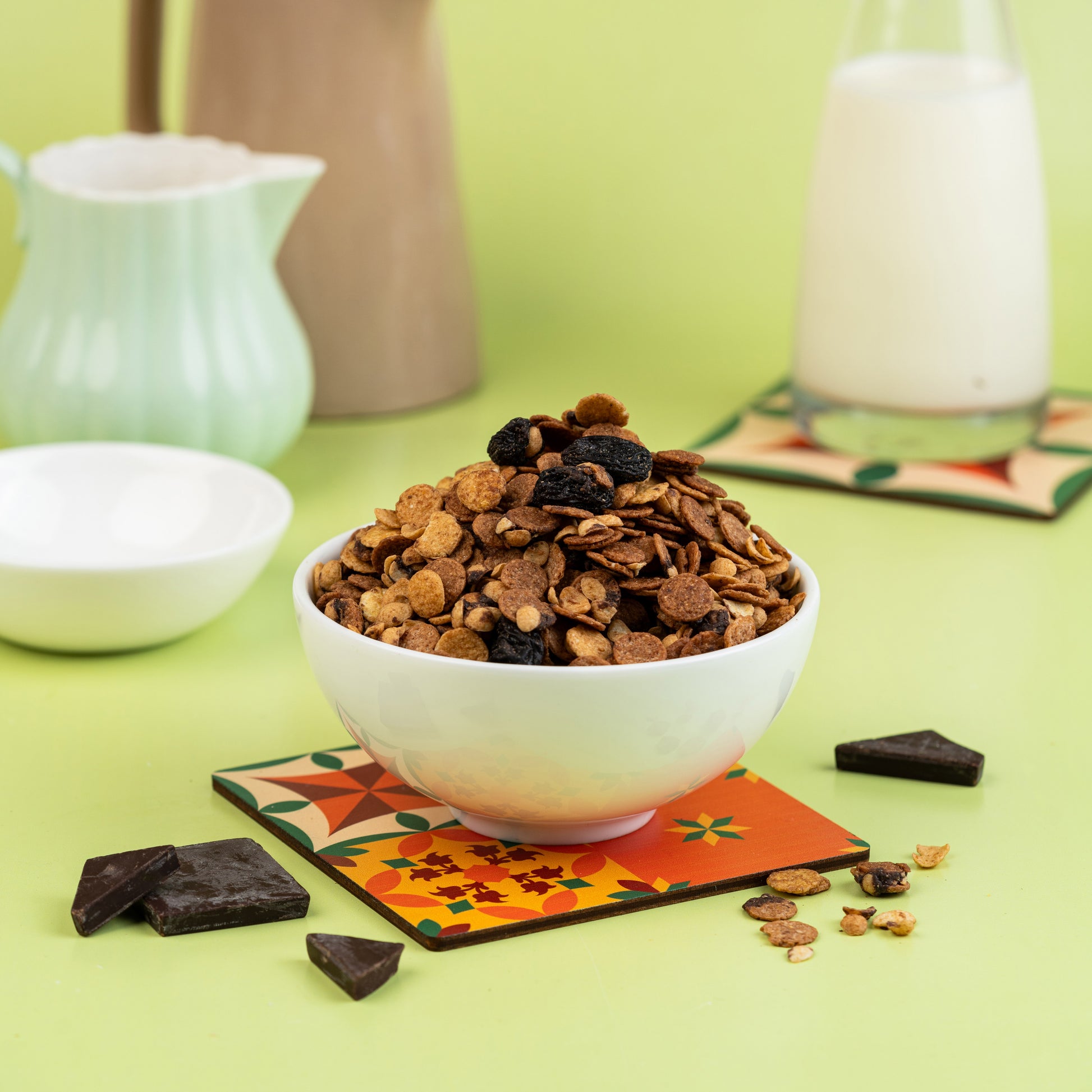 A chocolatey twist to your healthy mornings! Introducing our Choco Muesli, a perfect mix of nutrition and indulgence that makes breakfast your favorite meal of the day. With a delicious chocolate flavor in every bite, this muesli combines whole grains, rolled oats, millet crisps, crunchy nuts, seeds, and a touch of natural sweetness, all wrapped in rich cocoa goodness.