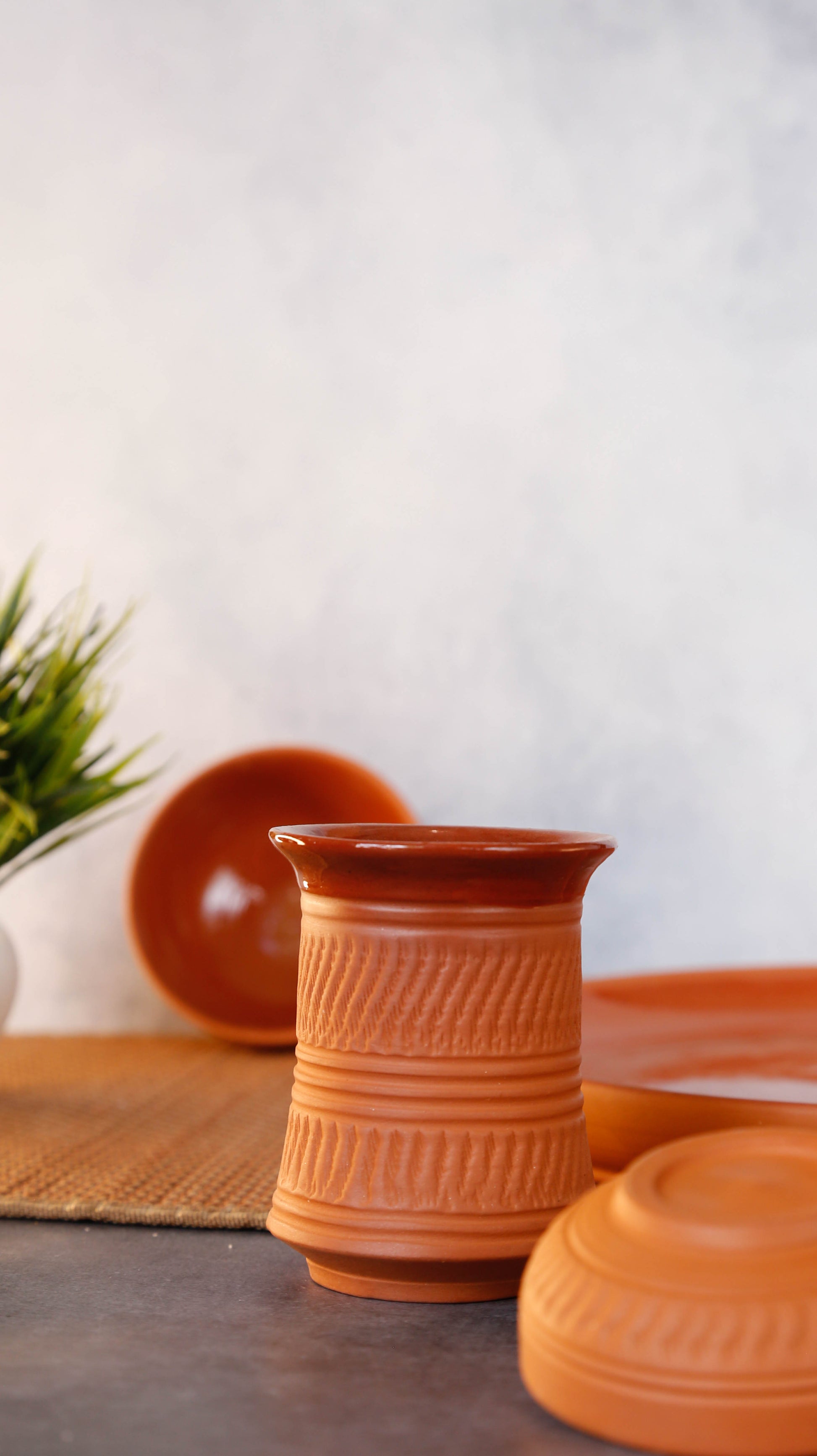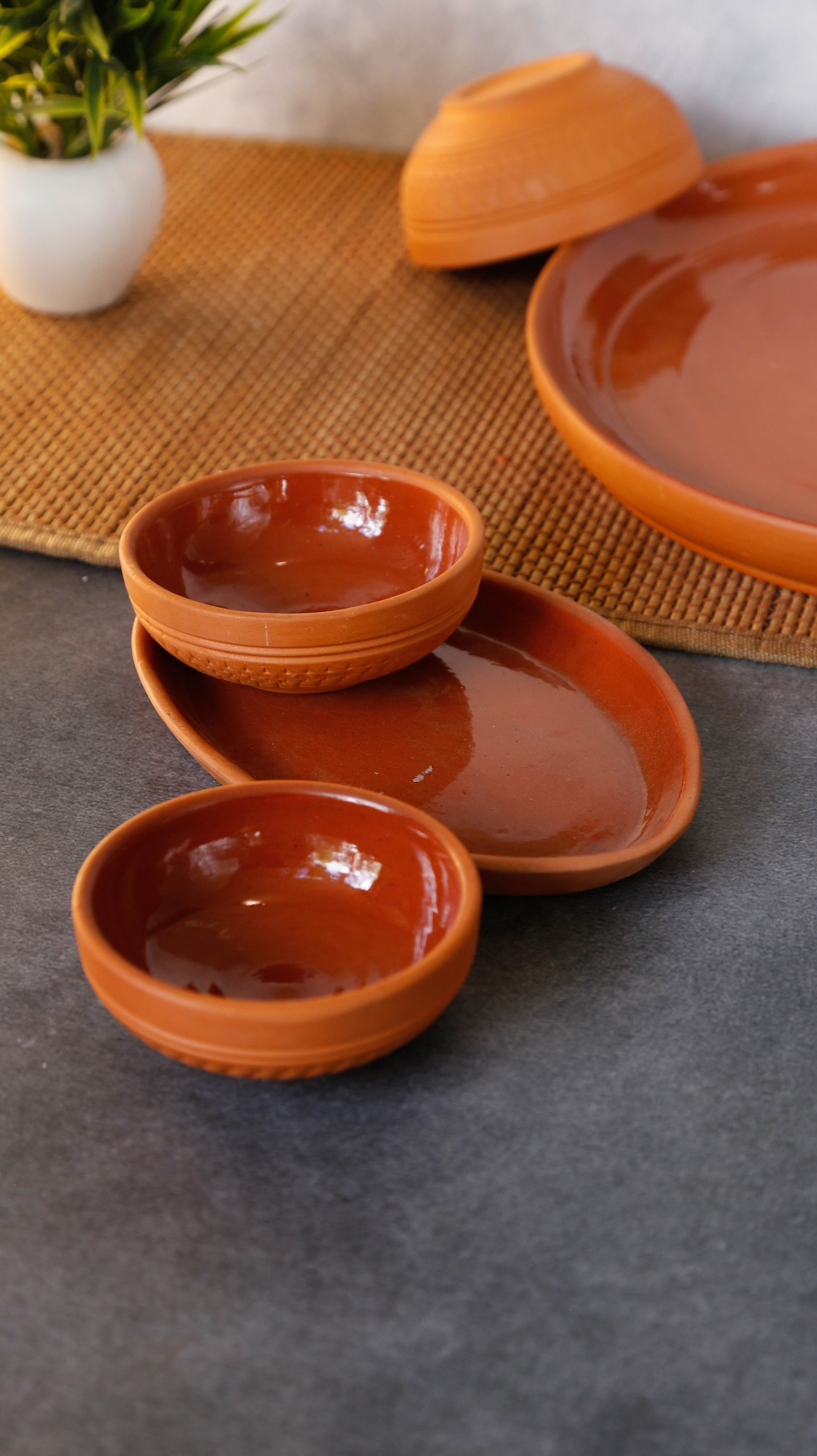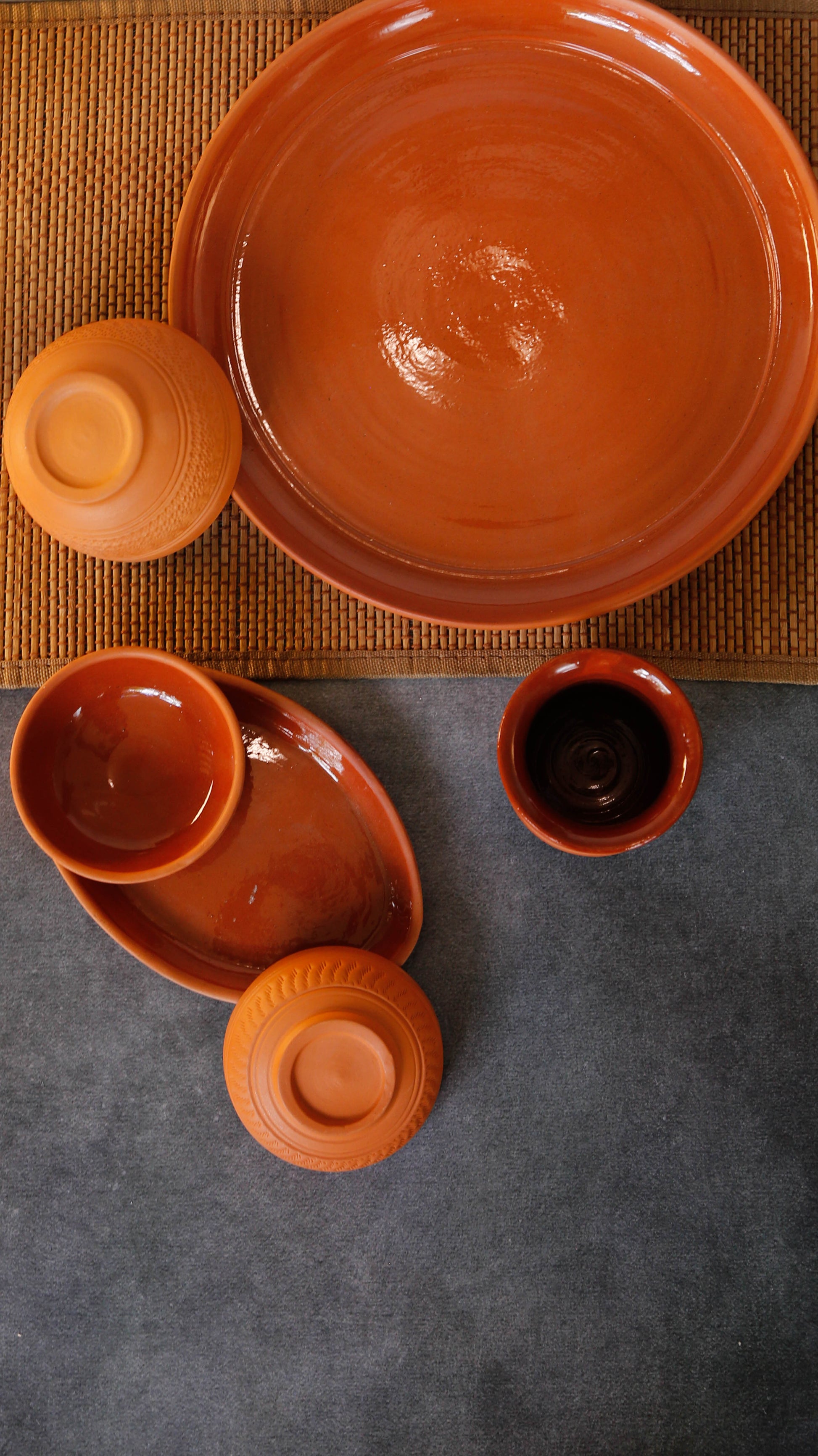 Our 6-piece Terracotta dining set brings the warmth of tradition to your home. It is handcrafted by skilled artisans using 100% natural, Terracotta clay. This eco-friendly and biodegradable dining set is a perfect choice for those who embrace a natural lifestyle and make mindful, sustainable choices. Clay’s porous nature helps keep food fresh while gently infusing it with an earthy aroma, enriching every bite and elevating your dining experience.