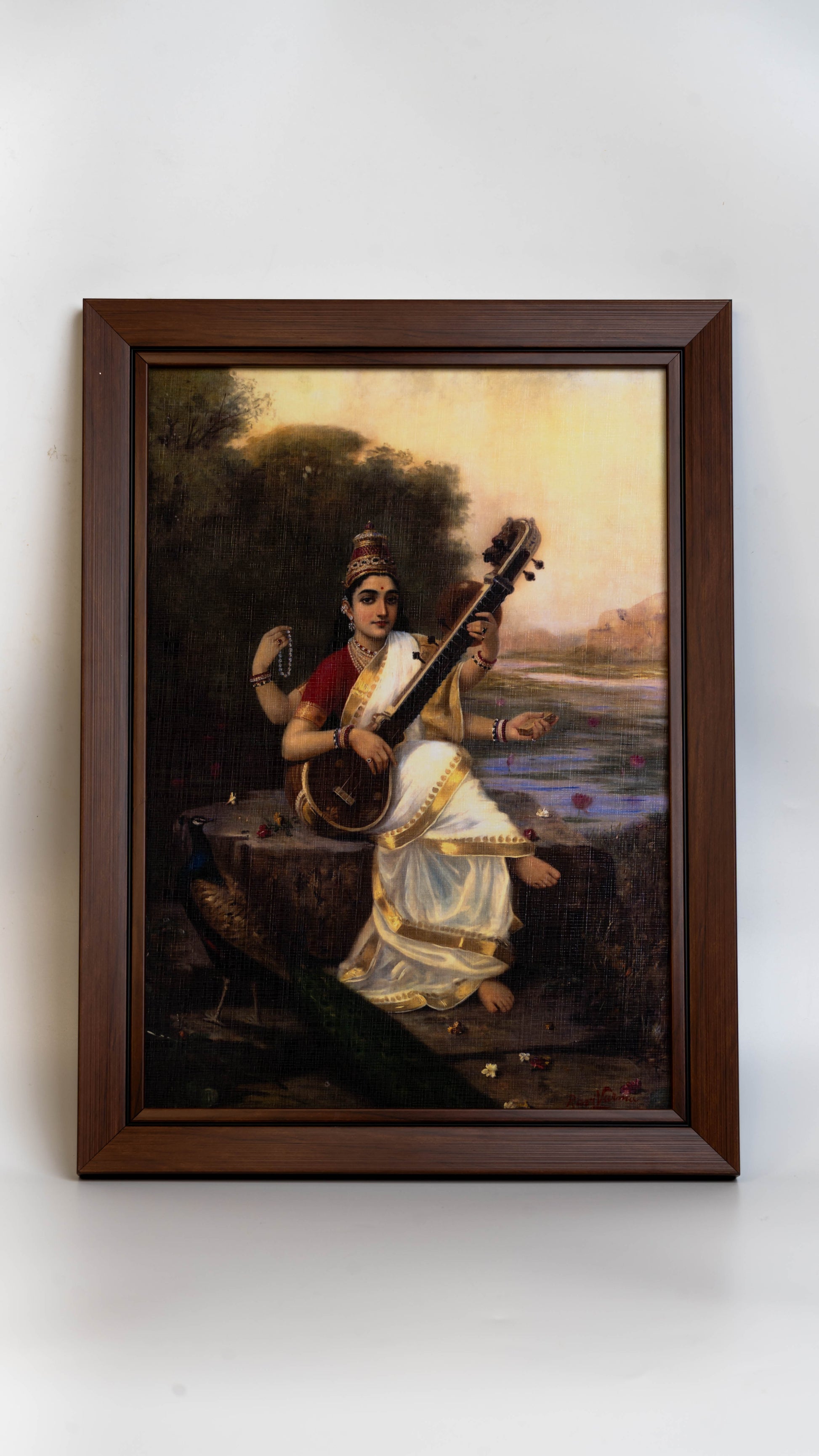 Transform your room with the exquisite beauty of our digital print of Ravi Varma's painting of Devi Saraswati. The painting captures the essence of Saraswati, The Hindu goddess of knowledge, music, art, and wisdom.