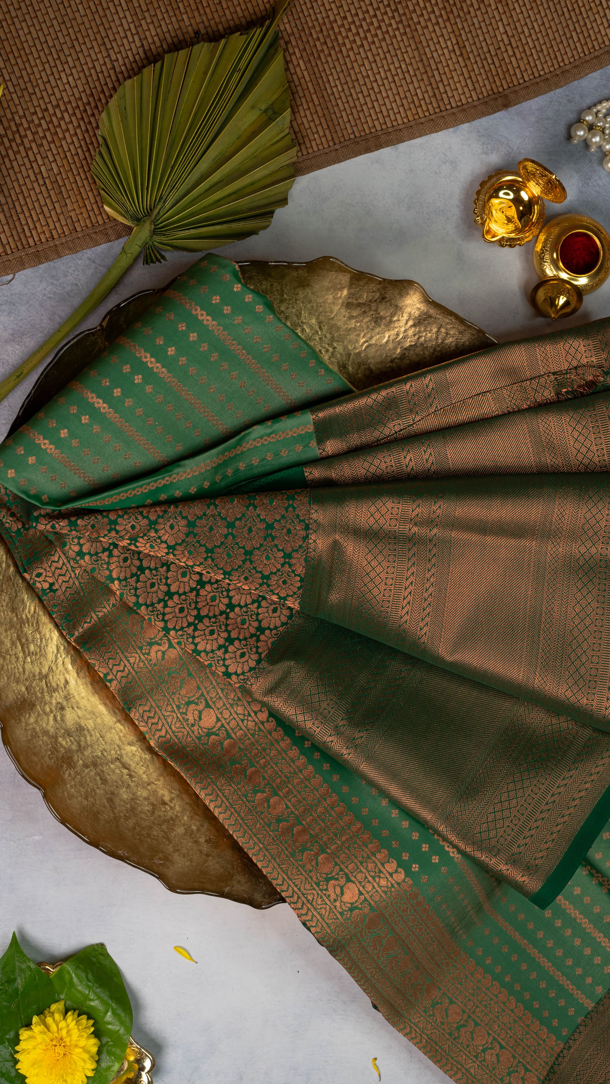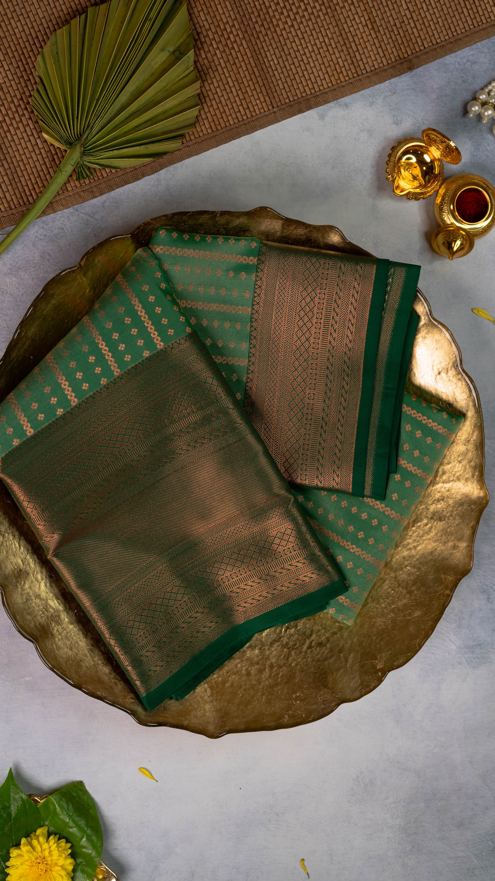 Breathe eternal sophistication with the Kuuraii Green Premium Semi-Kanchi Silk Saree with Blouse, a perfect fusion of imperial hues and classic craftsmanship. Crafted from luscious celestial semi-Kanchi silk, this saree has a gorgeous emerald green base, accented with stunning copper zari work. The motifs—a refined play of diamonds and orthodox geometric patterns—capture the majesty of South Indian temple architecture.