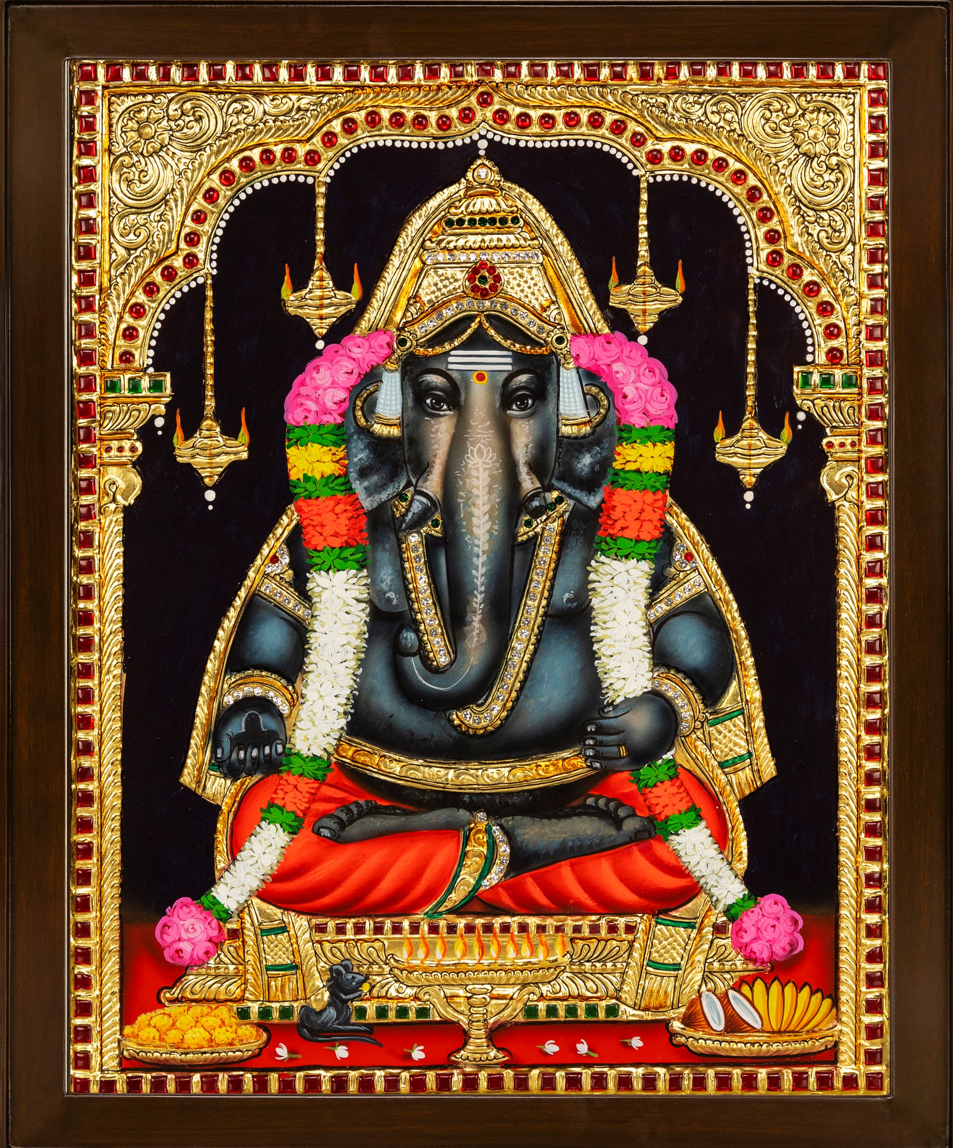 Hand-crafted using real 22K gold foil and embellished with intricate single embossed details, the painting dazzles with AD stones, framed in a premium teak frame, that expands the charm and depth of the sacred piece. We use secure wooden boxes to pack the medium and large paintings, ensuring they reach you safely and securely. We hope Karpaga Vinayagar's divine energy/benevolence illuminates your space and soul.