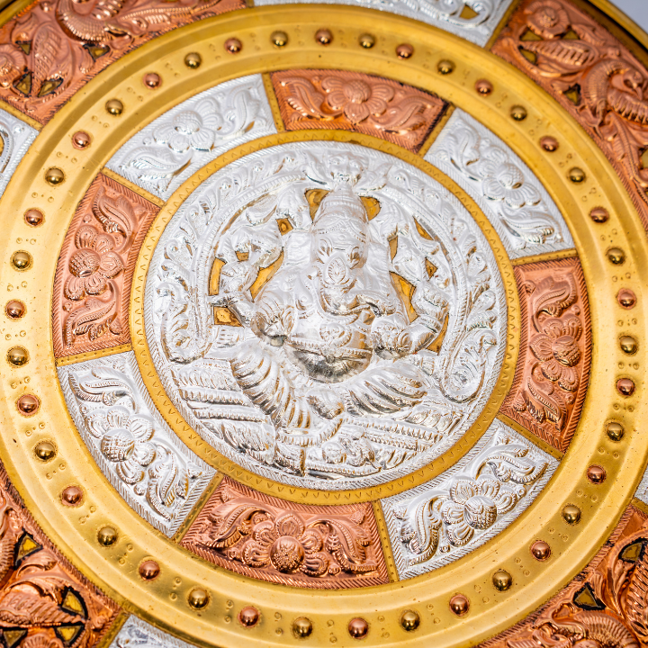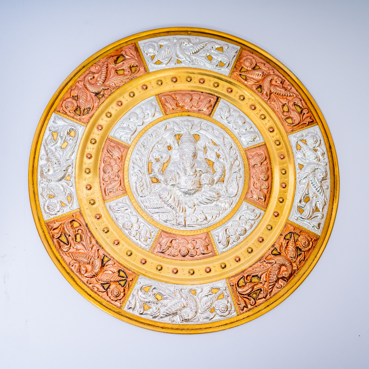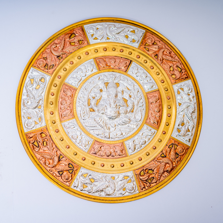 The Thanjavur Tri-Metal Art Plate is a renowned piece of traditional Indian craftsmanship, celebrated for its intricate design and rich historical significance. This exquisite artwork showcases a harmonious blend of three metals—copper, brass, and silver—creating a striking and opulent visual effect. This art plate comes along with a wooden stand.