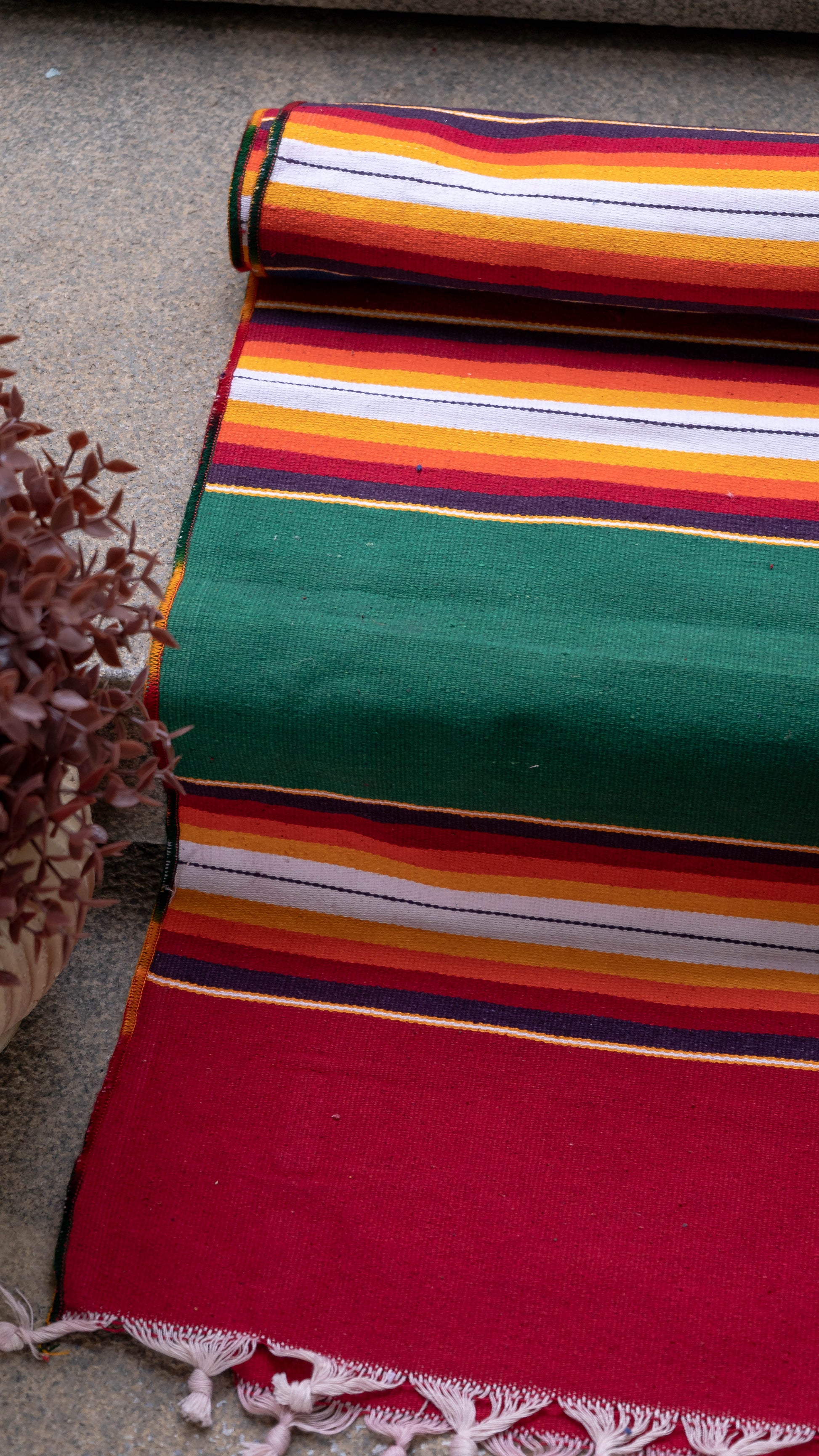 The Mini Hall Jamakkalam is a traditional piece of original handloom designed for its versatility and durability. Its reversibility and multicoloured patterns make it convenient to flip it over to both sides for varied designs. This beautiful piece can be used as a rug or a floor, giving the room a boost of colour and character.