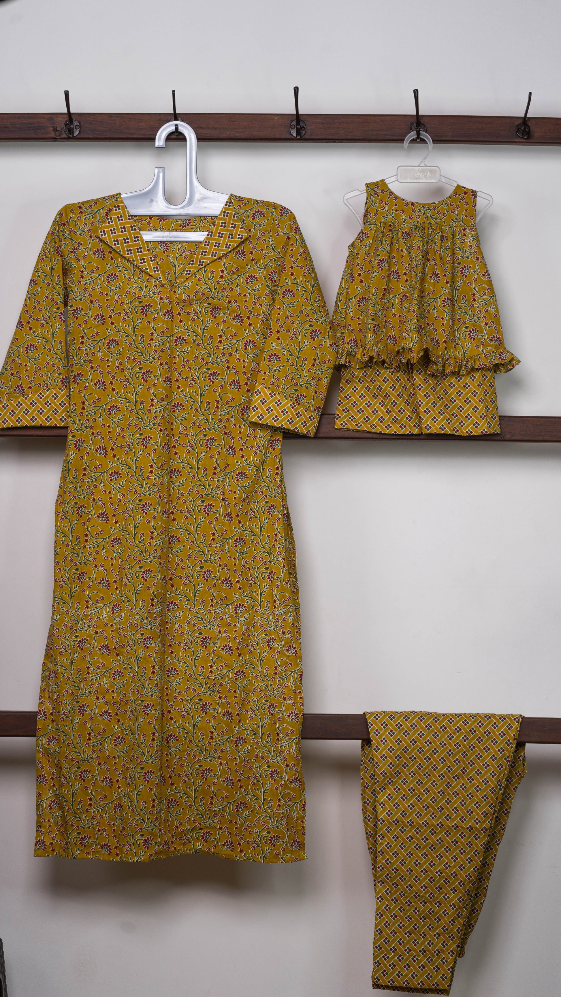 Mom's kurti is full of luxuriant floral and features contrast geometric detailing at the neckline and cuffs, giving a classier twist to traditional print. Little one's ruffle-top and shorts set is cut out to be able to bear the running, twirling, and giggling that come from being a stylish mini-you.