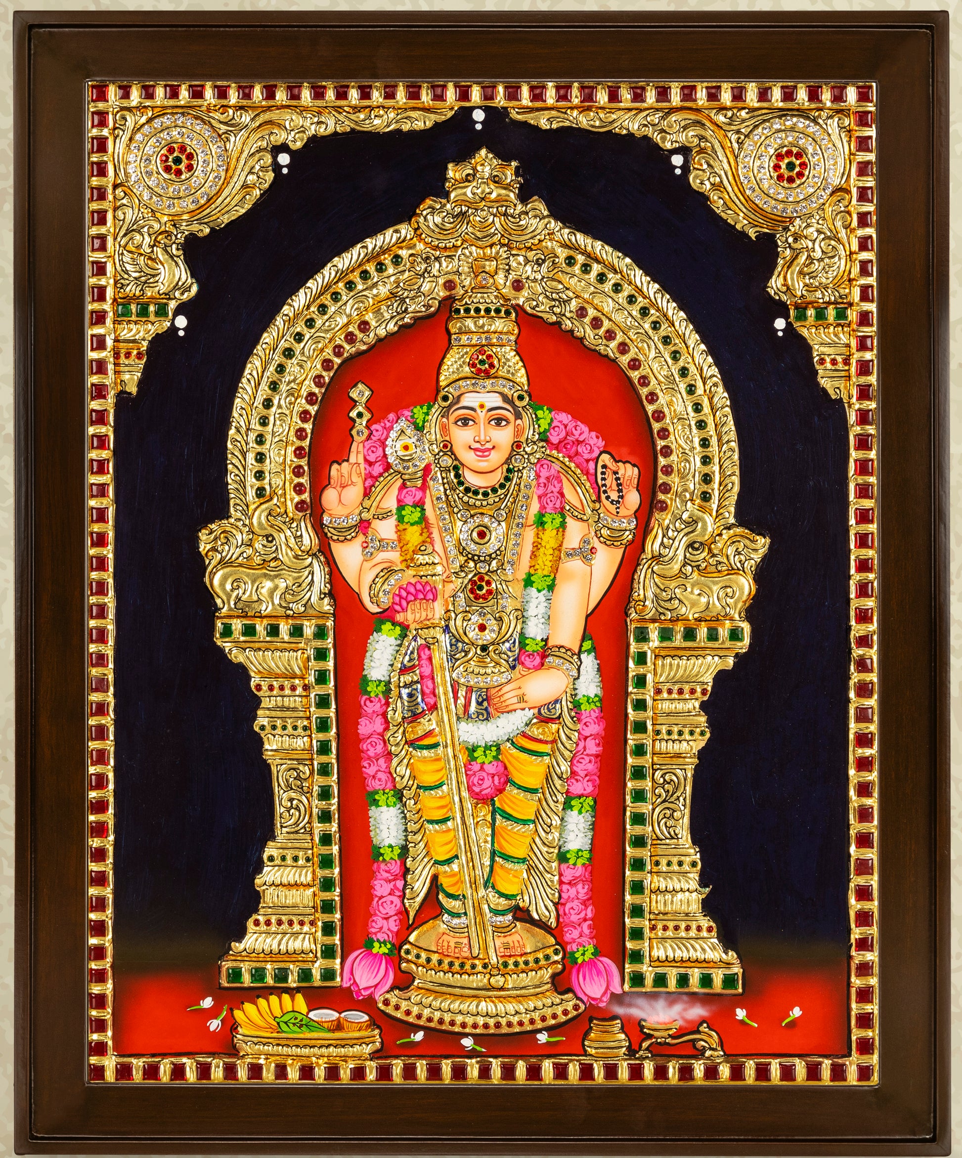 The Murugar Tanjore Painting - Single Embossed celebrates divine power and grace. Handcrafted with care and devotion to Lord Muruga, the God of wisdom, courage, and protection, this artwork captures the powerful Lord Muruga in all his divine strength and wisdom.