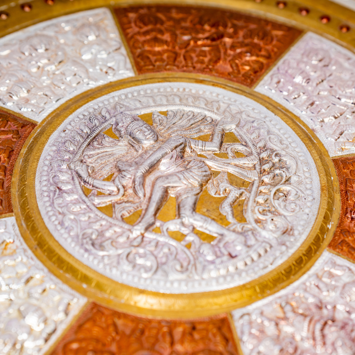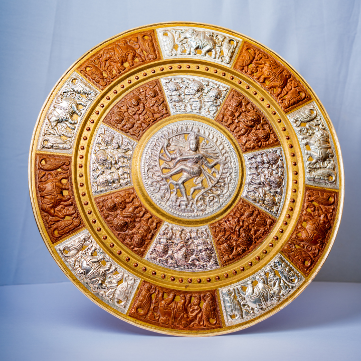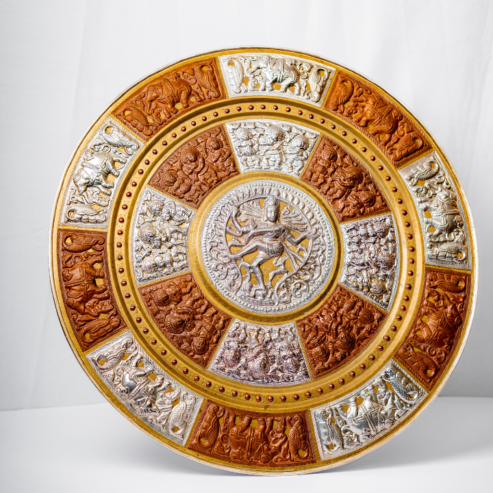 This plate is a refined expression of meticulous artistry and precise craftsmanship of copper, brass, and silver. Tri-Metal is a metal unique to Thanjavur and has been cherished for its exquisite beauty for more than 250 years.