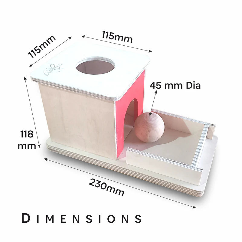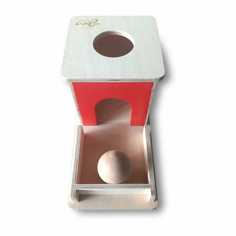 Woodbee's Object Permanence Box introduces infants to the concept of object permanence, a crucial cognitive milestone. Crafted entirely from wood, this toy features a disappearing-reappearing ball, aiding babies in understanding that objects exist even when out of sight. Recommended for ages 8 to 24 months or as soon as a baby can sit unsupported.