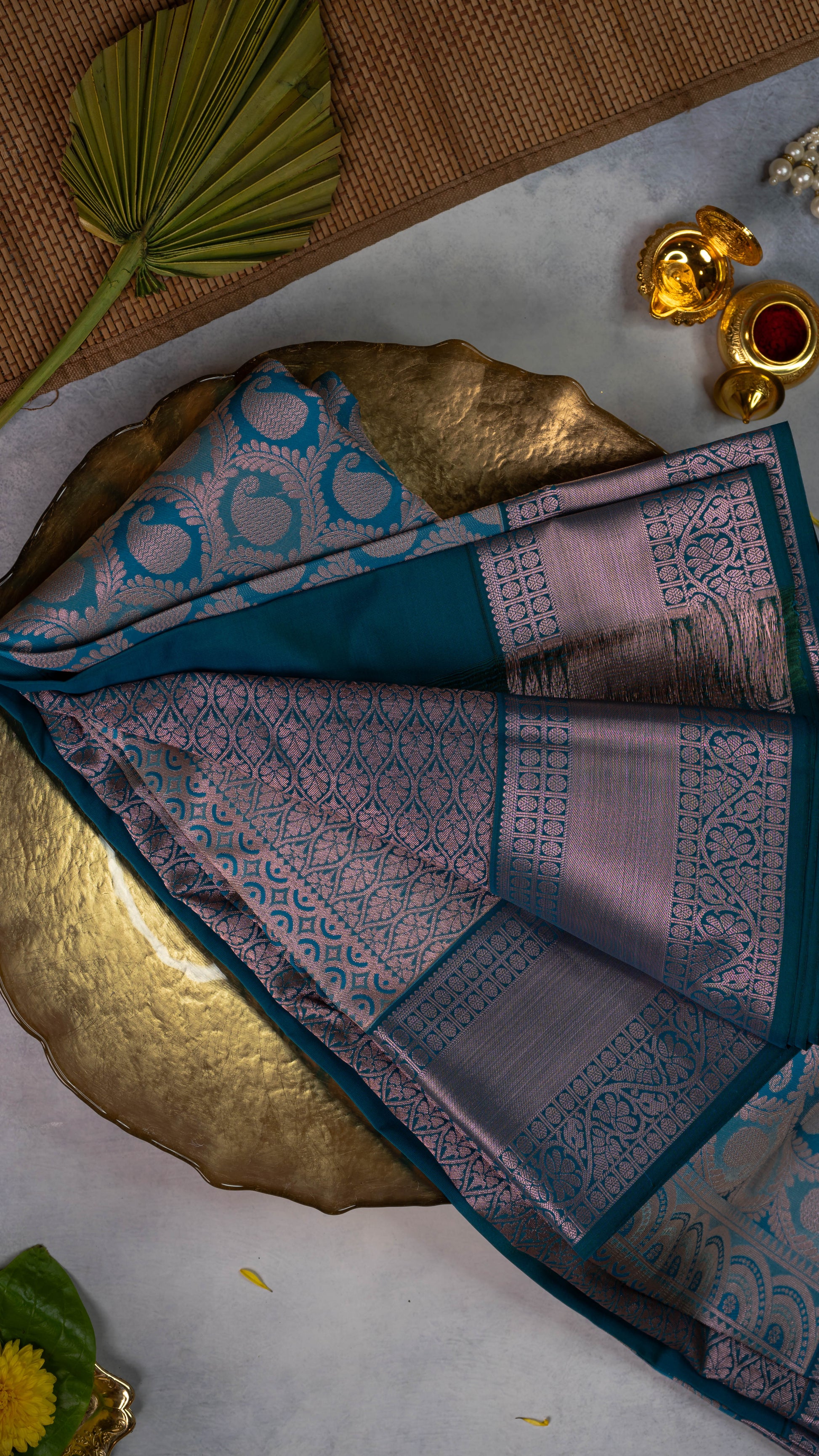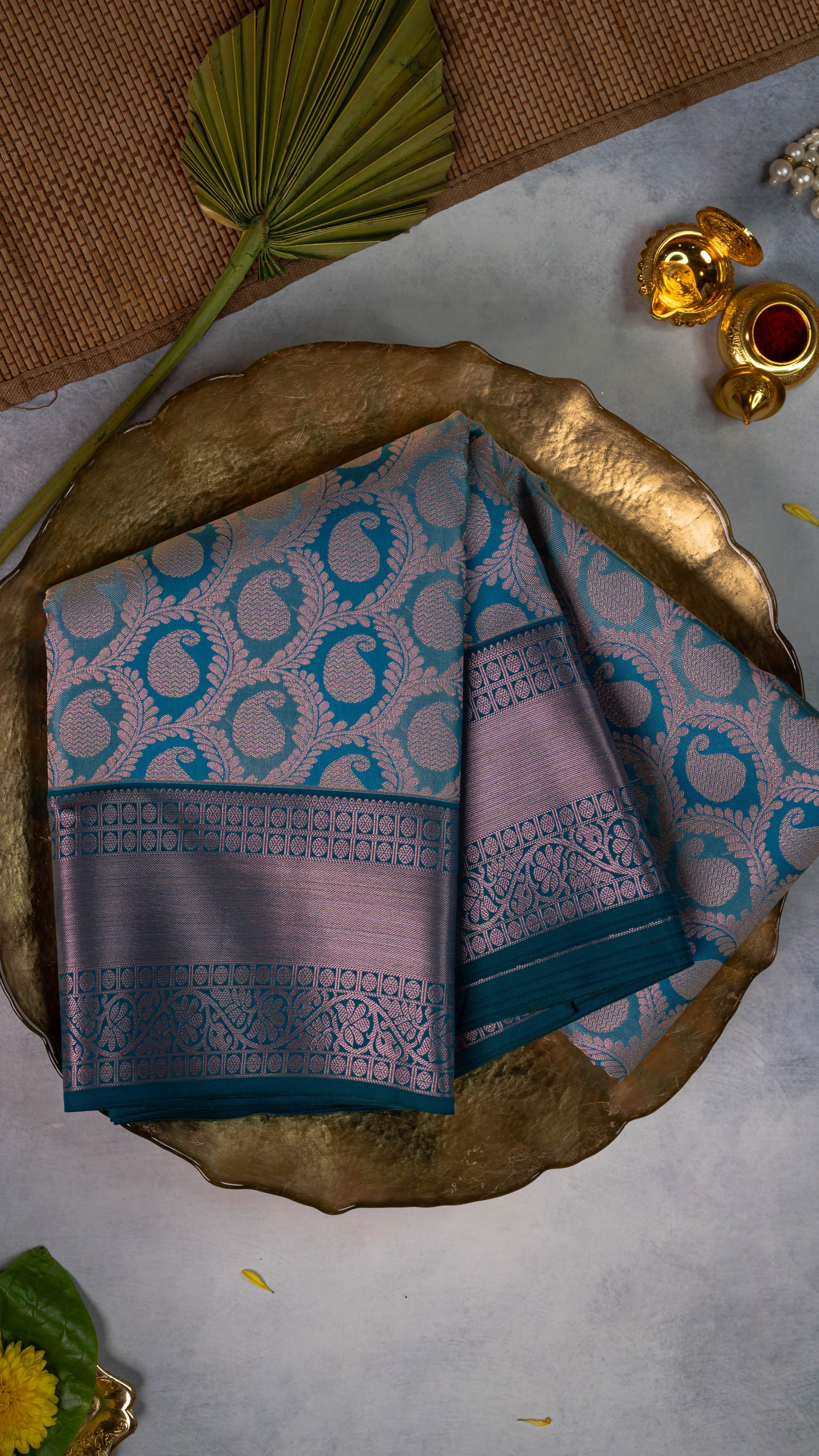 Allow yourself to be immersed in this calming Ocean Blue colored Premium Semi-Kanchi Silk Saree, a garment that has the serenity of the seas in its very essence and the majesty of heritage weaving. The lovely silver-pink zari paisley motifs against the sheer blue colour make it ideal for beauty throughout the day as well as elegance all through the night.