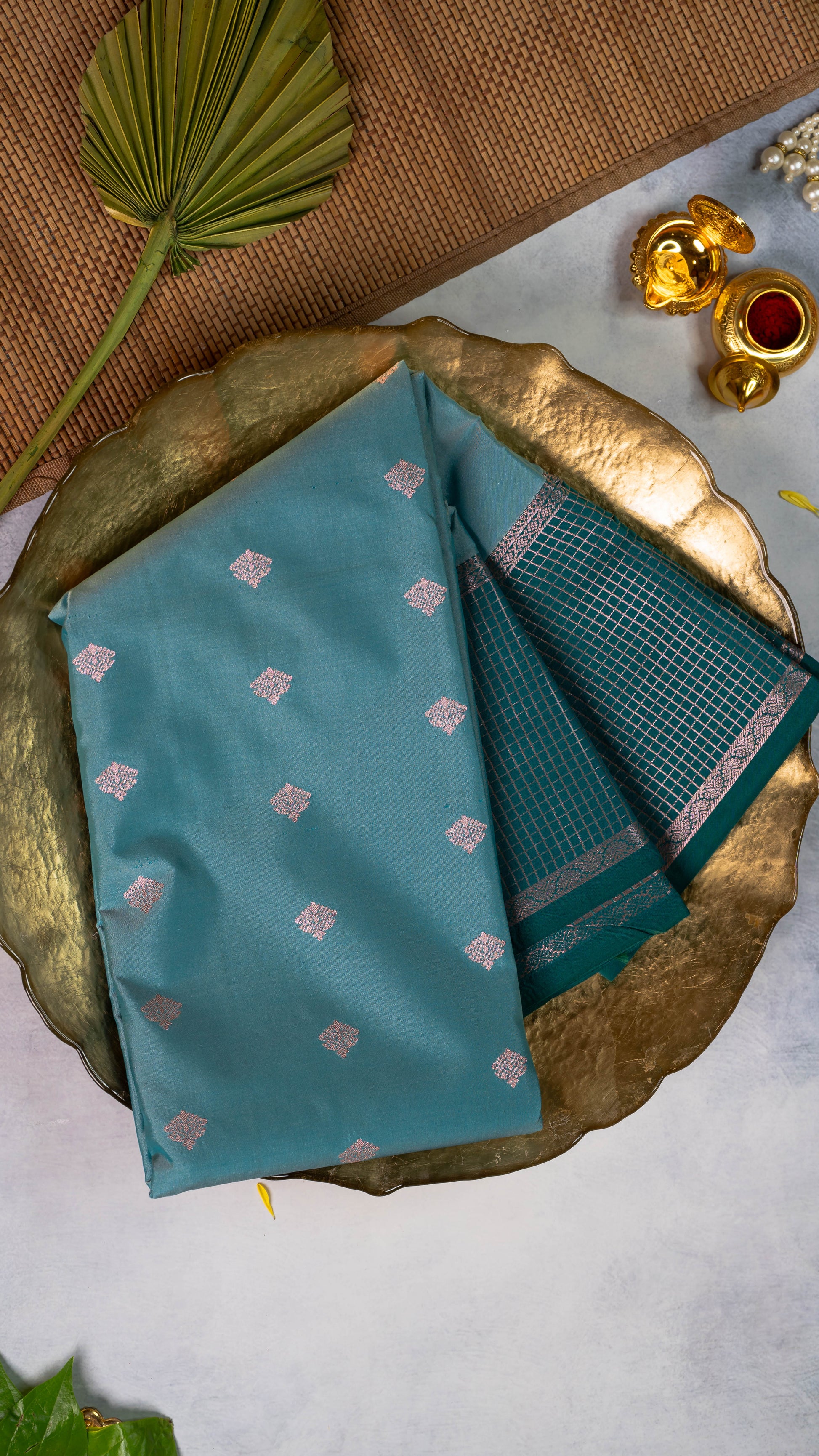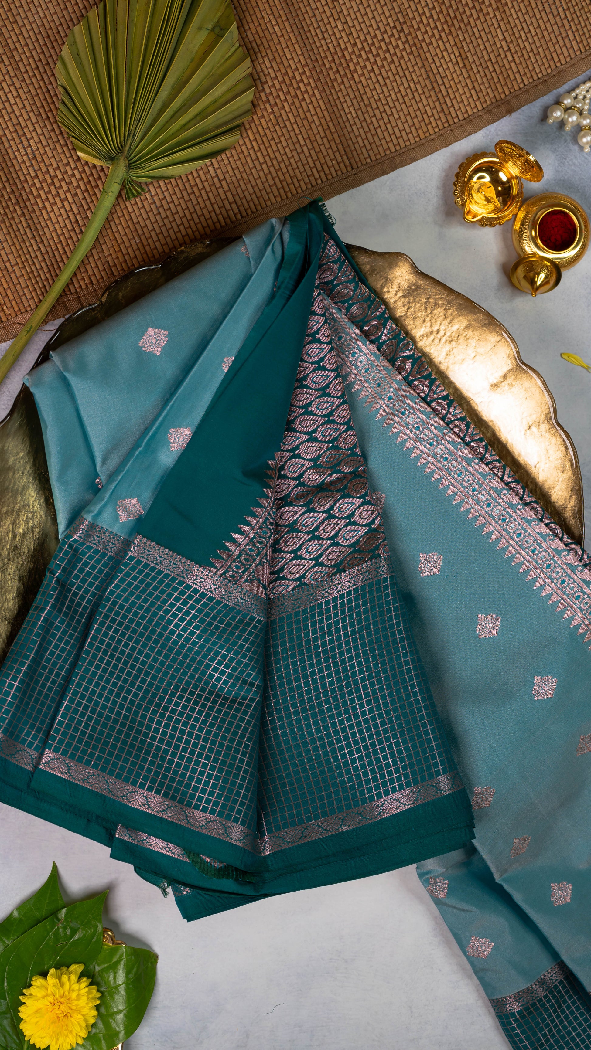 Paired with a matching unstitched plain contrast peackock green blouse piece with a checked Border