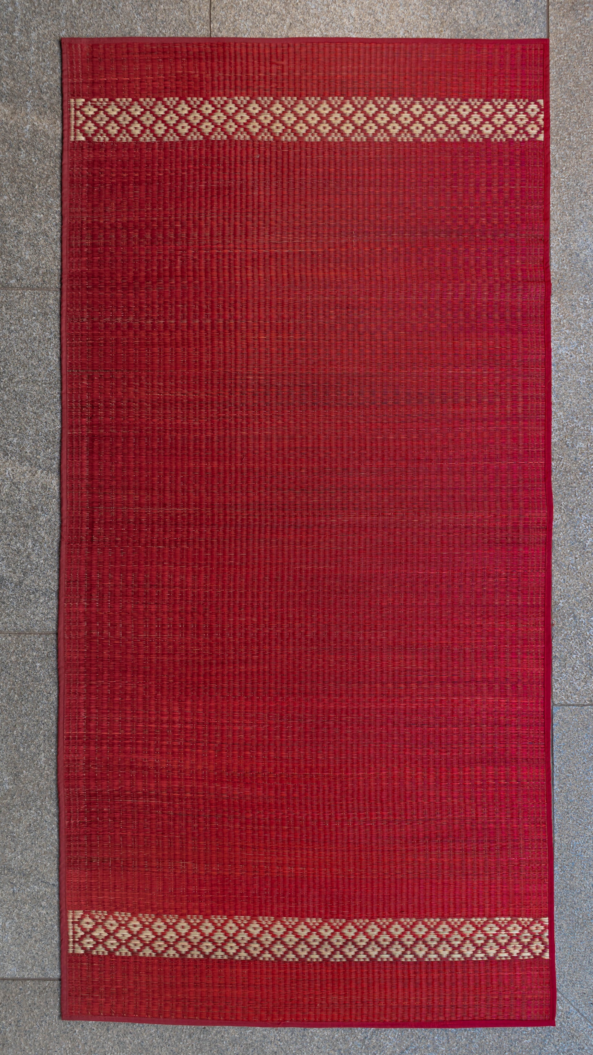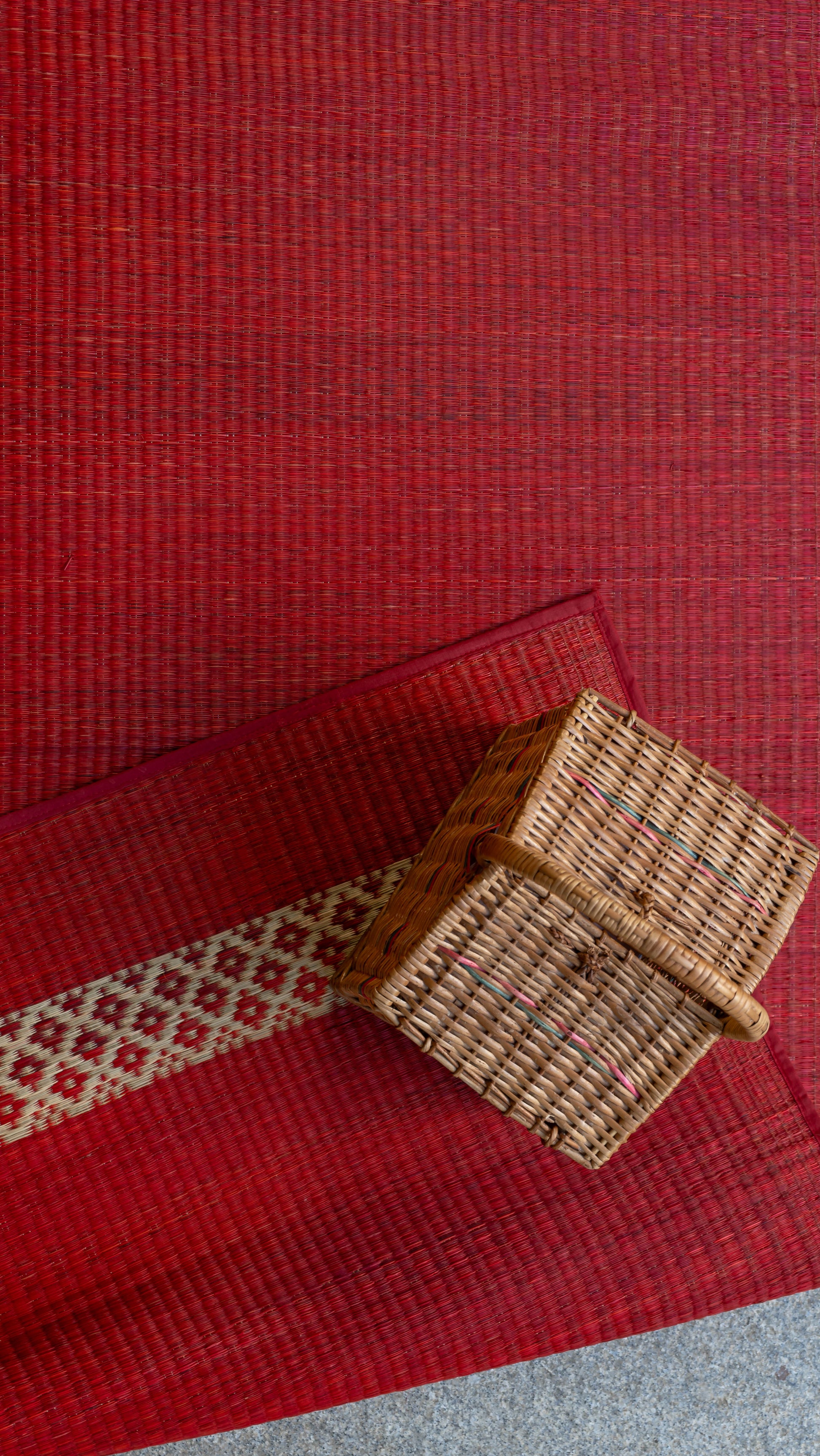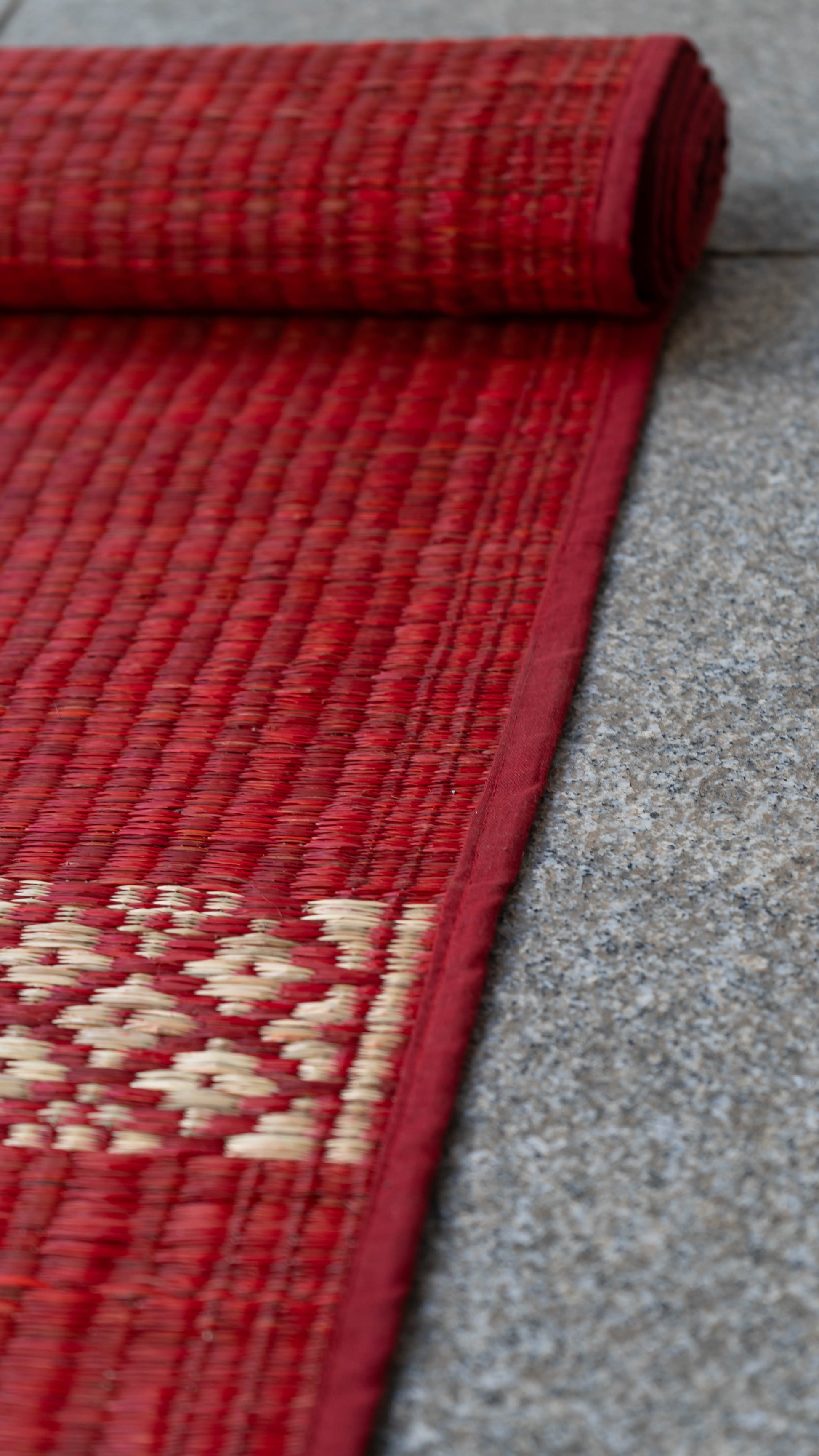 This beautiful Pattamadai River Grass Mat, in the colors Red and Off White, is crafted with perfection using Korai grass found along the riverbanks of Thamirabarani and brought together by the skilled artisans of Pattamadai village. These mats are ultra soft, pliable, and hypoallergenic.