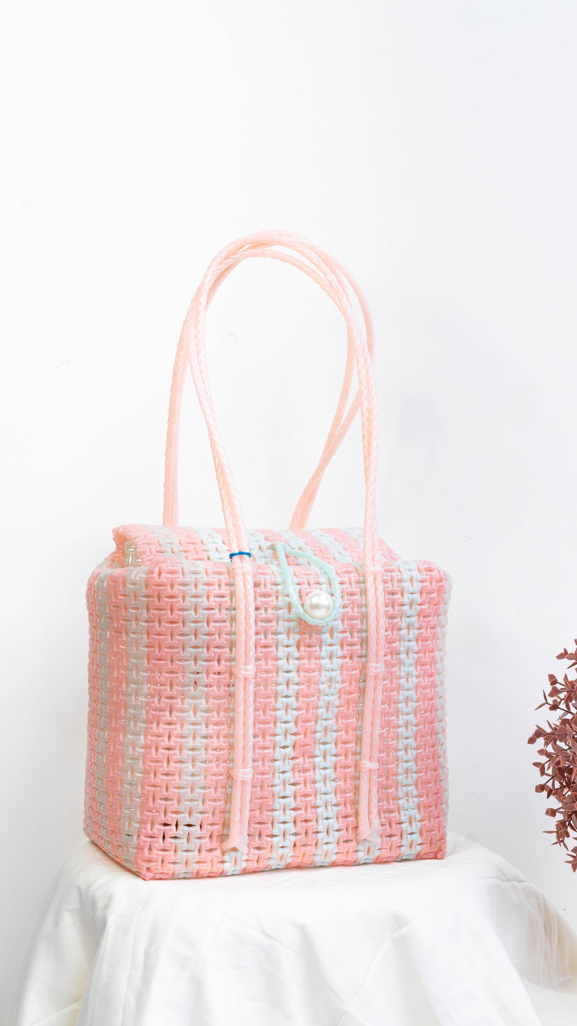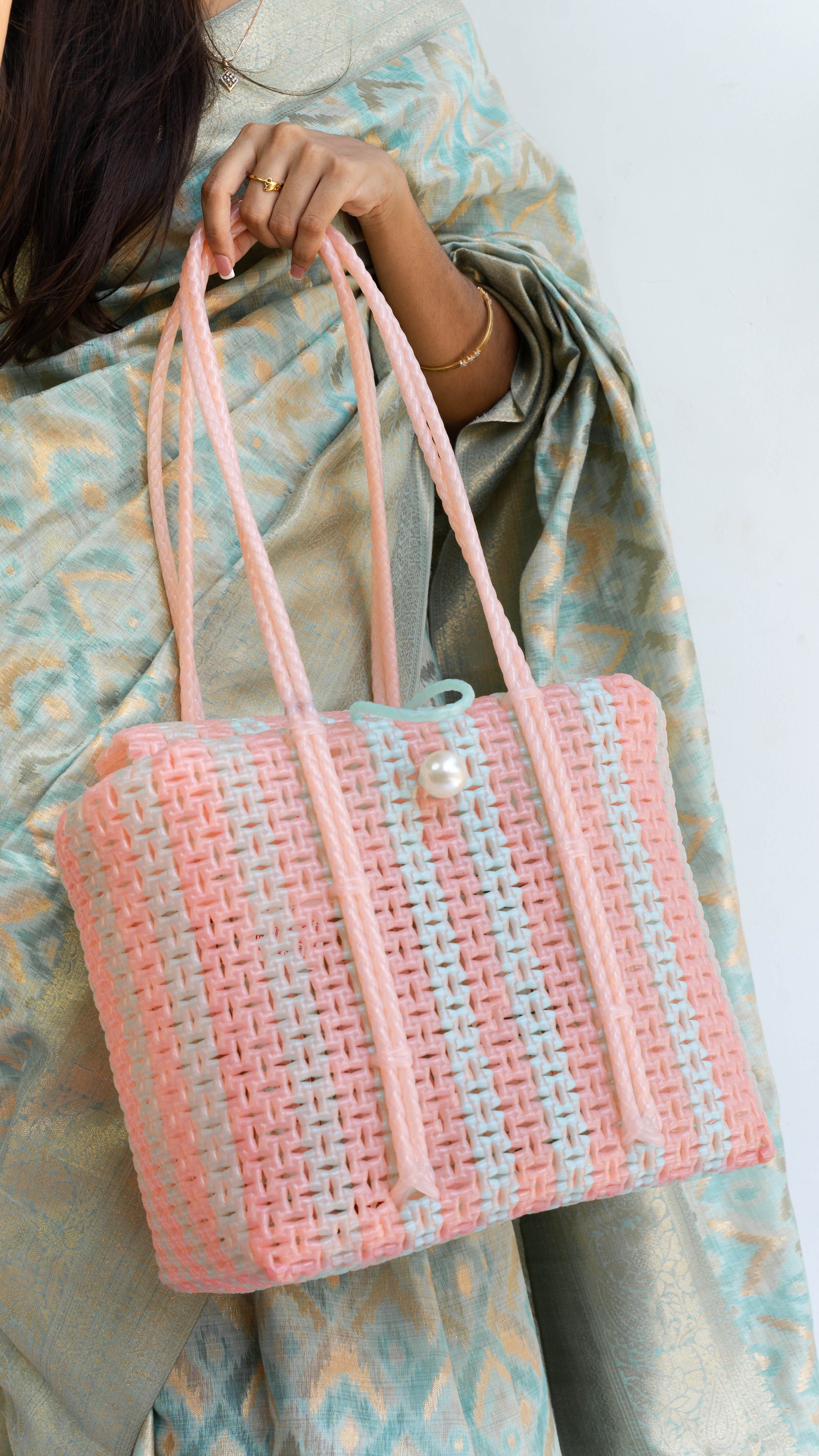 This bag is waterproof and rip-resistant courtesy of its composition. We can't forget that playful pearl embellishment that adds sophistication to the perfect summer accessory. This pastel tote can enhance the simplest outfit, whether you're brunching, headed to a small pooja, or strolling on a sunny day.