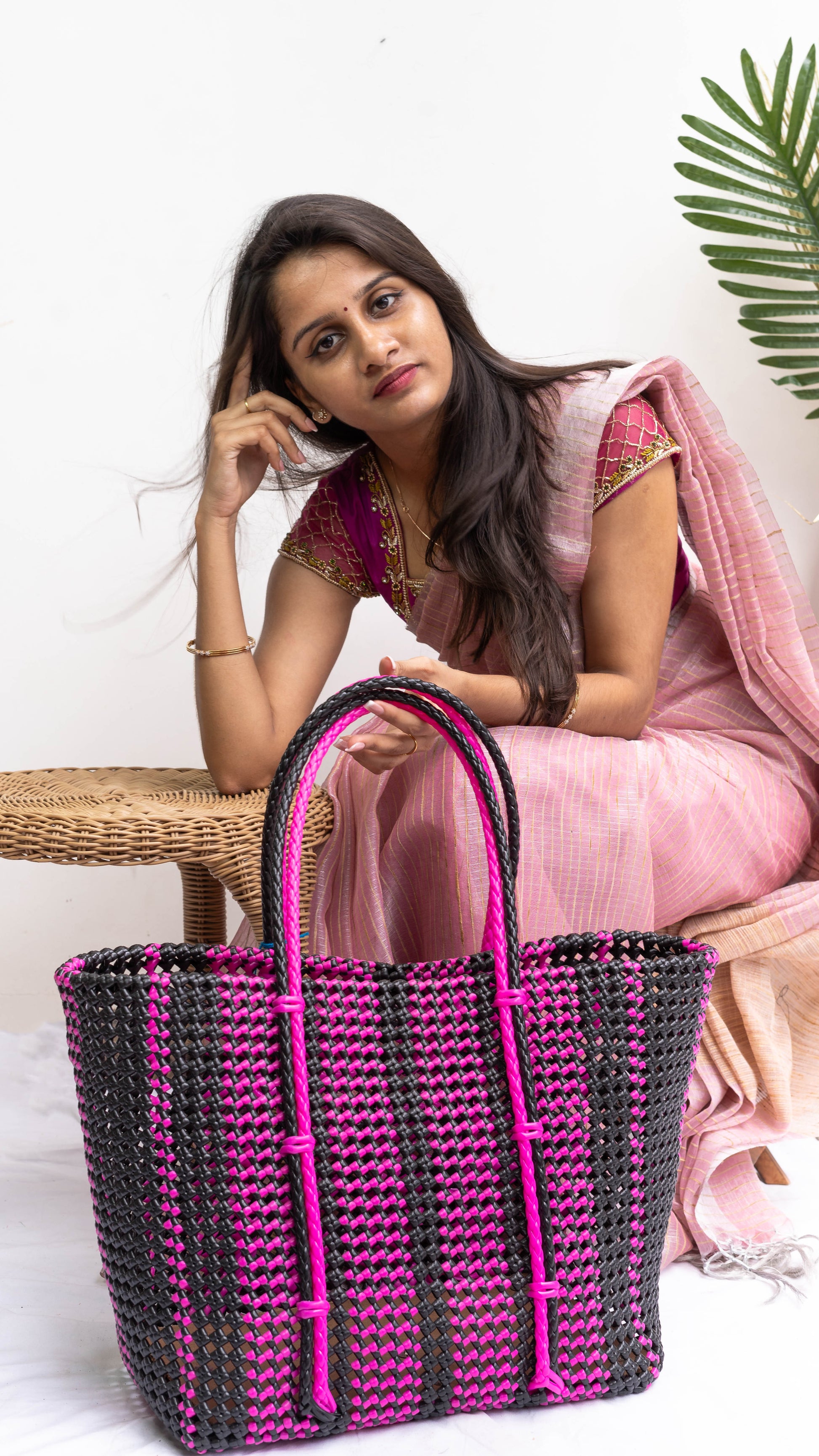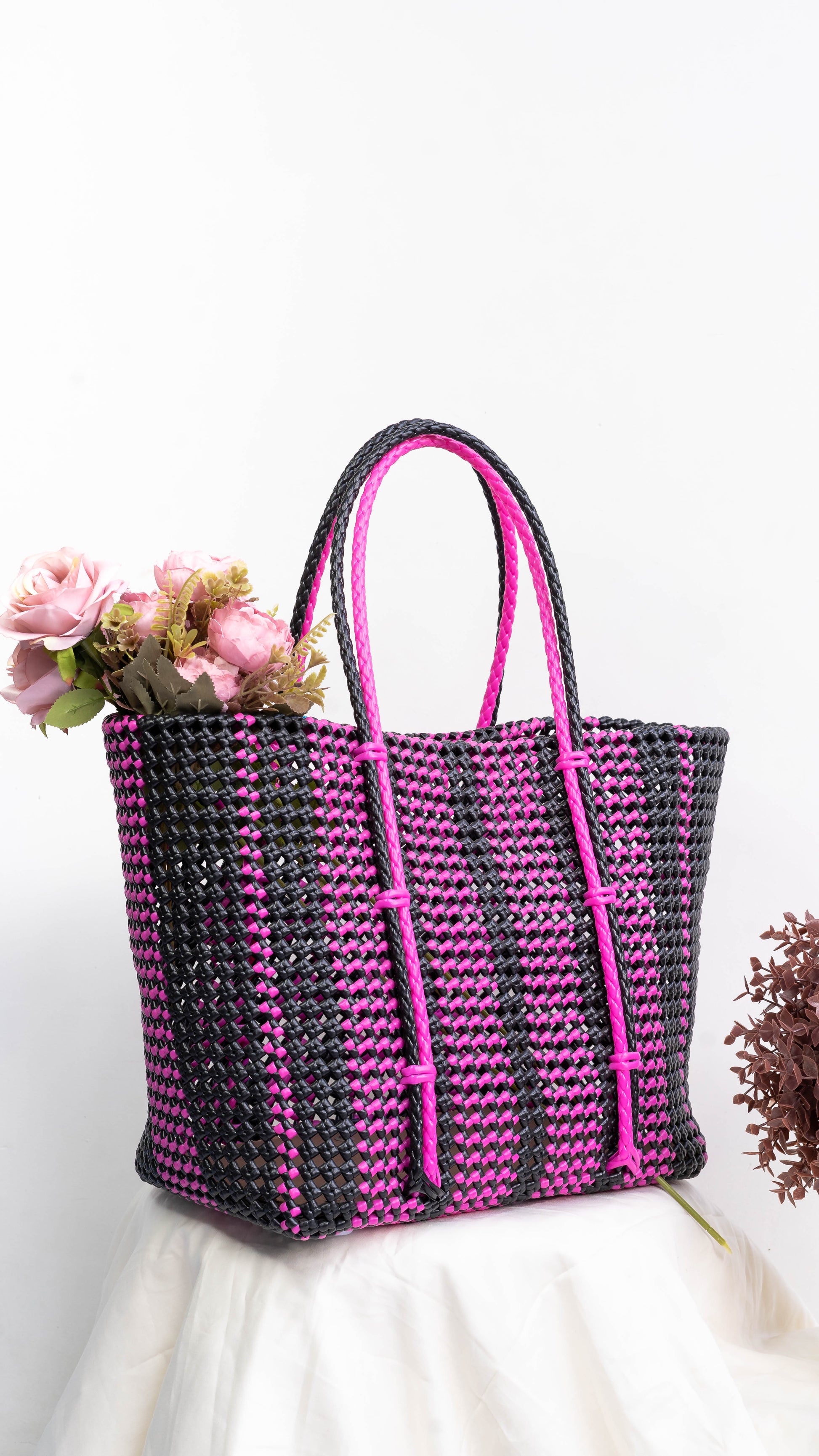 This Pink & Black Wired Extra Large Tote is effortlessly versatile, beautiful, and made to carry it all. The perfect demonstration of traditional craftsmanship with functional design. Hand-woven by artisans using plastic wires into a structure that is flexible, lightweight, yet impressively durable. The combination of Pink & Black creates a bold yet balanced proportion in a very eye-catching detail. The extra large size is perfect for carrying everything you need for your everyday tasks, beach days, shopping-spree or weekend getaways, and is lightweight. This bag is waterproof and rip-resistant courtesy of its composition.
