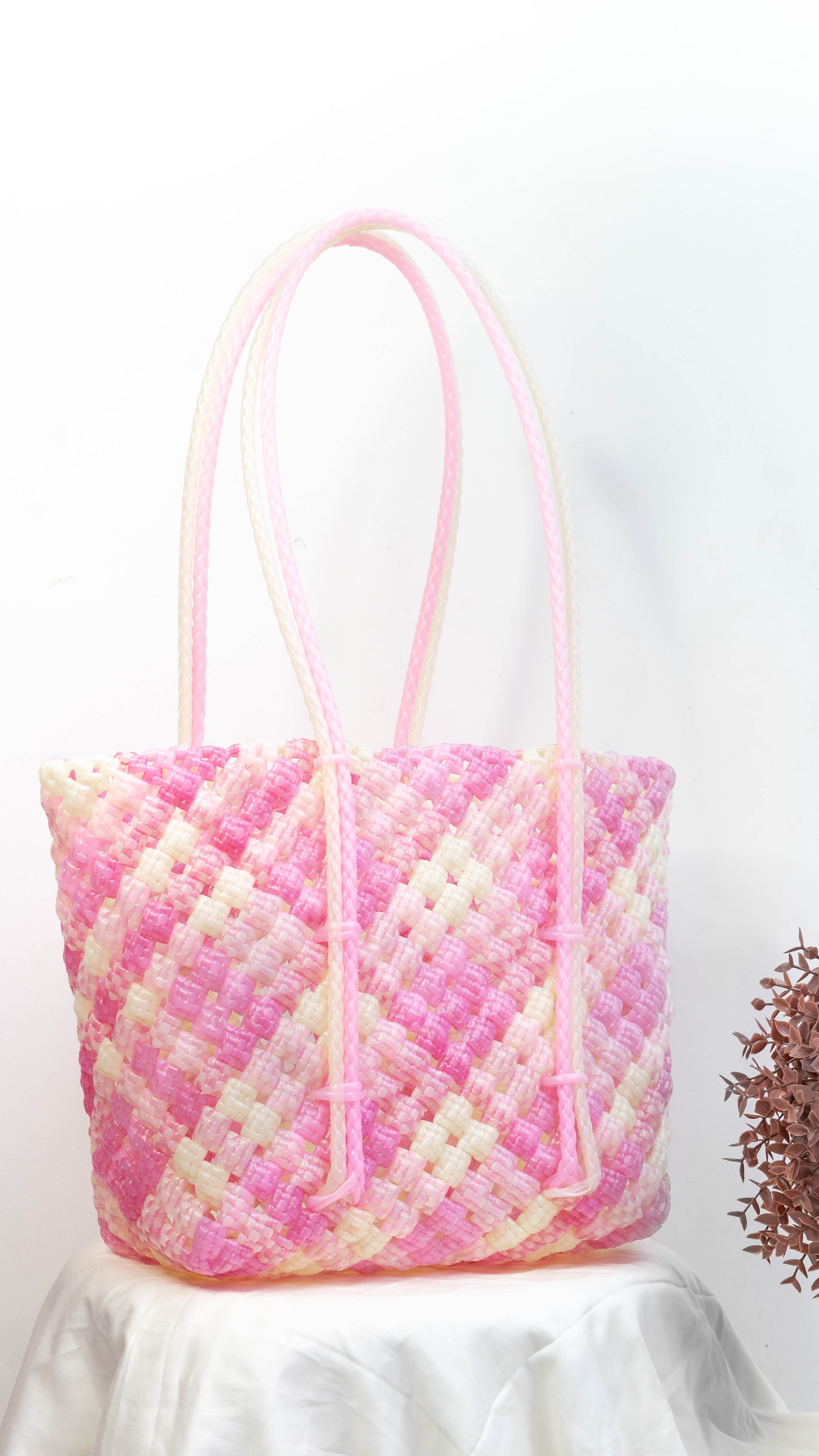 Turn heads with our Pink & White Biscuit Knot basket, which is beautiful and timeless. The artisans from South India are committed to their craft and hand-making the baskets from recyclable, plastic wires. It is a truly timeless beauty, light-weight, and will last for ages. The wires are stitched closely together, which makes a sturdy exterior, and beautifully shaped to form a handbag that carries all of your stuff.