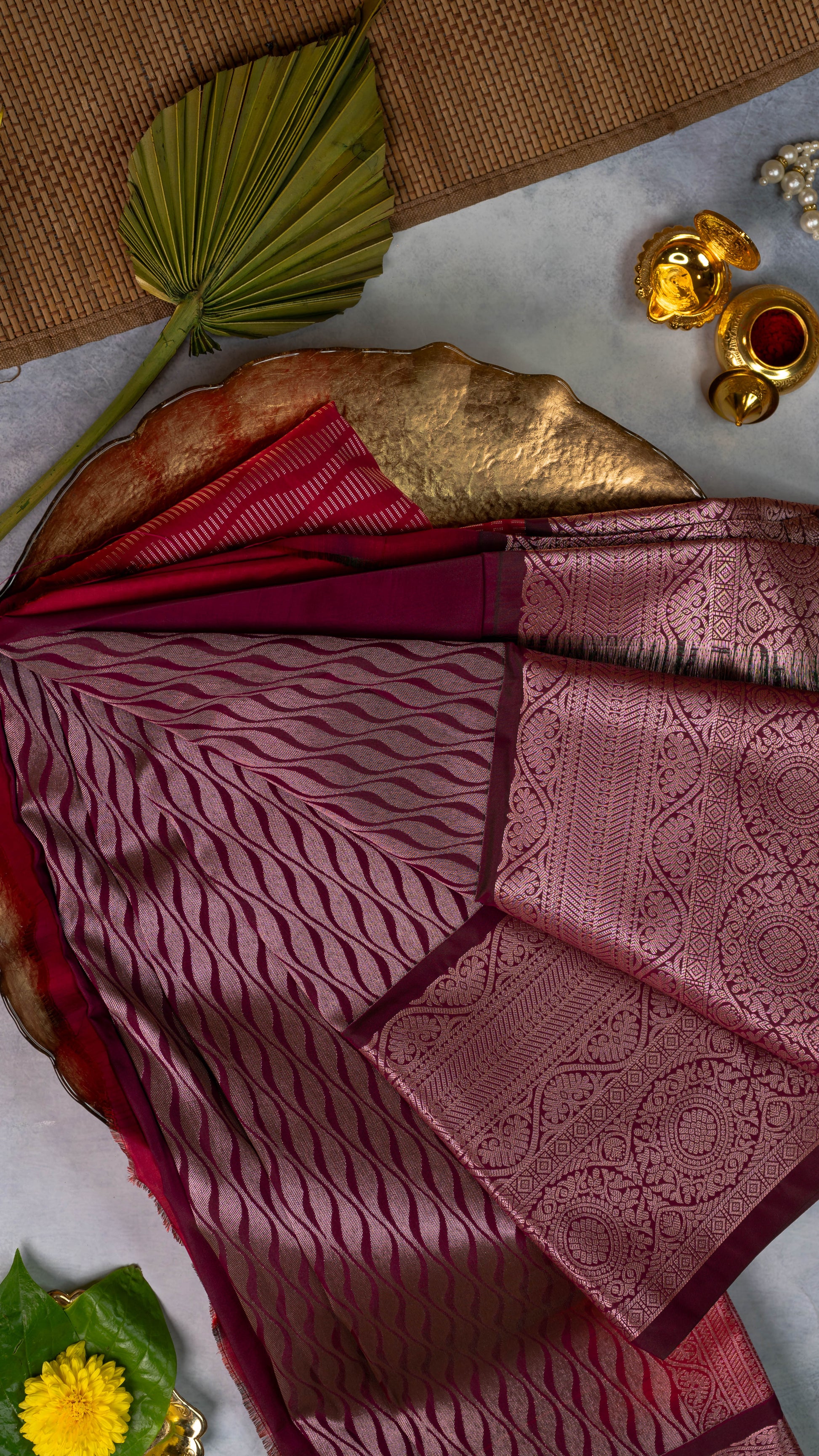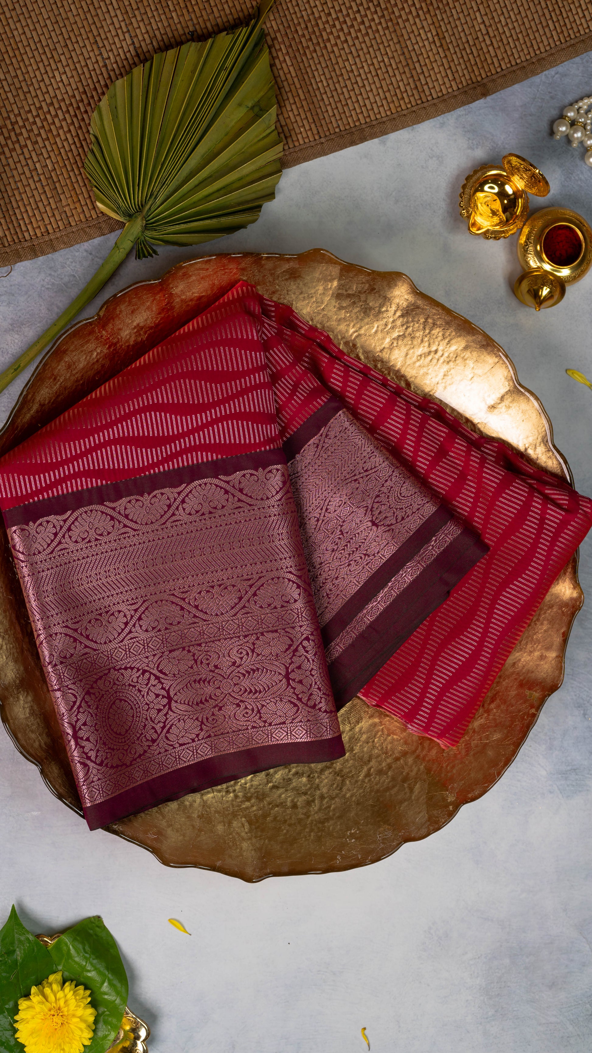 Design: Red body with vertical self-stripes, paired with a grand zari pallu and detailed border