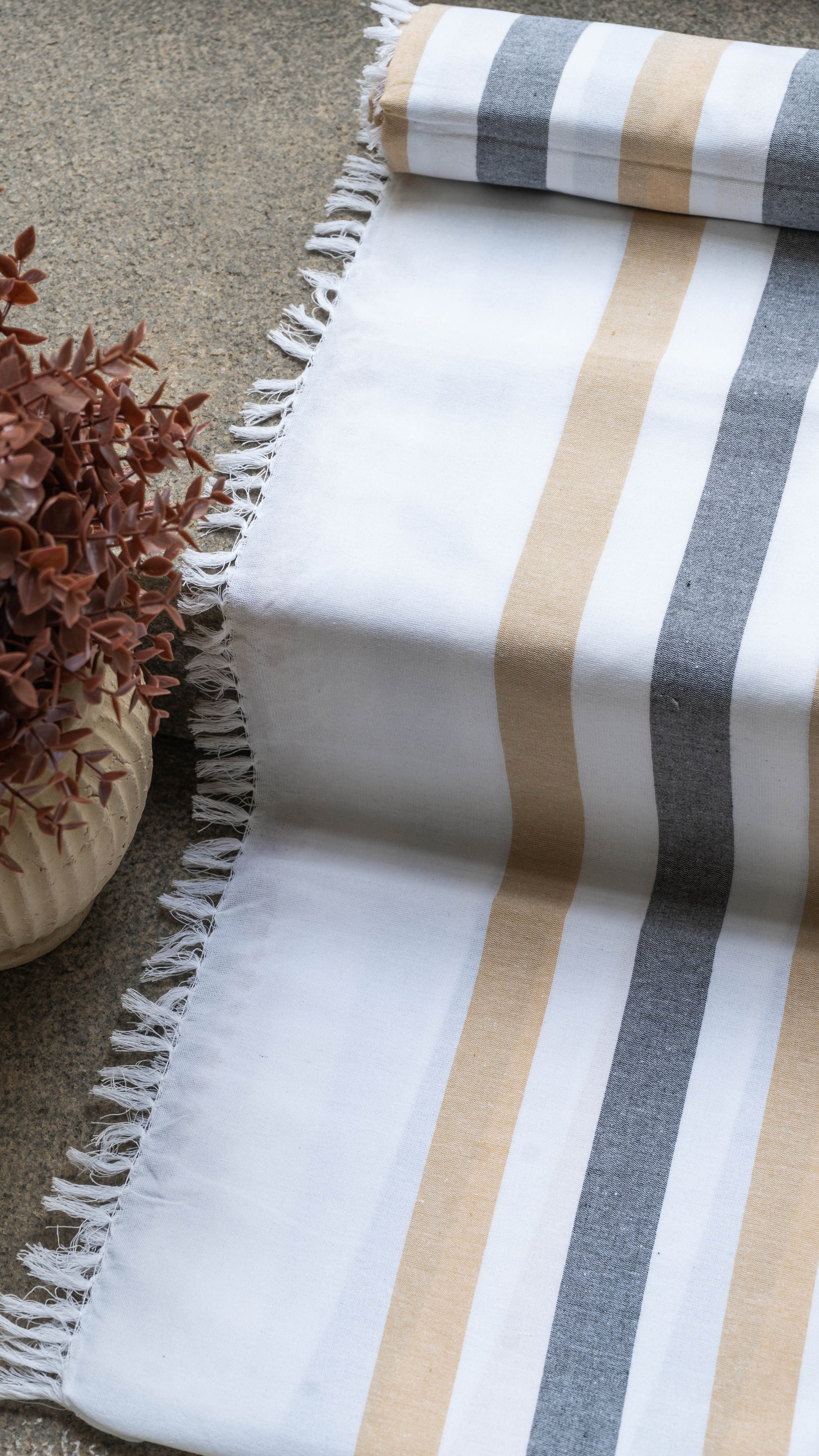 Made from 100% pure cotton, this blanket strikes the perfect balance between softness and durability. Delicate against the skin, breathable, and anti-static in nature, this blanket is the essence of comfort and warmth. Additionally, these blankets are produced from sustainable resources, and carries the ancient charm of Chennimalai, Erode, infused with a splash of fashion and comfort to any surrounding.