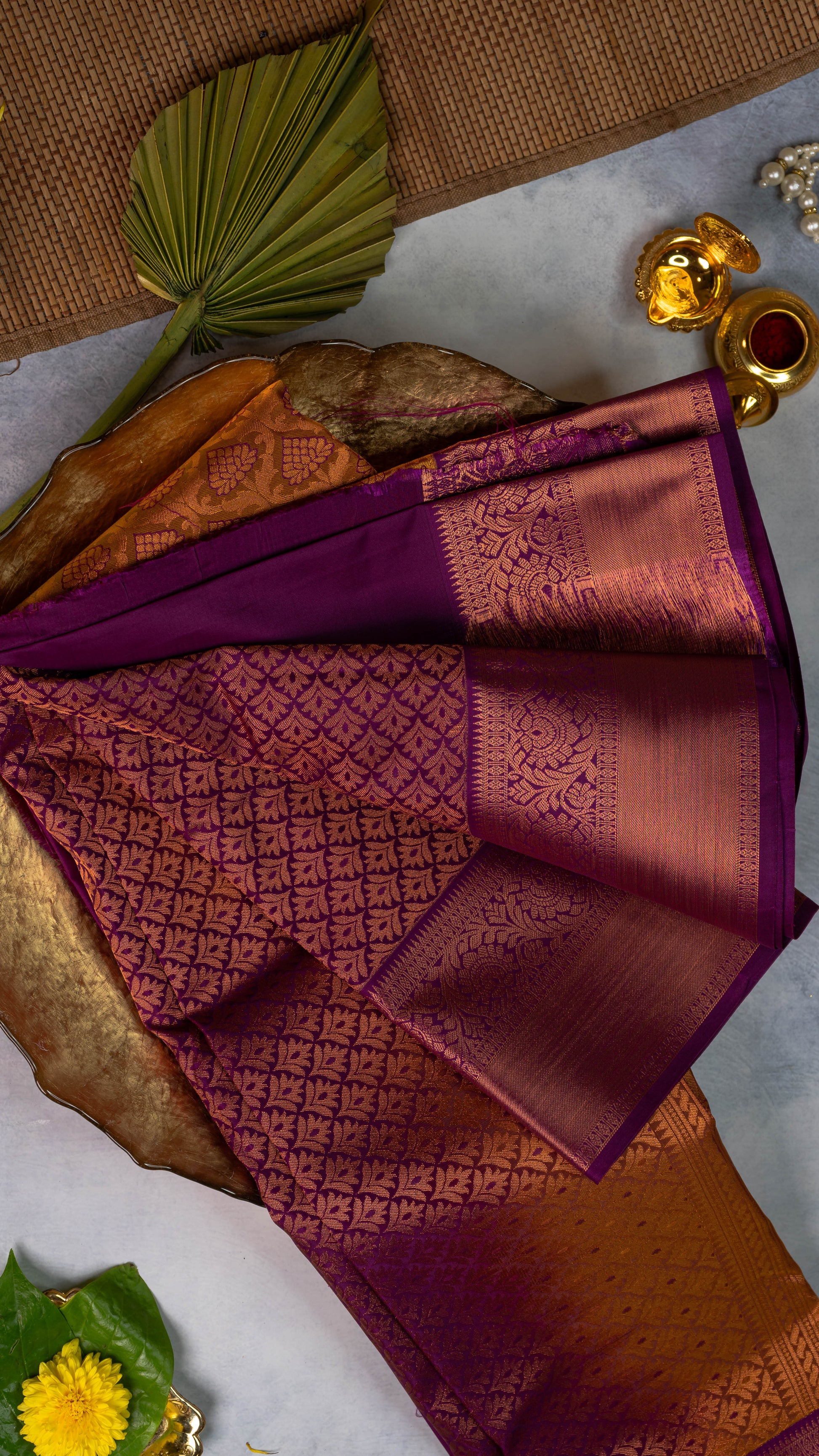 Paired with a matching unstitched plain purple blouse piece with a similar weaved floral Border
