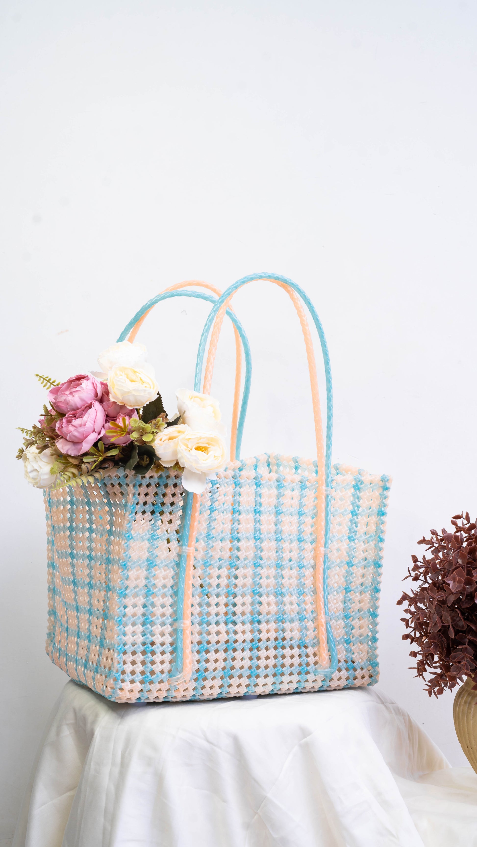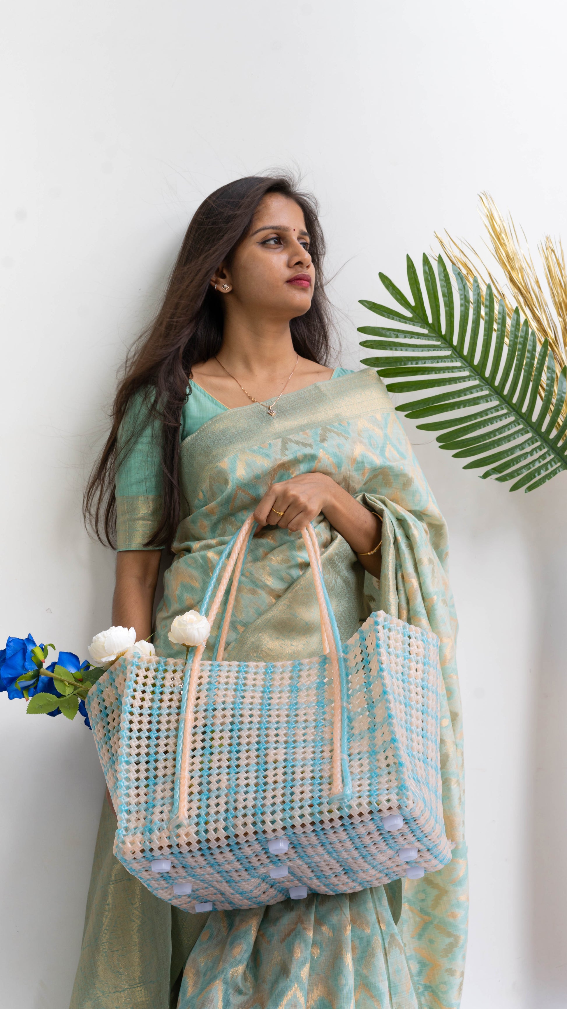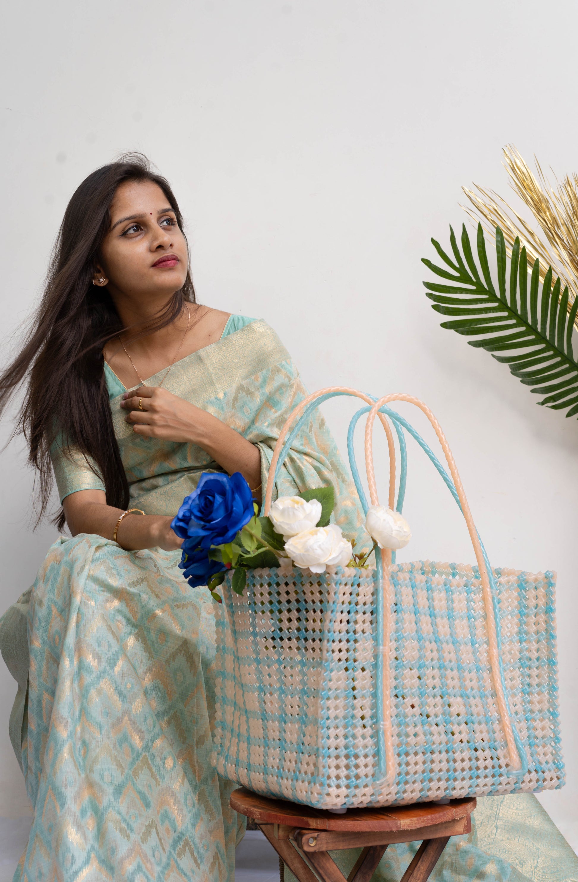 Bring home an expertly crafted handbag made out of eco-friendly, recyclable plastic wires. A colorful Blue & Beige delight in the form of a light and spacious basket that blends together sustainability with style. Unlike conventional yarn knitting, this technique weaves environmentally sustainable plastic wires tightly together in a criss-cross or basket-like style. Resulting in a handbag that is stiff, rigid, and patterned, holding its form.