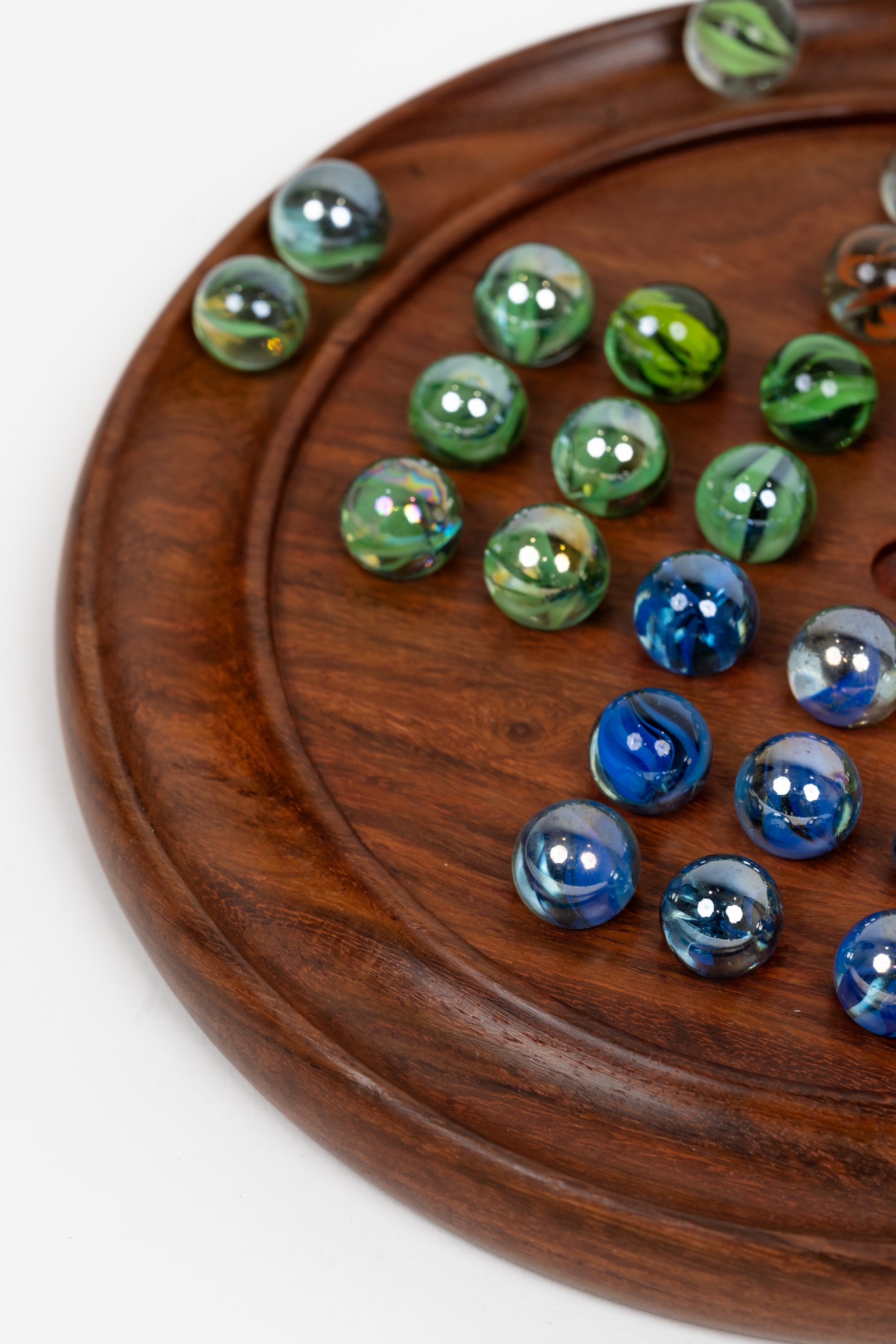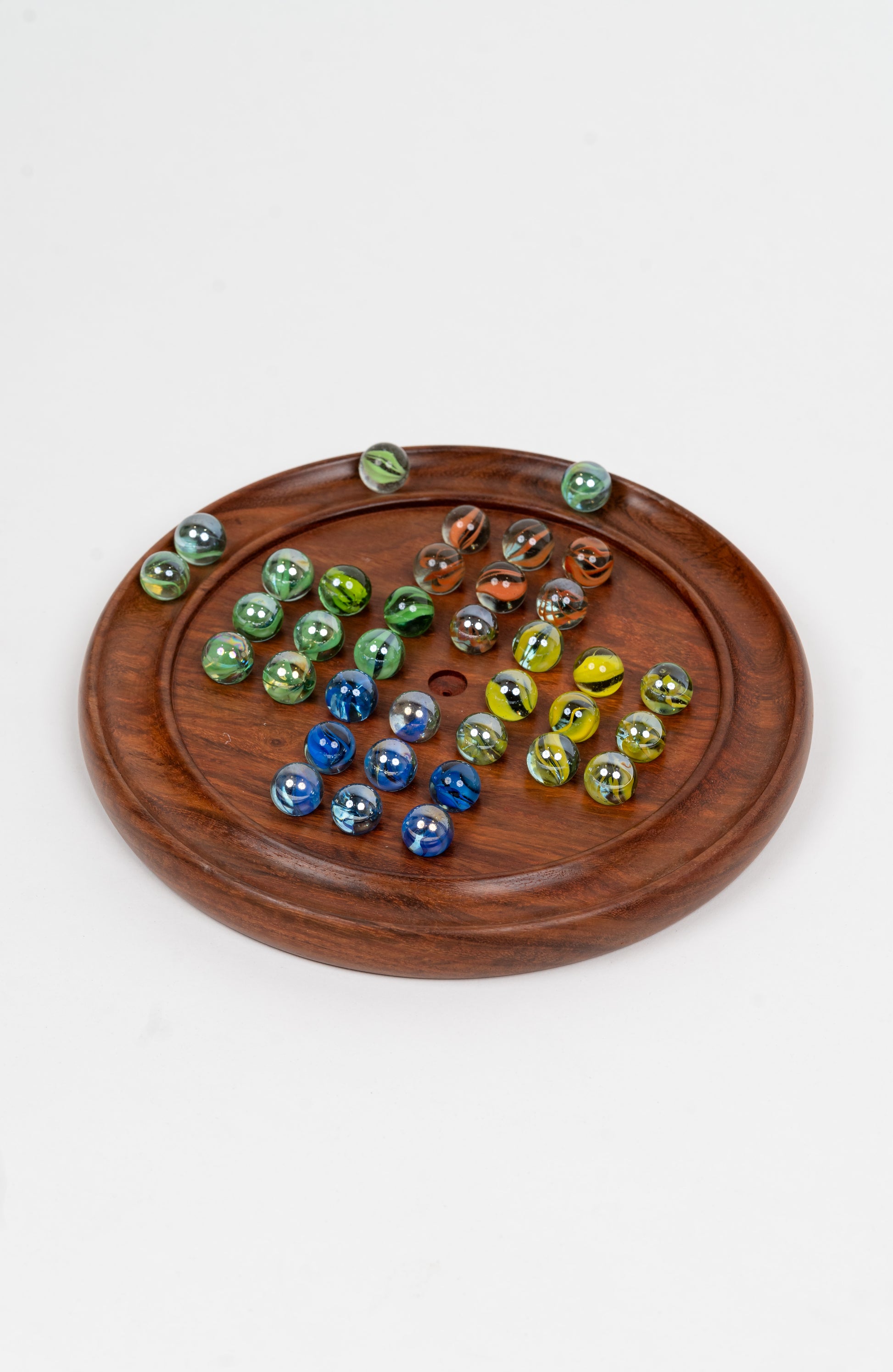 Presenting our Sheesham Wood Solitaire (Brainvita) Game, with multicoloured glass balls. Handcrafted from rich, sturdy Sheesham wood, this game blends tradition and fun while promoting focus, patience, and logical thinking. The colourful marbles draw attention and make it a lovely addition to any playroom or study area.
