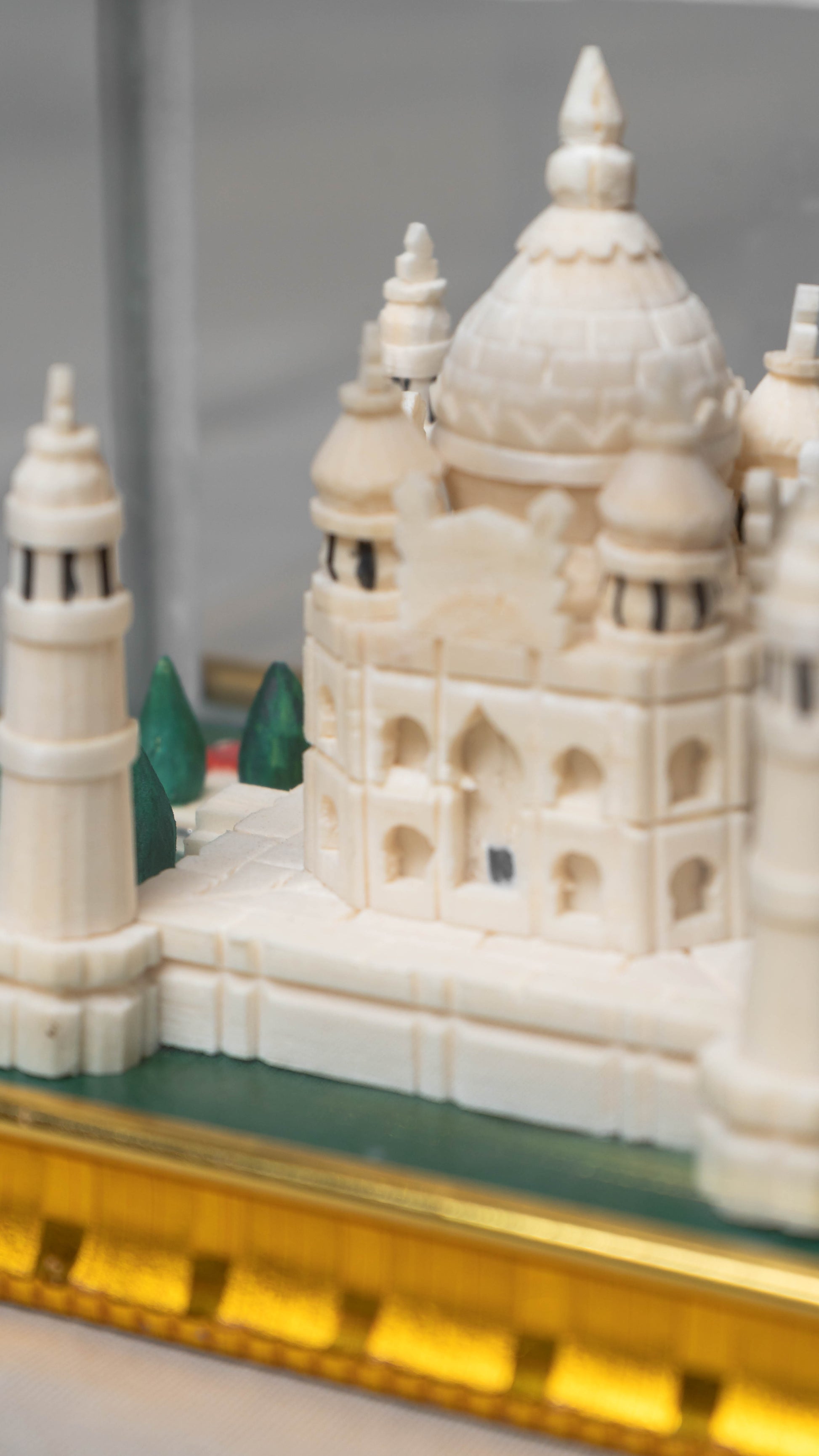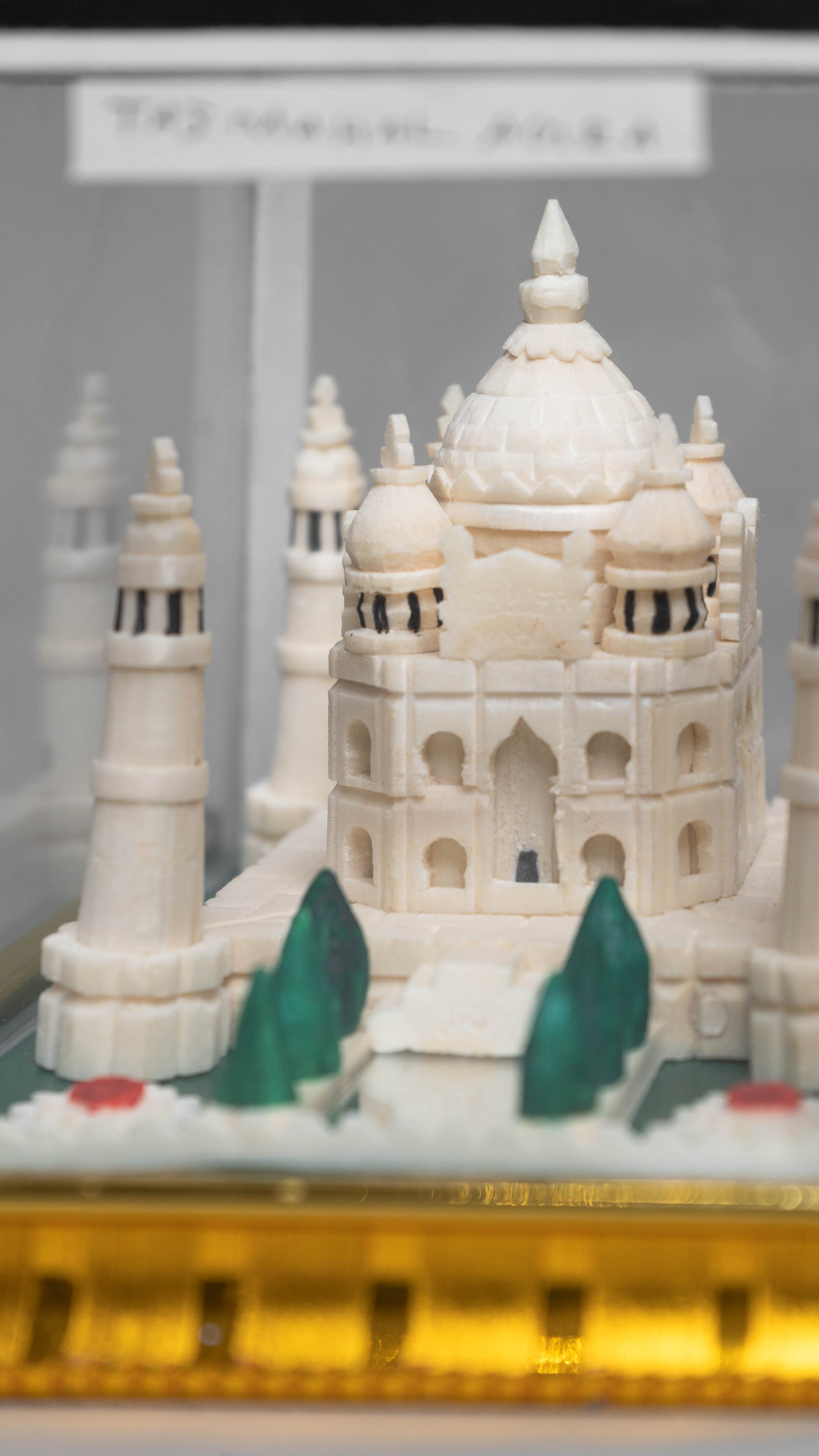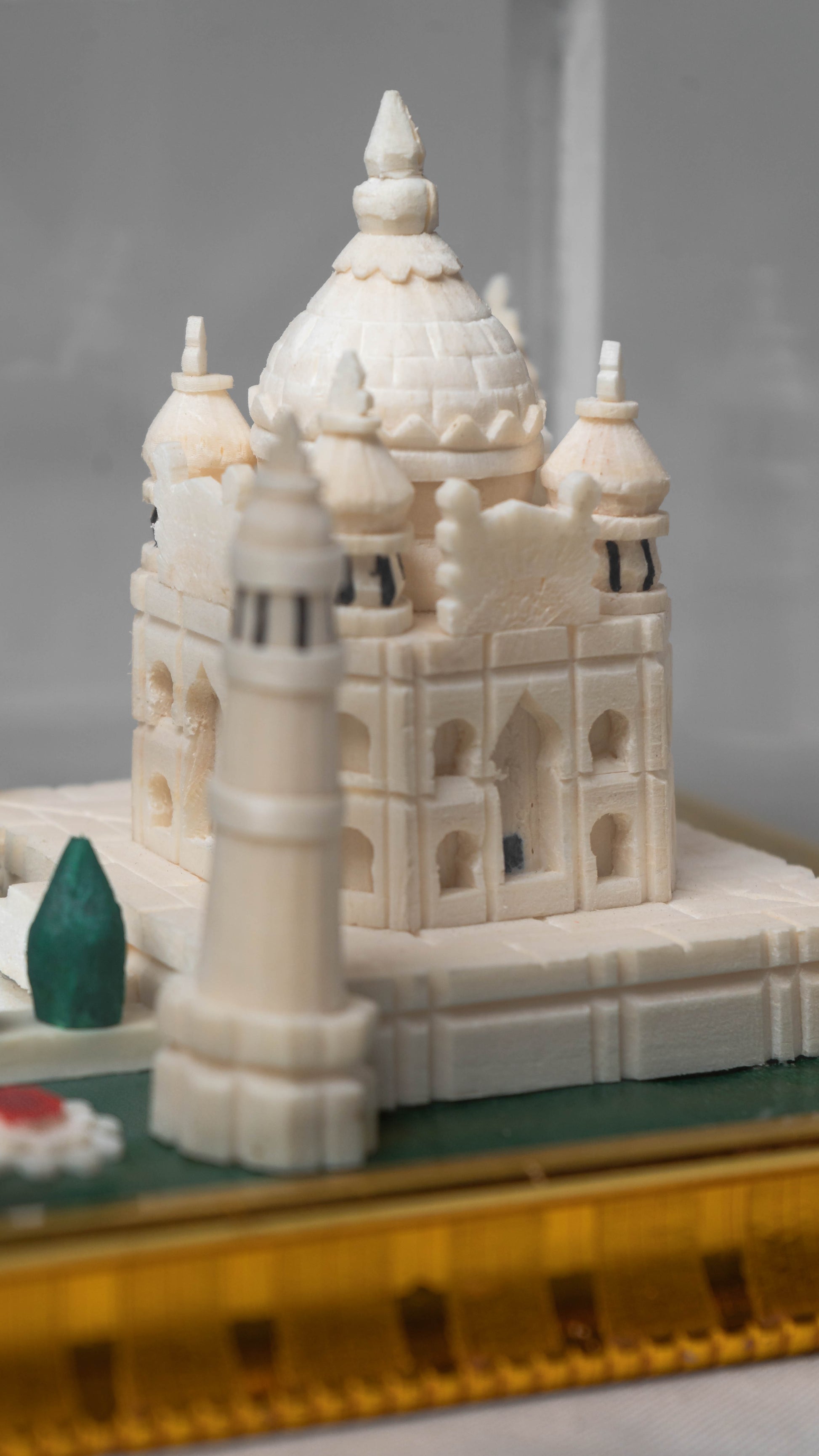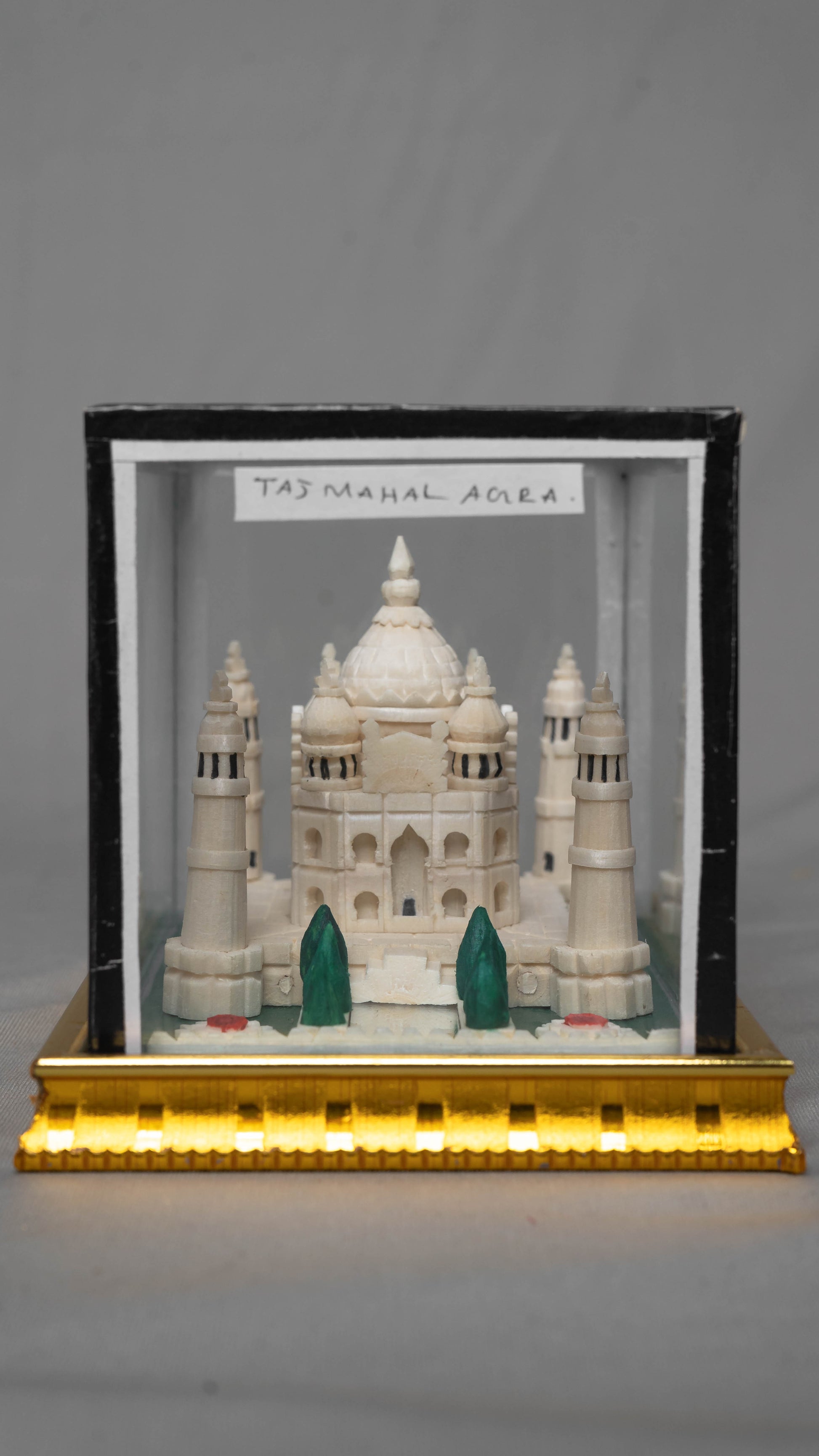 This meticulously handcrafted pithwork model of the Taj Mahal brings the grandeur of one of the Seven Wonders of the World to your home. Made up of lightweight and environmentally sustainable pith, this model showcases the majestic dome, elegant minarets, and delicate carvings that symbolize the eternal love of Shah Jahan and Mumtaz. A wonderful model, encased in a protective glass, for everyone to enjoy in their home decor for years to come.