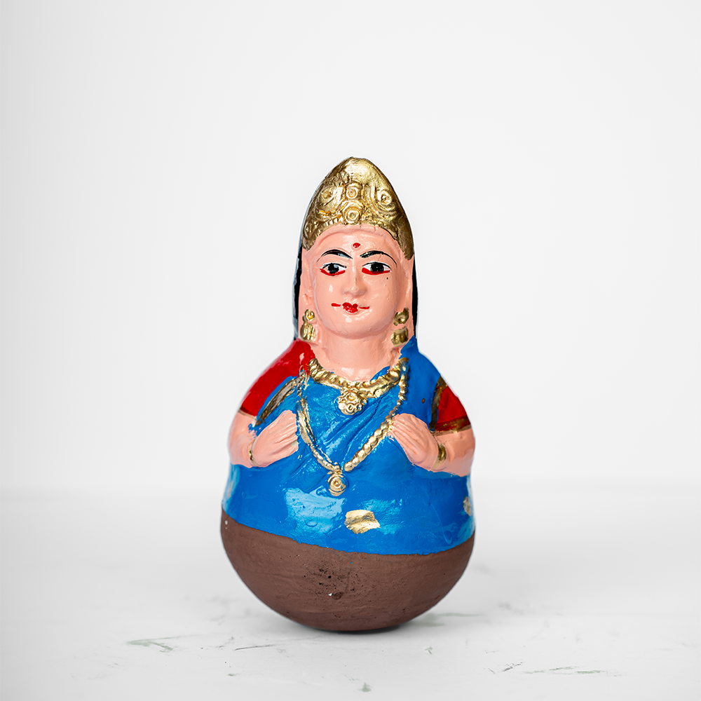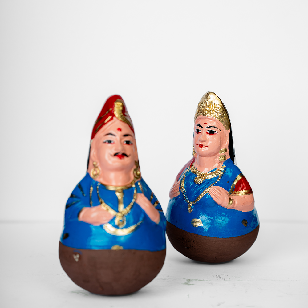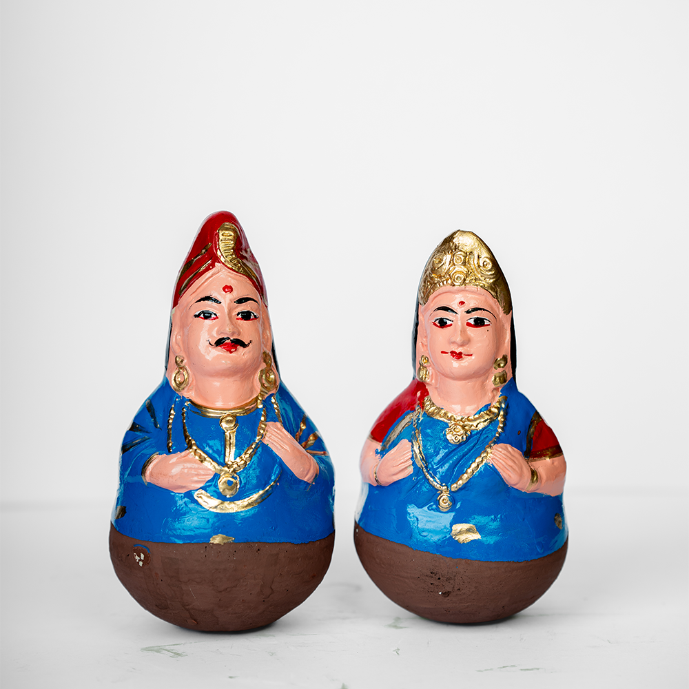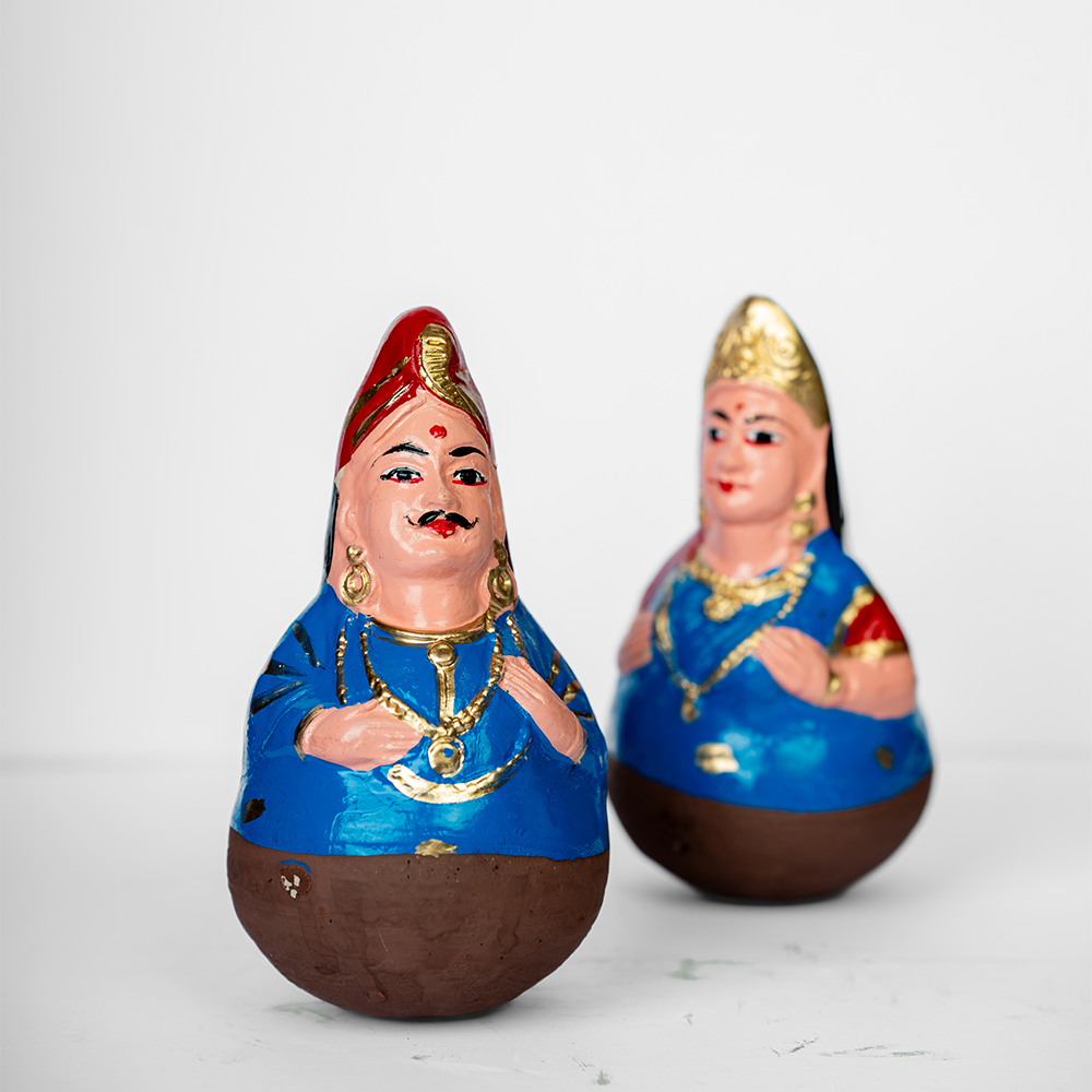 Our Clay Tanjore Dancing Doll comes in a pair, and springs to life in the gentlest breeze or with the slightest nudge. Part of a South Indian tradition that once graced a royal court, these dolls are now treasured as display pieces during Navratri, called "Golu", and are said to bring happiness, fortune, and prosperity.