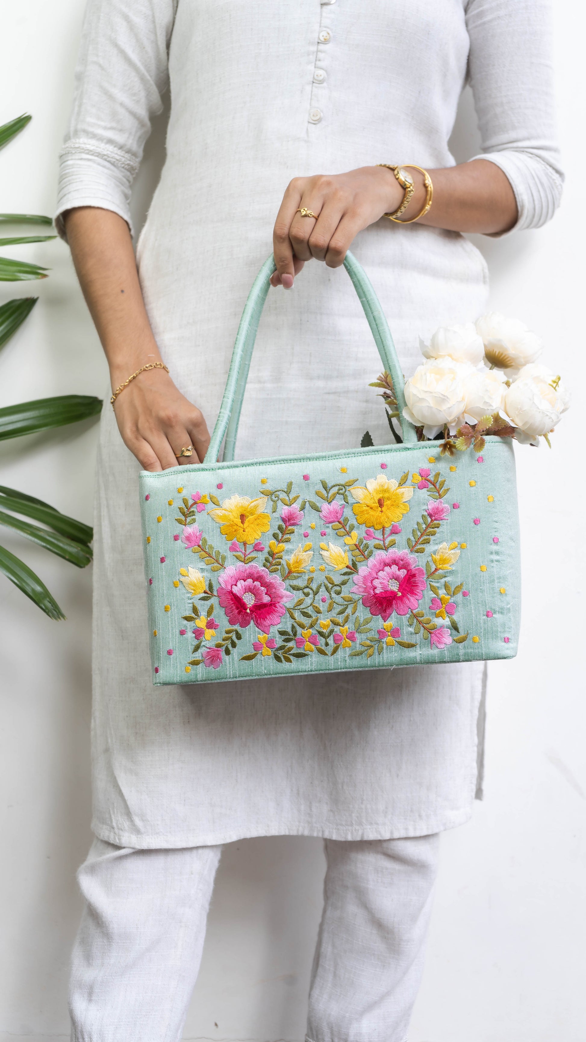 The calmness of our beautiful Turquoise Hamper Bag featuring hand-embroidered birds is bound to add elegance and charm to any occasion you bring it to. Made with high-quality silk fabric, this unique bag reflects nature's beauty, a combination of rich craft and visual serenity. Whether you are organising a baby shower, a festive event, or a nature-inspired event, it adds a beautiful touch to every detail.