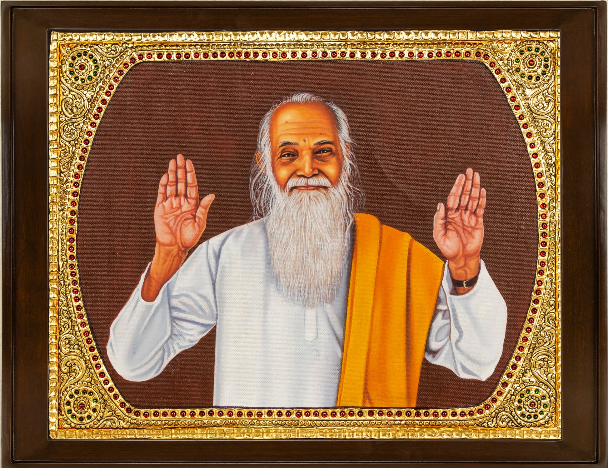 In this magnificent artwork of Vedatri Maharishi, in his peaceful and meditative posture, he represents the internal peace we all want to have in our lives. This beautiful art piece is in the Tanjore style, it's hand-painted in bright colours, enhanced in genuine 22K gold foil, and framed in high-quality teak wood - radiating a divine essence.