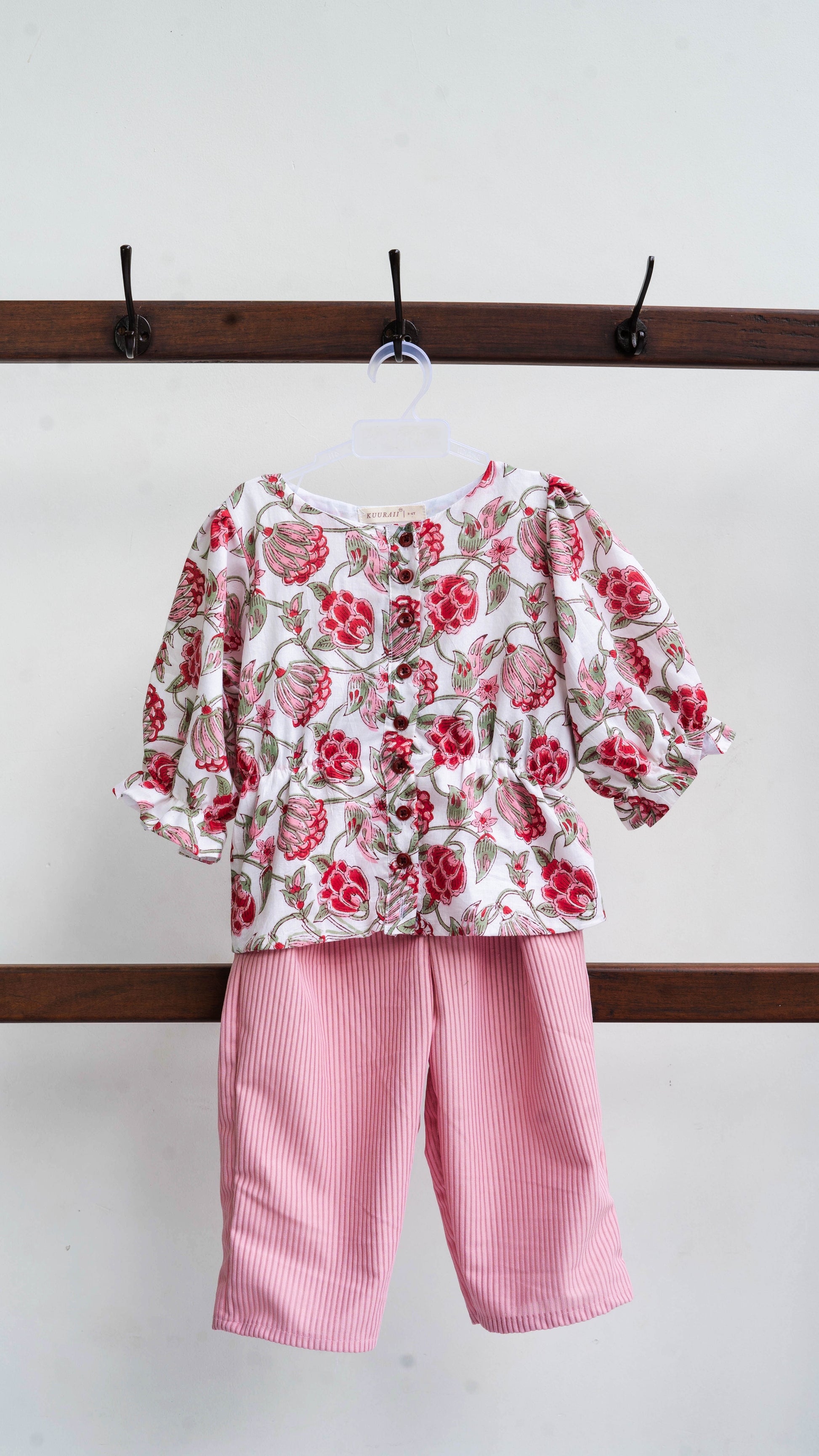 Dress your cutie in adorable style with our White and Pink Floral Printed Cotton Co-ord Set. With a lovely white top with a stunning pink and green floral print, accompanied by relaxed light pink striped trousers, this cute two-piece is ideal for building sweet and trendy outfits. The gathered waist and ruffled cuffs on the sleeves of the top provide a little extra sweetness.