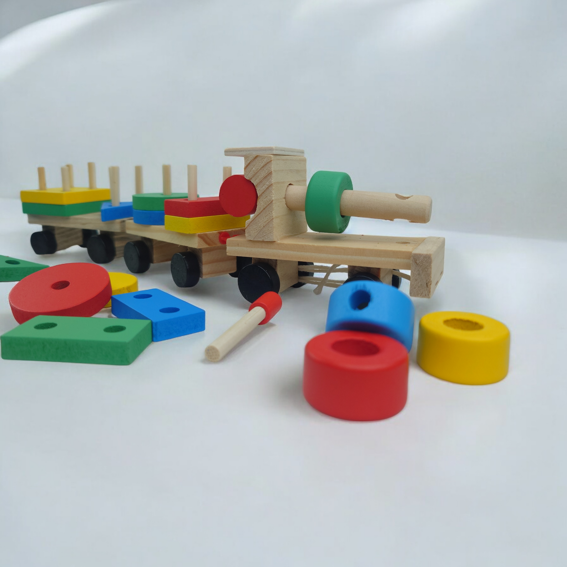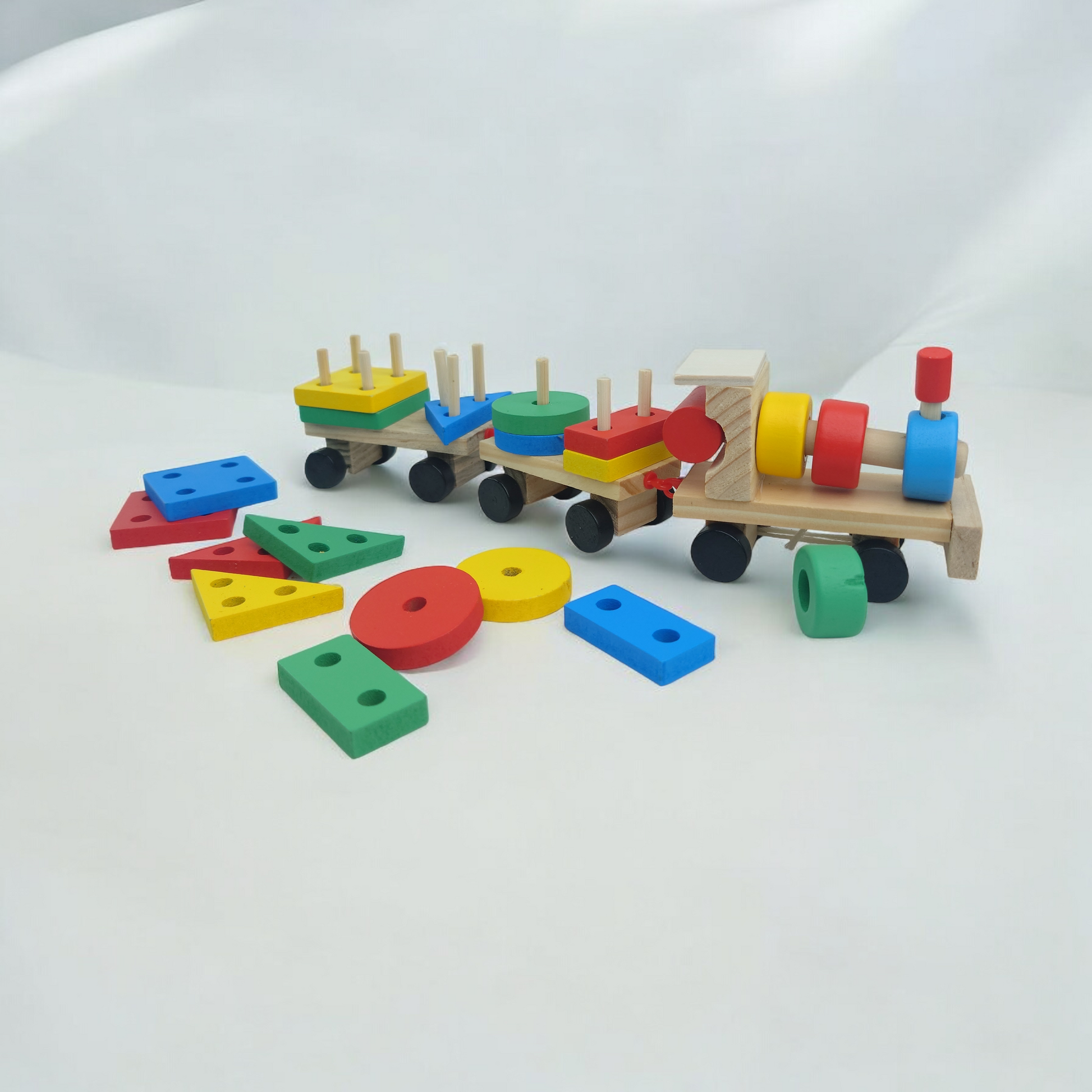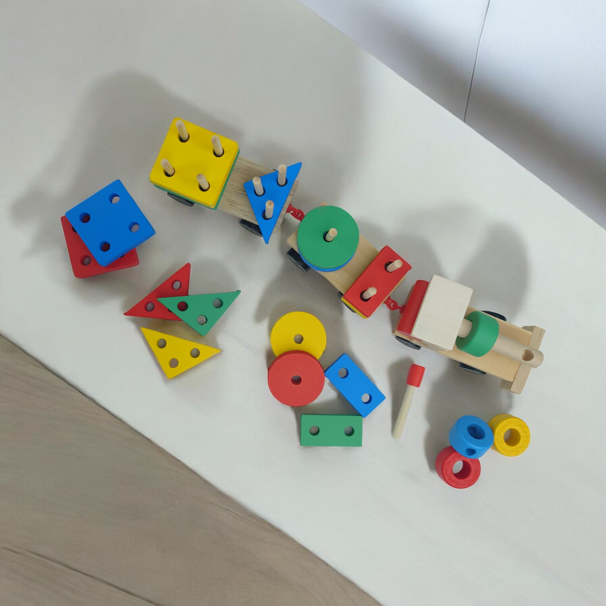 - ✔PACKAGE CONTENT- Includes 1 train engine, 2 carts and 20 wooden blocks of varying shapes and sizes; Approx. 15.5*4.2*2.1 inches