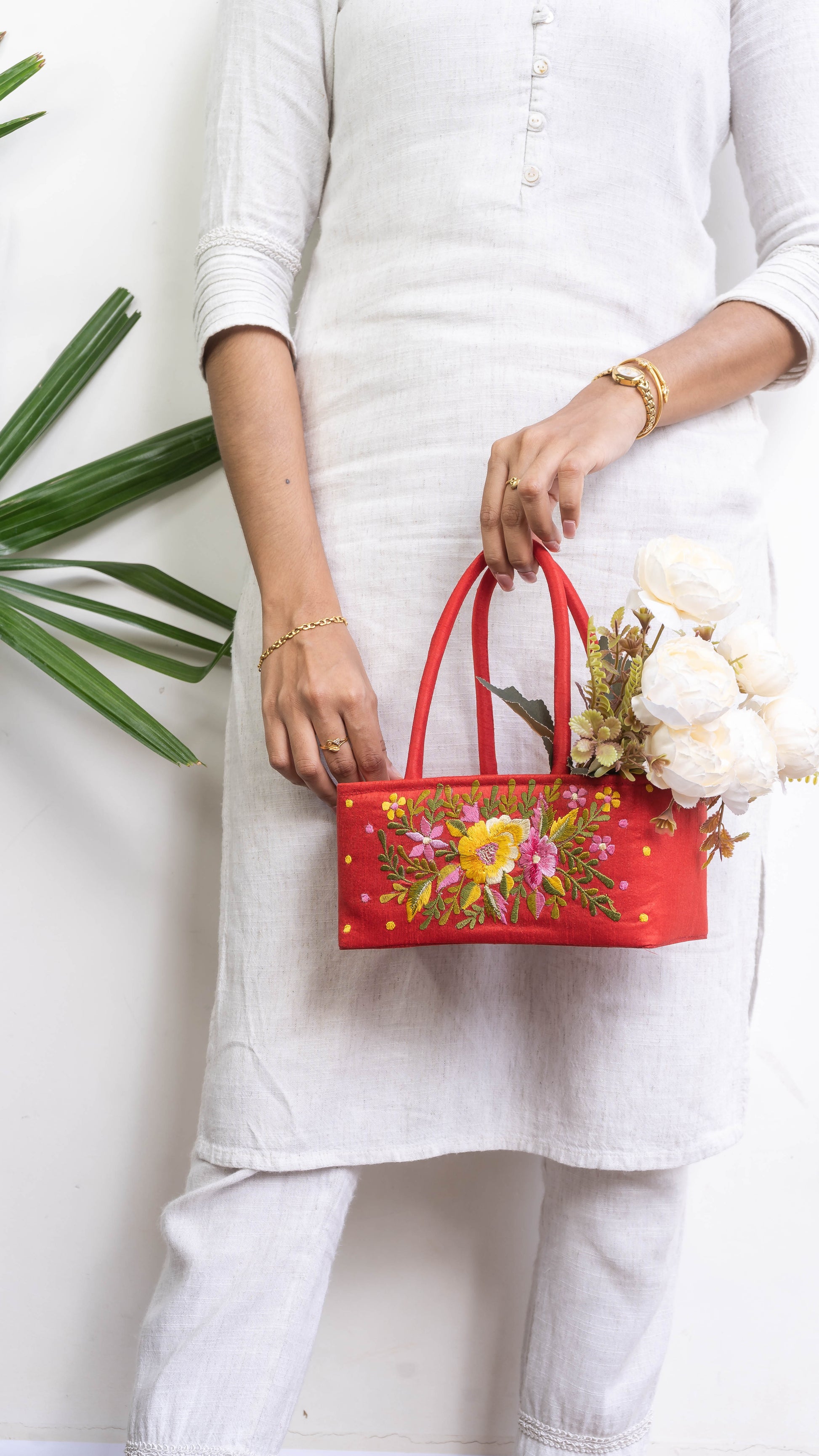 Bring some love and happiness to your festivities with our beautiful red embroidered bag, crafted with a premium quality silk bag, hand-sewn with floral embroidery. Red symbolises love and celebration, and will make the perfect accessory to gift or style in your home. This beautiful hamper bag is designed to bring warmth and beauty to what you choose to gift or use the hamper for.