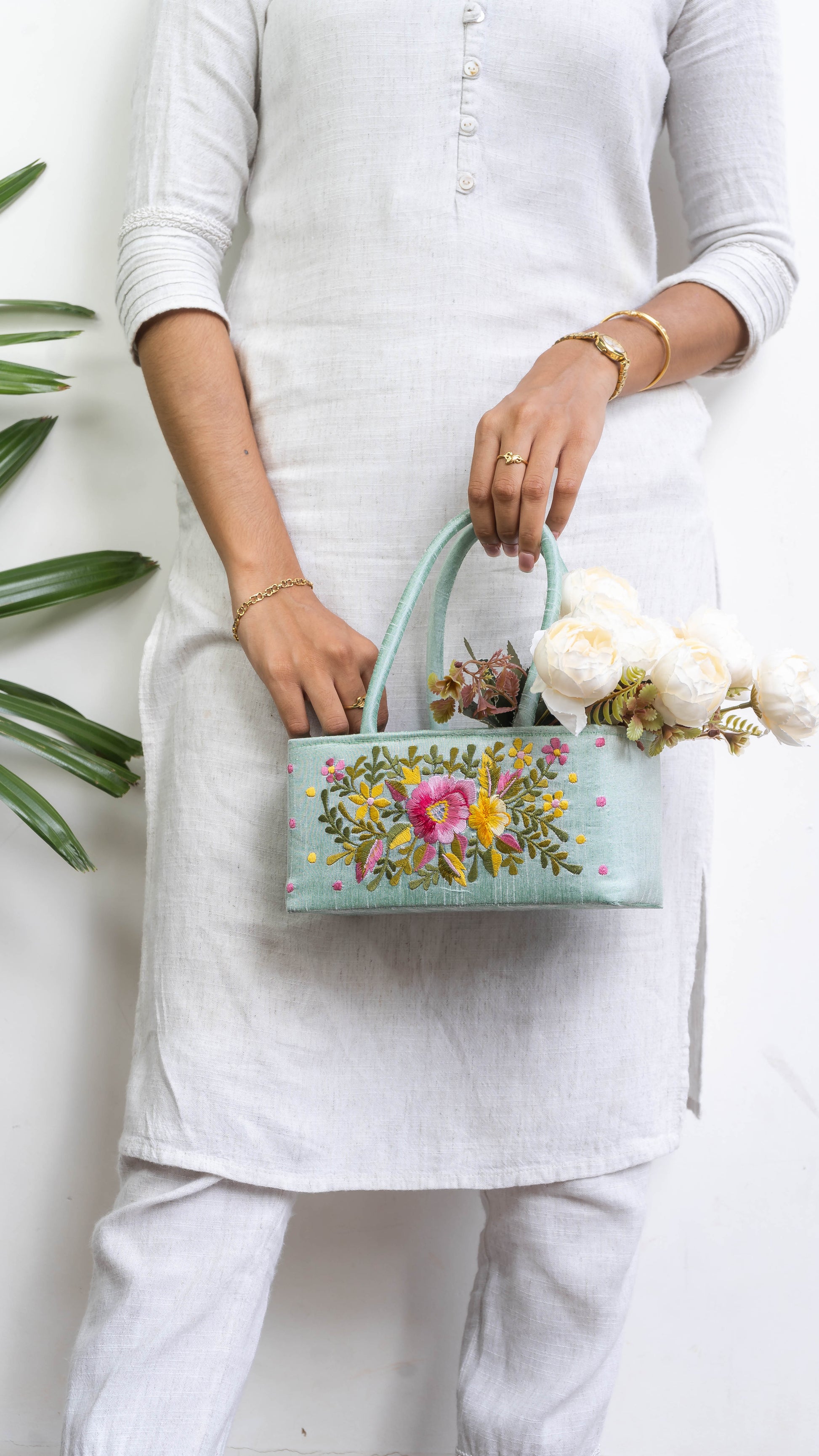 The calmness of our beautiful Turquoise Hamper Bag featuring hand-embroidered birds is bound to add elegance and charm to any occasion you bring it to. Made with high-quality silk fabric, this unique bag reflects nature's beauty, a combination of rich craft and visual serenity. Whether you are organising a baby shower, a festive event, or a nature-inspired event, it adds a beautiful touch to every detail.