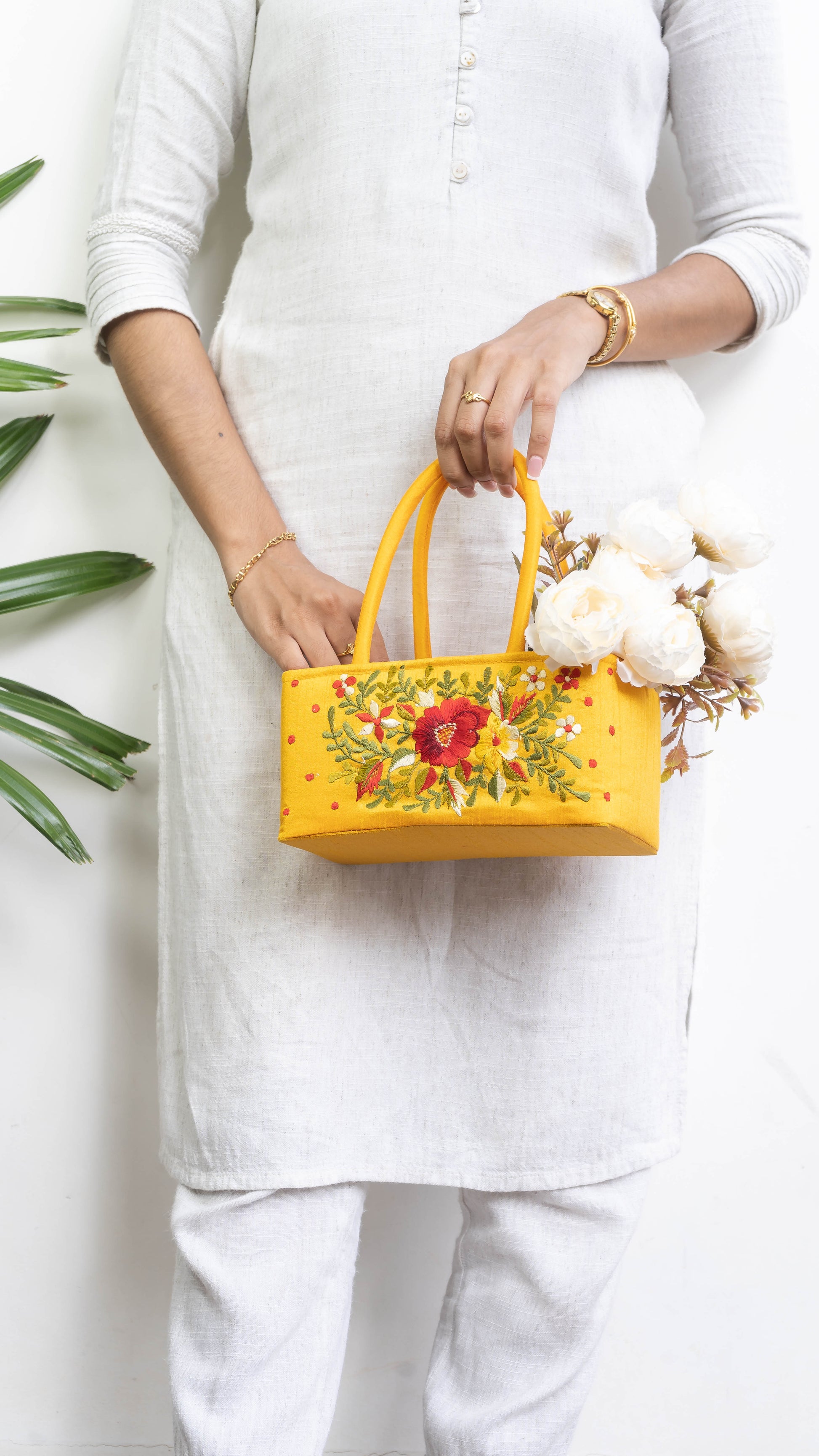 Allow your gifts to shine with our Yellow Embroidered Hamper Bag. Made out of beautiful fabric. Premium silk fabric, with delicate hand-sewn embroidery, this bag can brighten anyone's day. The cheery yellow expresses warmth and positivity, which is what we all crave around the holidays. It also complements a festive vibe, making every breakfast, lunch, brunch, dinner, or joyous occasion turn into a celebration.