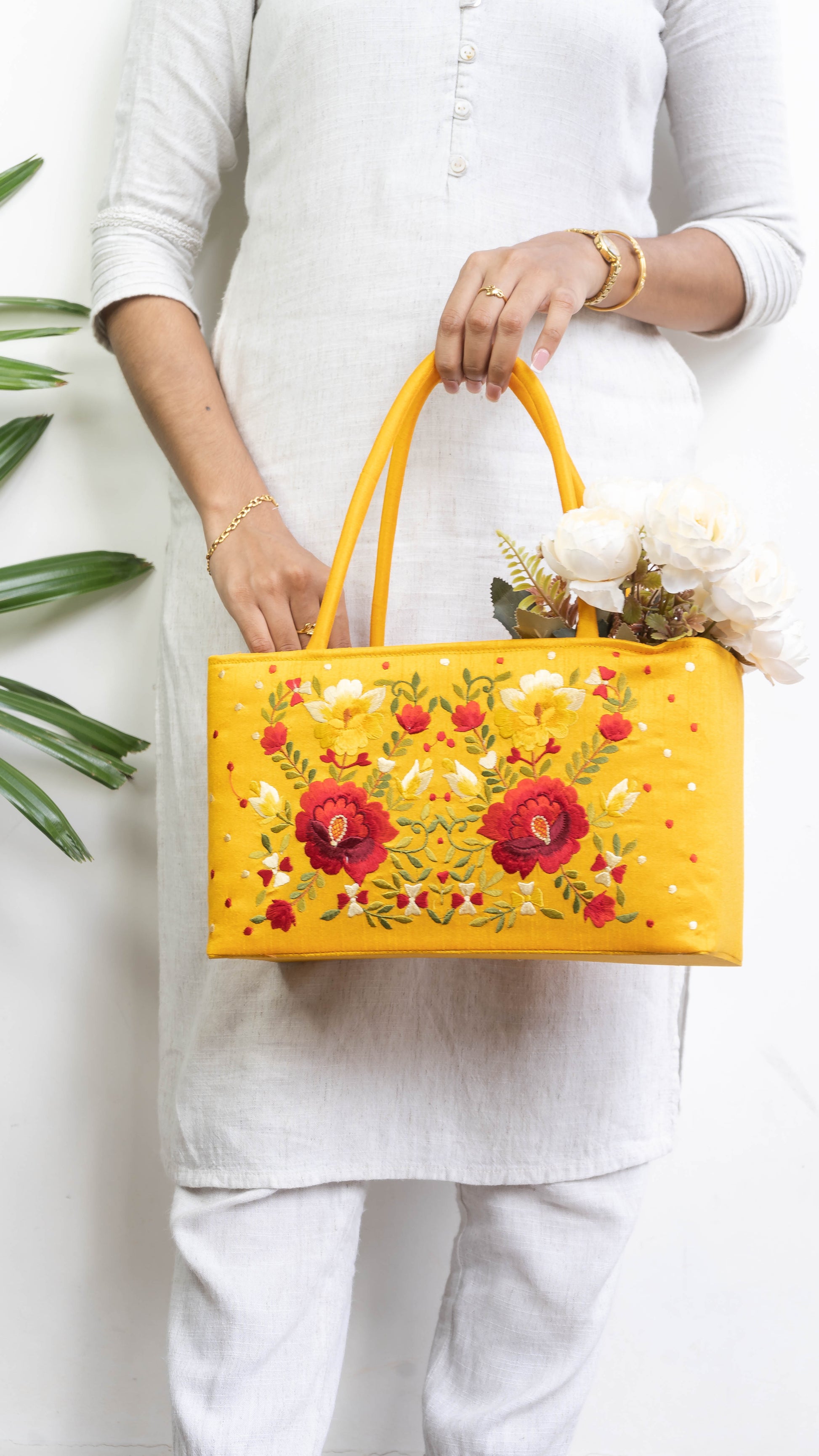 Yellow Hamper Bag With Red Flowers - Medium