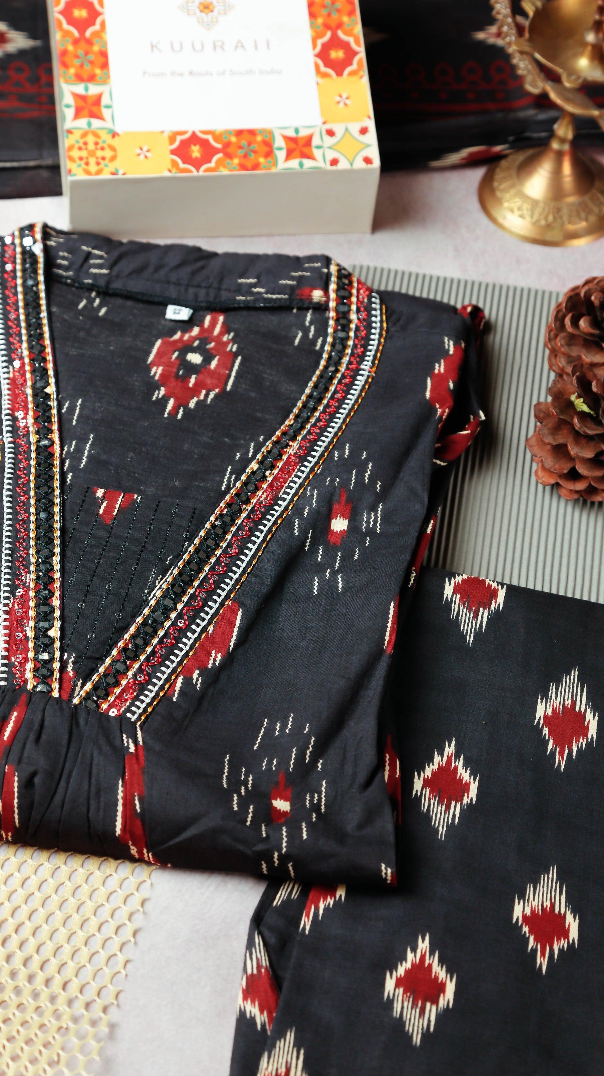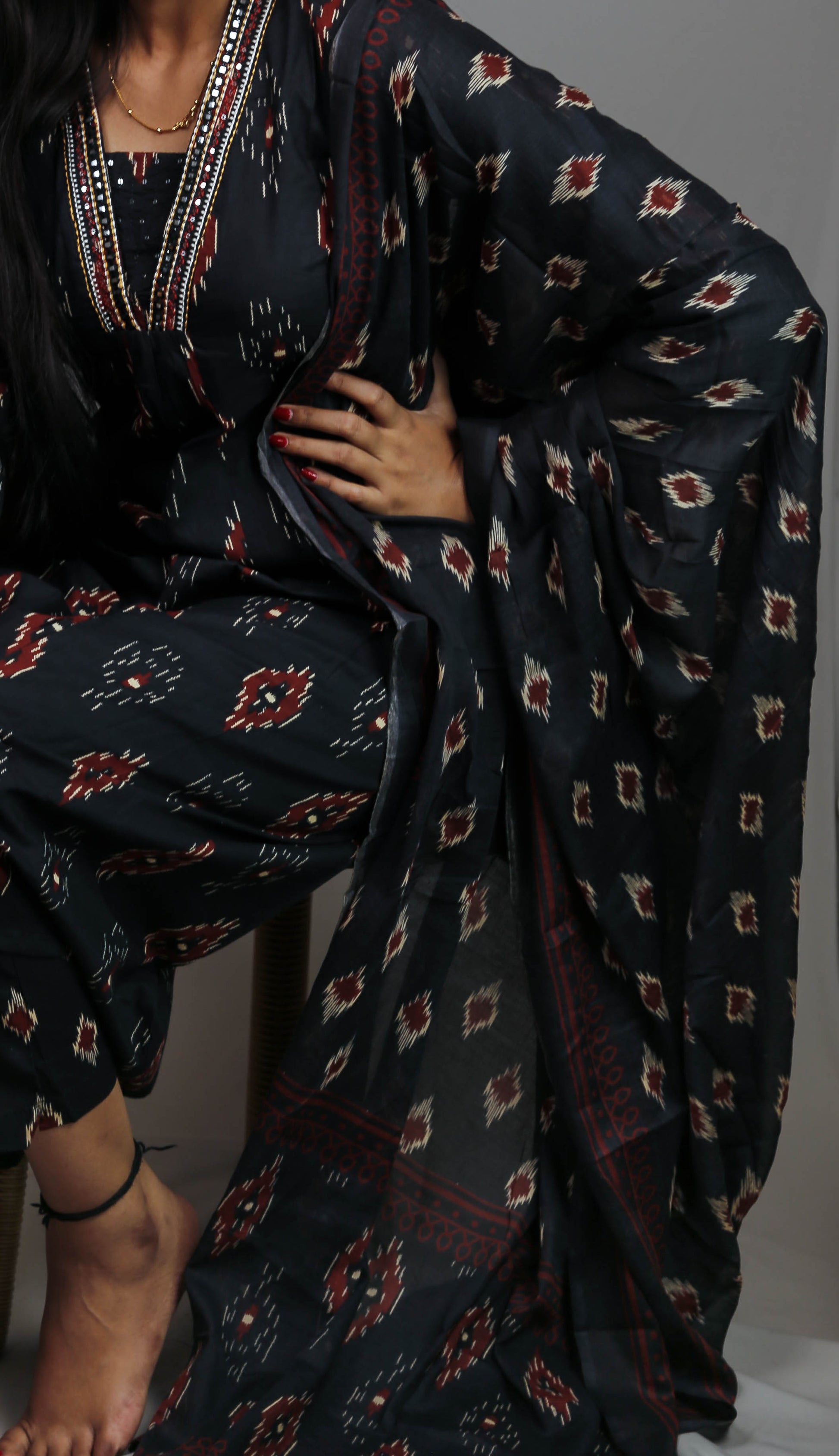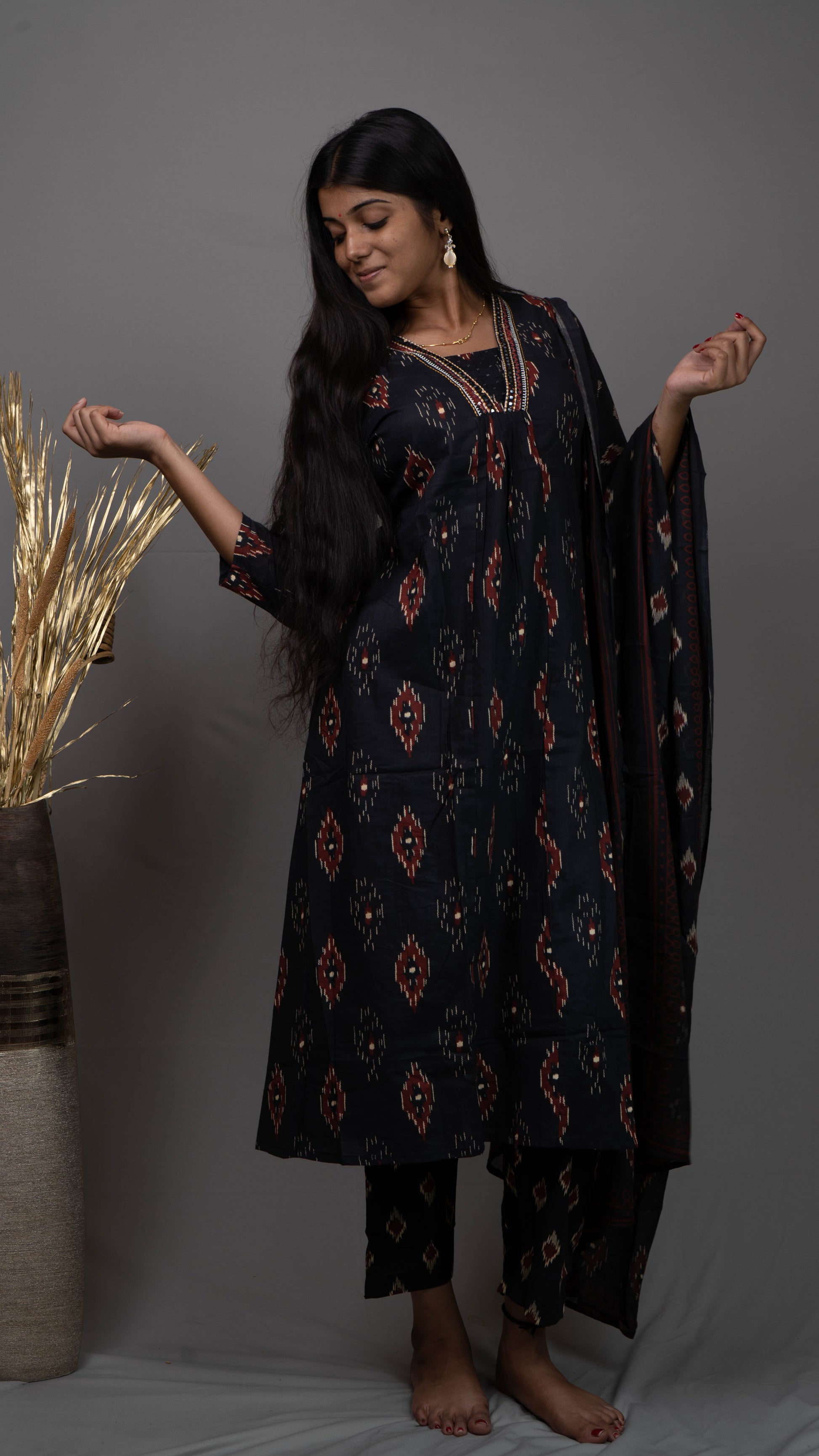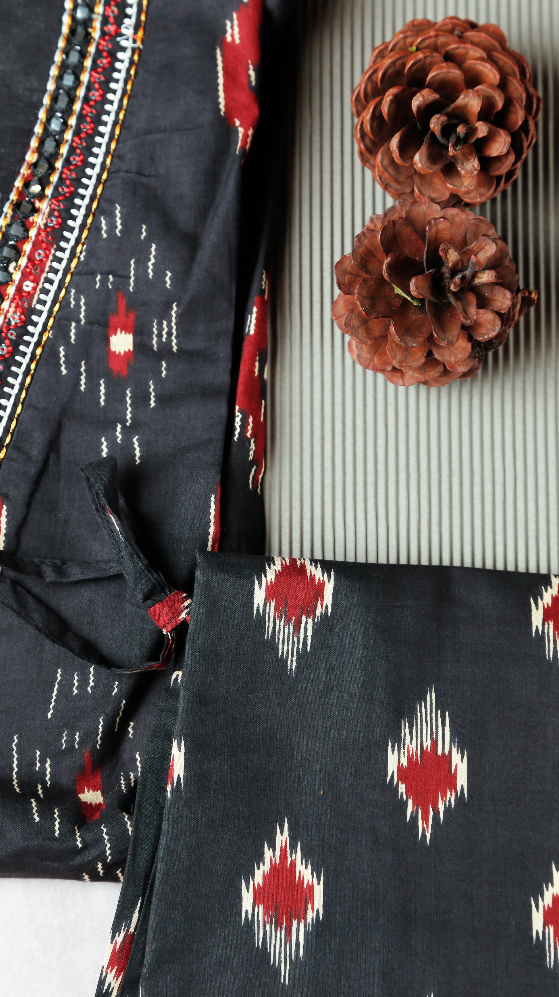 Pure soft ikkat cotton top with sequence work for neck, straight cut cotton bottom, pure cotton shawl.