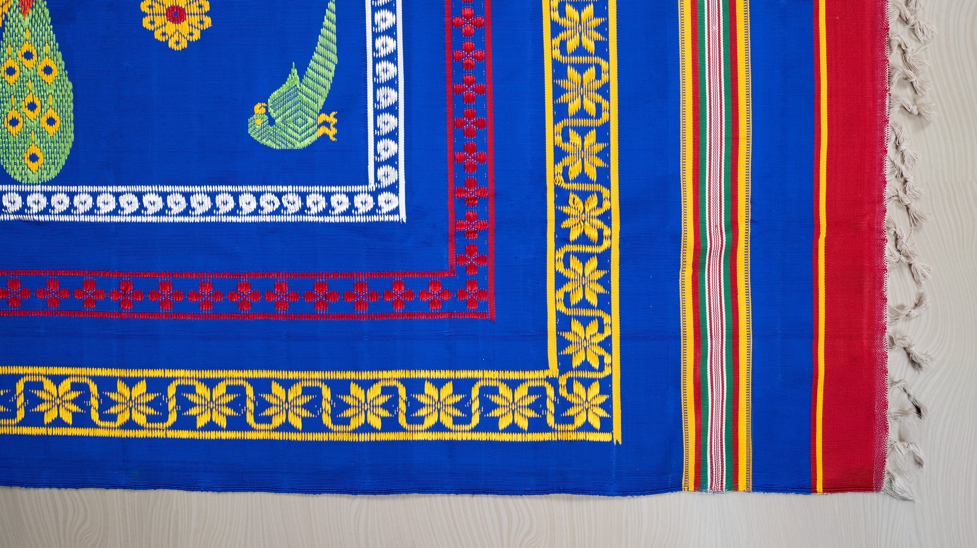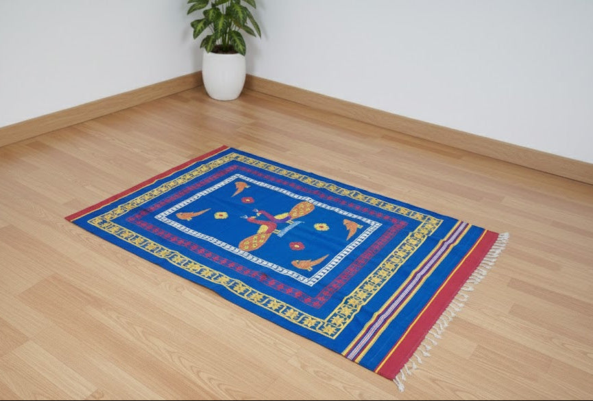 Our Blue Pattu Jamakkalam is a true representation of calm and class. In South Indian culture, deep blue symbolizes the vast sky and the deep ocean. It brings peace and stability to your home. Intricately detailed with shimmering gold thread work, this Jamakkalam turns any space into a sanctuary of elegance. Whether it is used for weddings to hold the sacred Seer Varisai or as a royal seat for guests, its deep blue color radiates a majestic, divine energy. The striking contrast between the rich azure blue and the shiny gold motifs creates a stunning visual. Each pattern is carefully printed to resemble the luxury of Kanchipuram silk, ensuring that the gold stands out beautifully against the dark background. This sets a regal stage for decorated plates and traditional offerings, making sure your most cherished moments are captured with a backdrop of pure luxury. Beyond its ceremonial roots, this Jamakkalam adds a stunning touch to the modern living room. Its cool blue tones provide a sophisticated, calming presence, while the traditional gold accents contribute a warm glow. It perfectly blends heritage with high-end decor, making your home feel both welcoming and deeply traditional.
