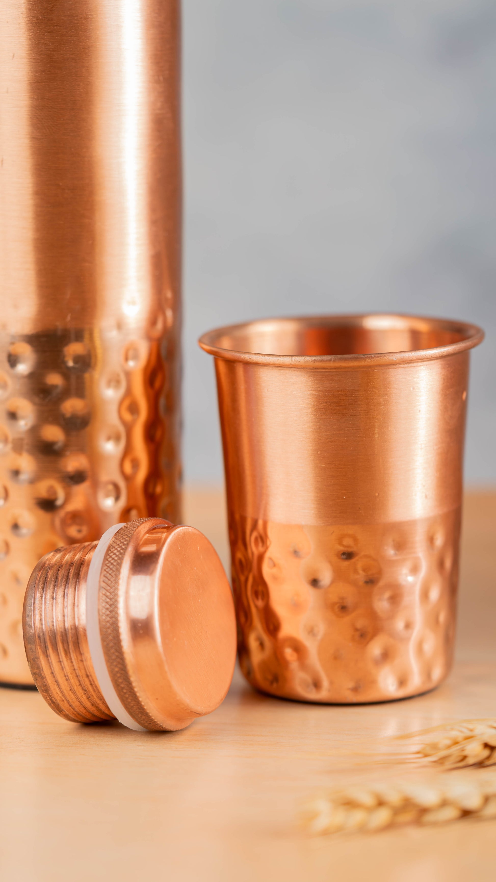 Introducing wellness and tradition in the form of our Copper Water Bottle and Glass Set. Inspired by early Ayurvedic ceremonies, this set will help you introduce Tamra Jal into your lifestyle with ease. Our set carries this tradition forward while modernizing it in a design that is easy to carry around the home, office, or while travelling. For centuries, copper has been recognised for storing water for purification and rejuvenation purposes. Copper notably consists of special properties that help a person maintain a healthy digestive function, regulate thyroid function, kill bacteria, and improve heart and skin health. It truly is an incredible powerhouse of health.