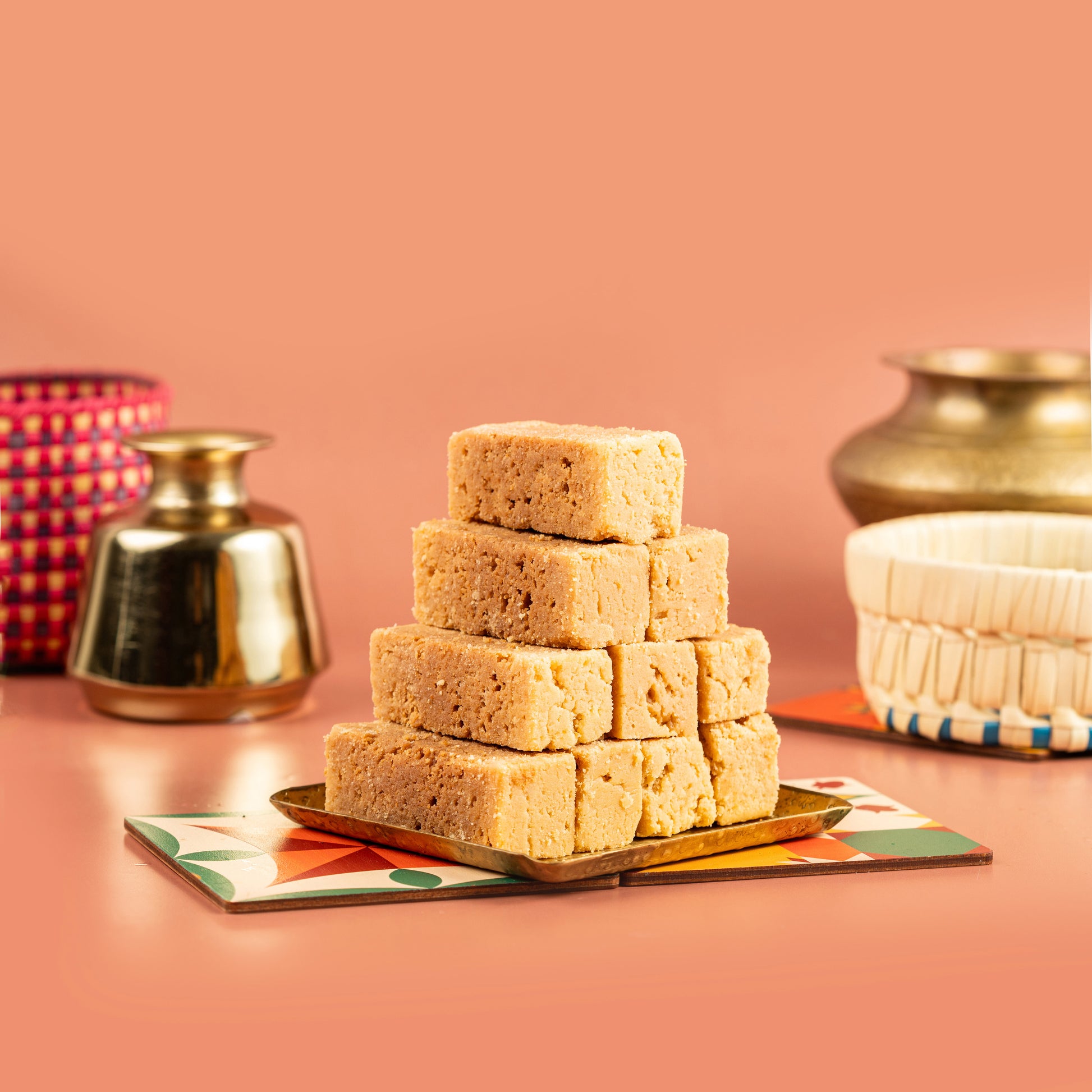 Made in small batches using traditional methods, our Mysore Pak contains no artificial flavors, colors, or preservatives. Only the highest quality ghee and flour are used to achieve that signature aroma and richness that all Mysore Pak lovers crave for.