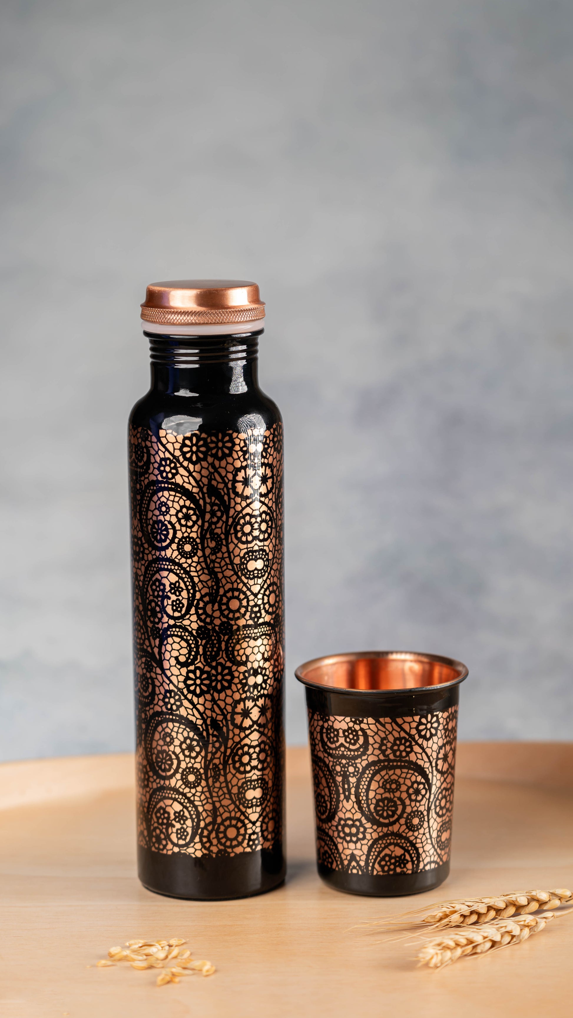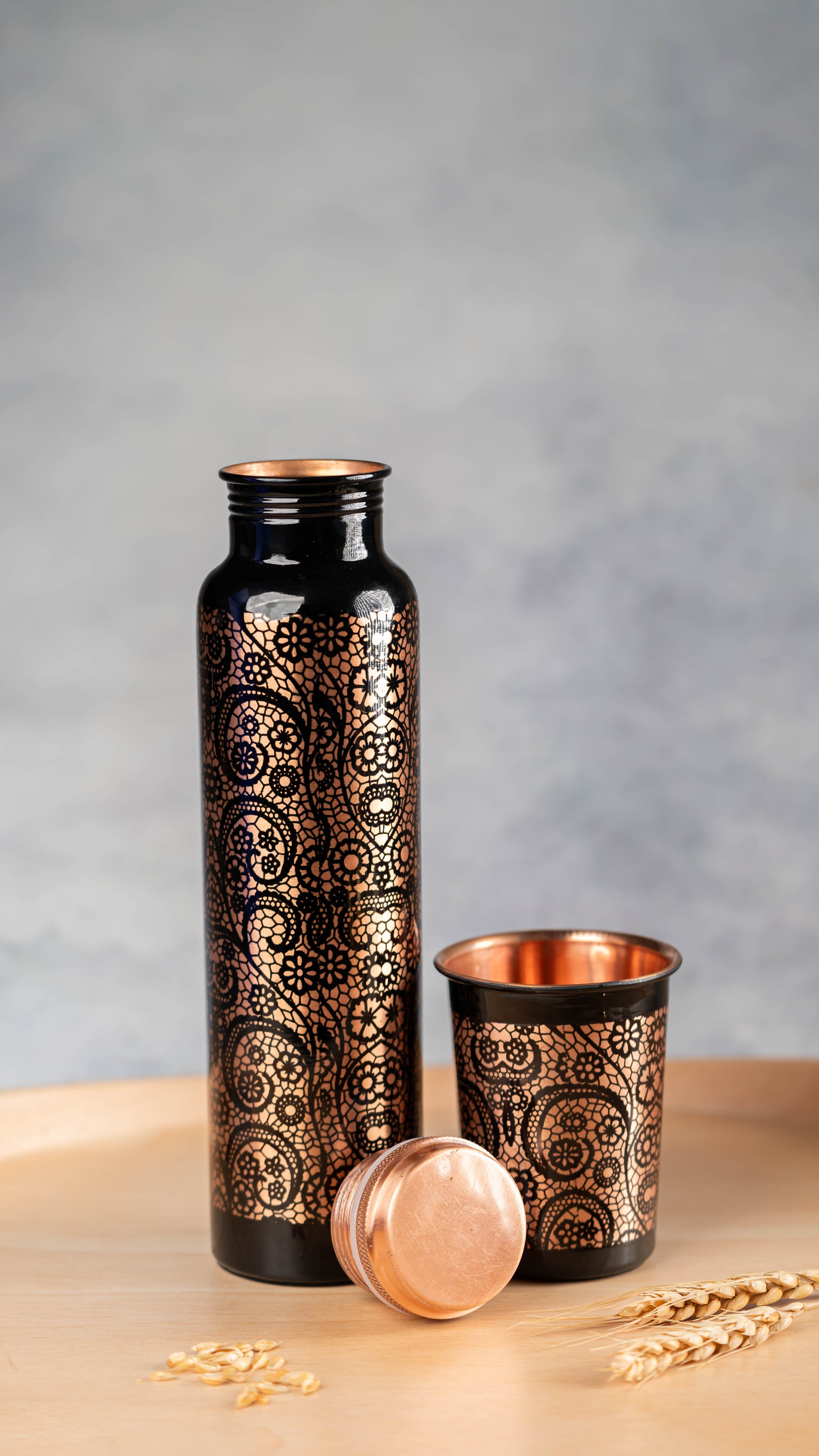 Rediscover the ancient art of healthy living with our Black Printed Copper Water Bottle with 1 Glass Set, a bundle of ancient wellness and modern style. Our copper water bottle set promotes the Ayurvedic ritual of incorporating Tamra Jal (water charged with copper) into your everyday life. Copper is naturally anti-microbial, helpful in digestion, brain health, thyroid regulation, heart health, skin health, and especially good for seniors joint health, and pain of arthritis.