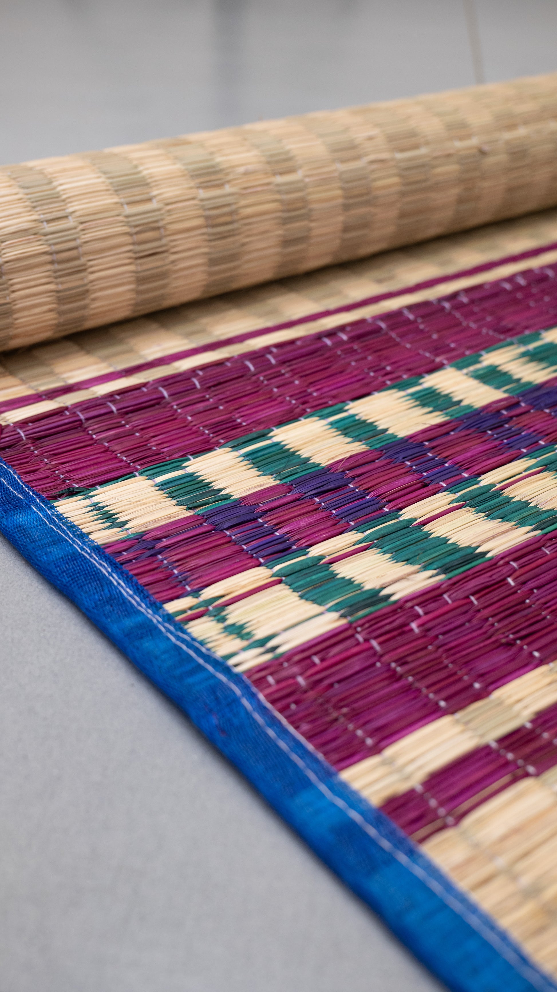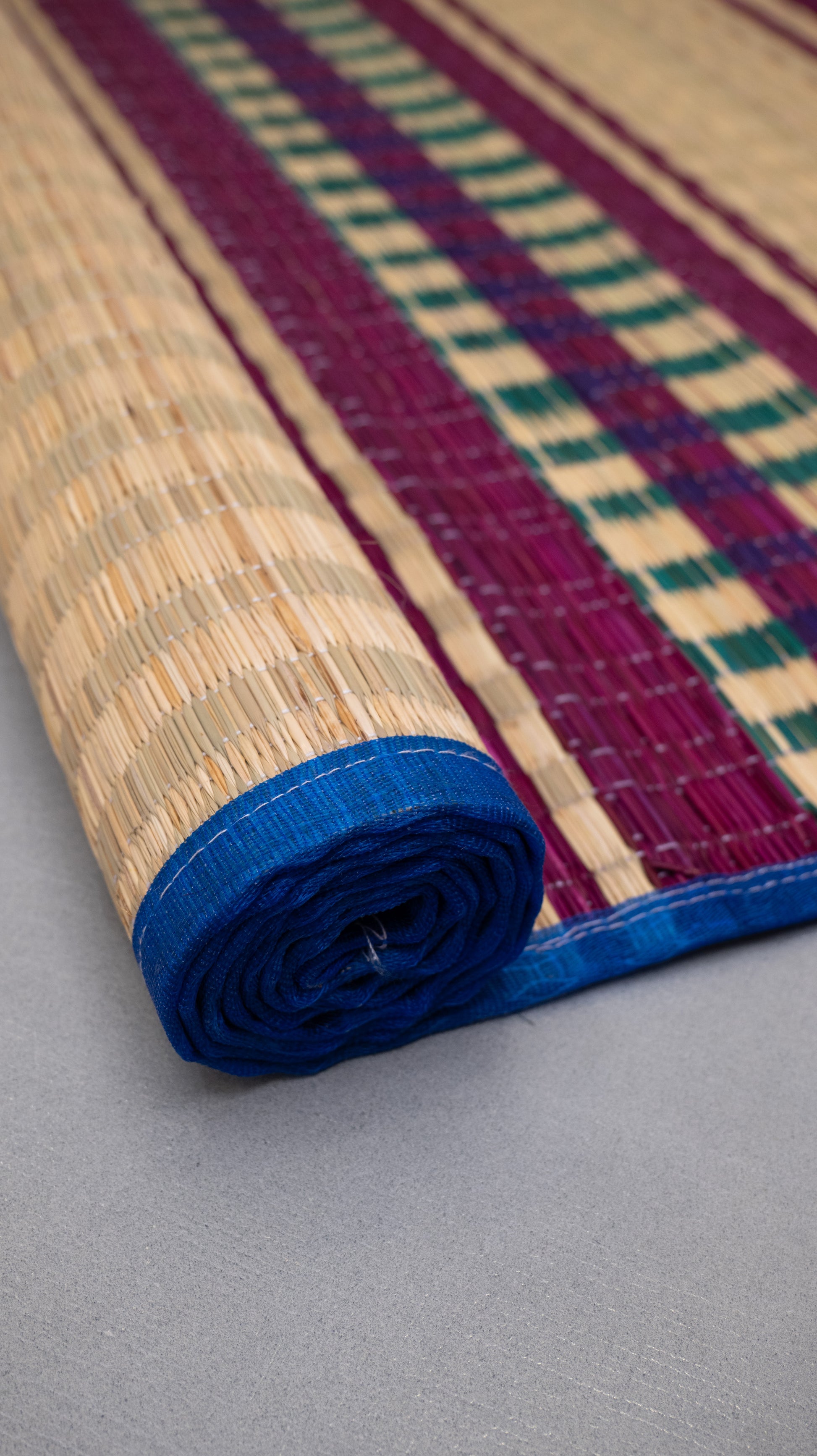 The Korai Pai Purple Stripes is a classic korai grass mat with a subtle vintage look. It is handwoven from naturally dried korai grass, offering durability, breathability, and comfort for daily use. The traditional purple stripe design adds a gentle visual touch while keeping the natural texture of the mat. The spacious size of this pai makes it perfect for floor seating, meals, prayer, meditation, stretching, or light resting.