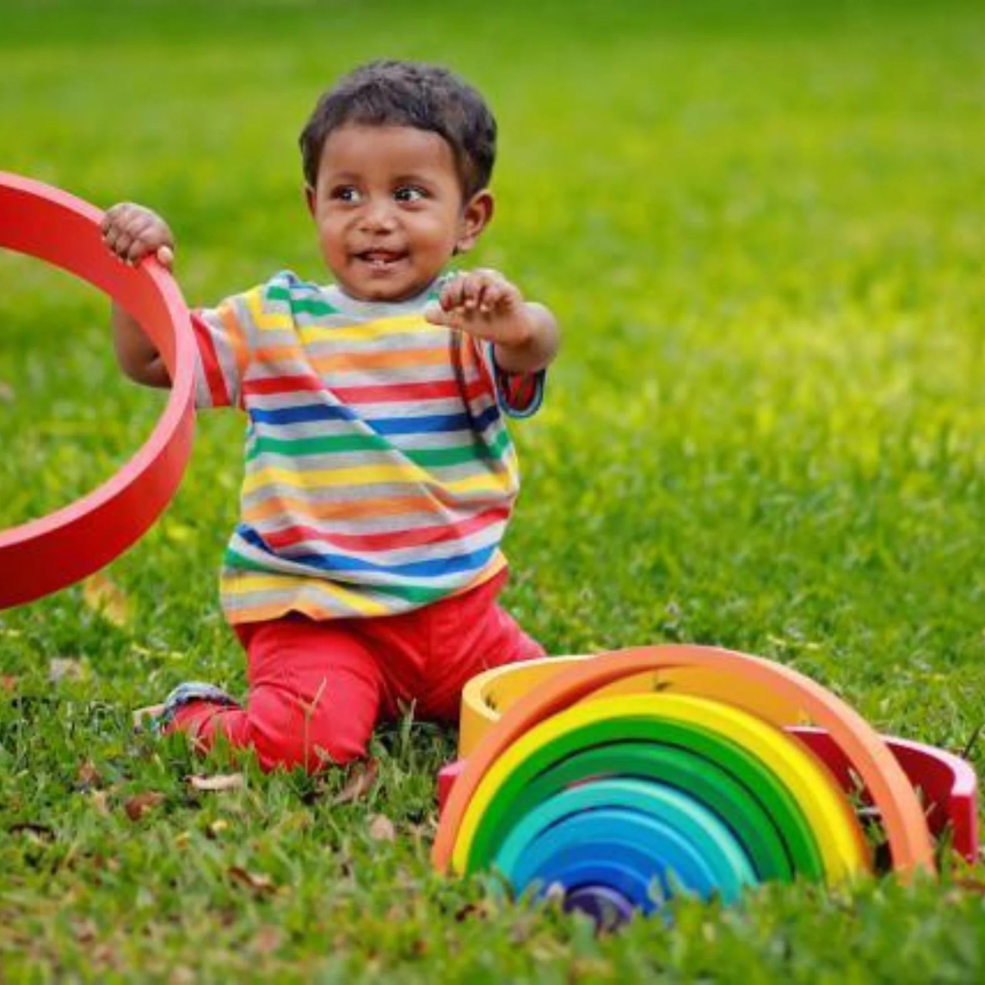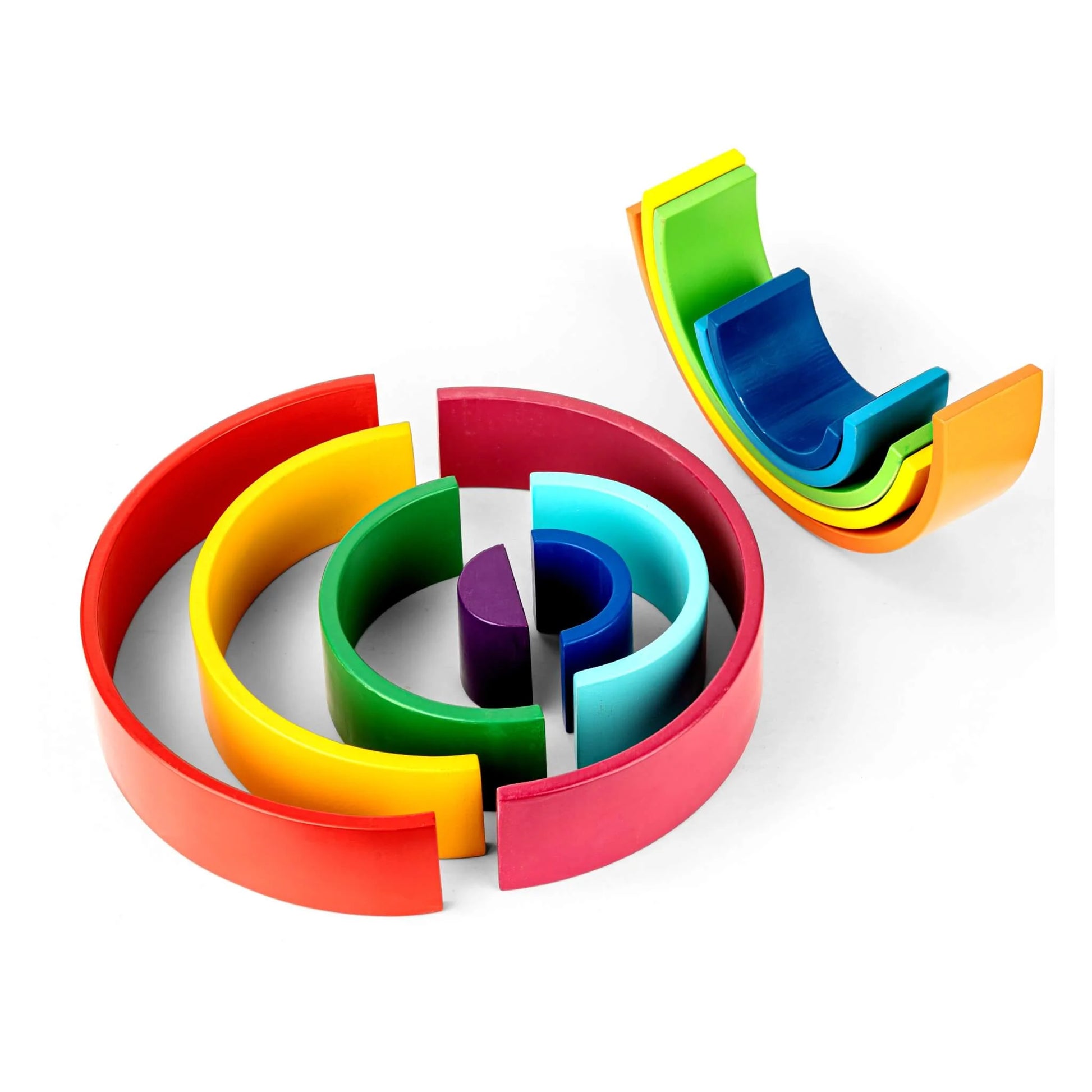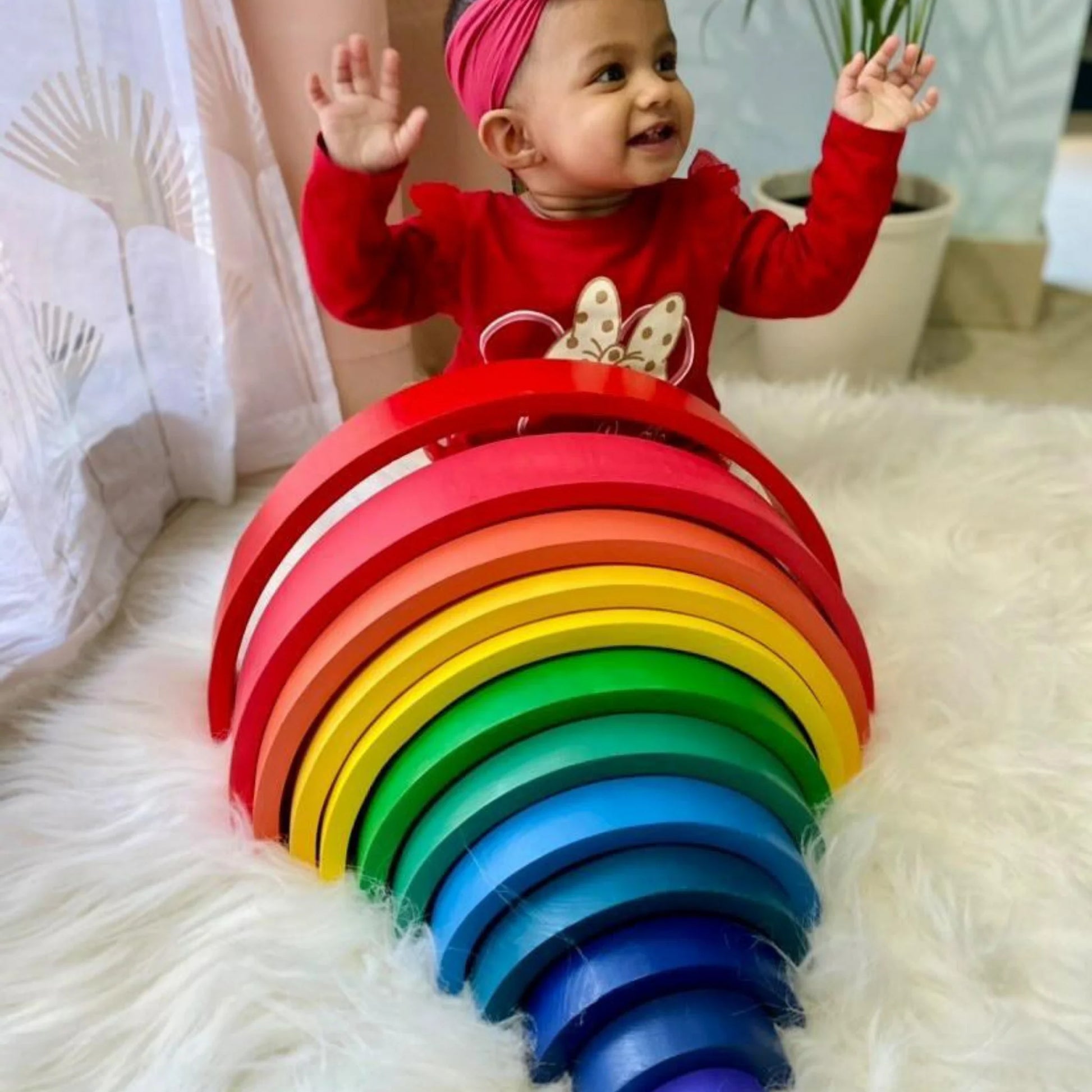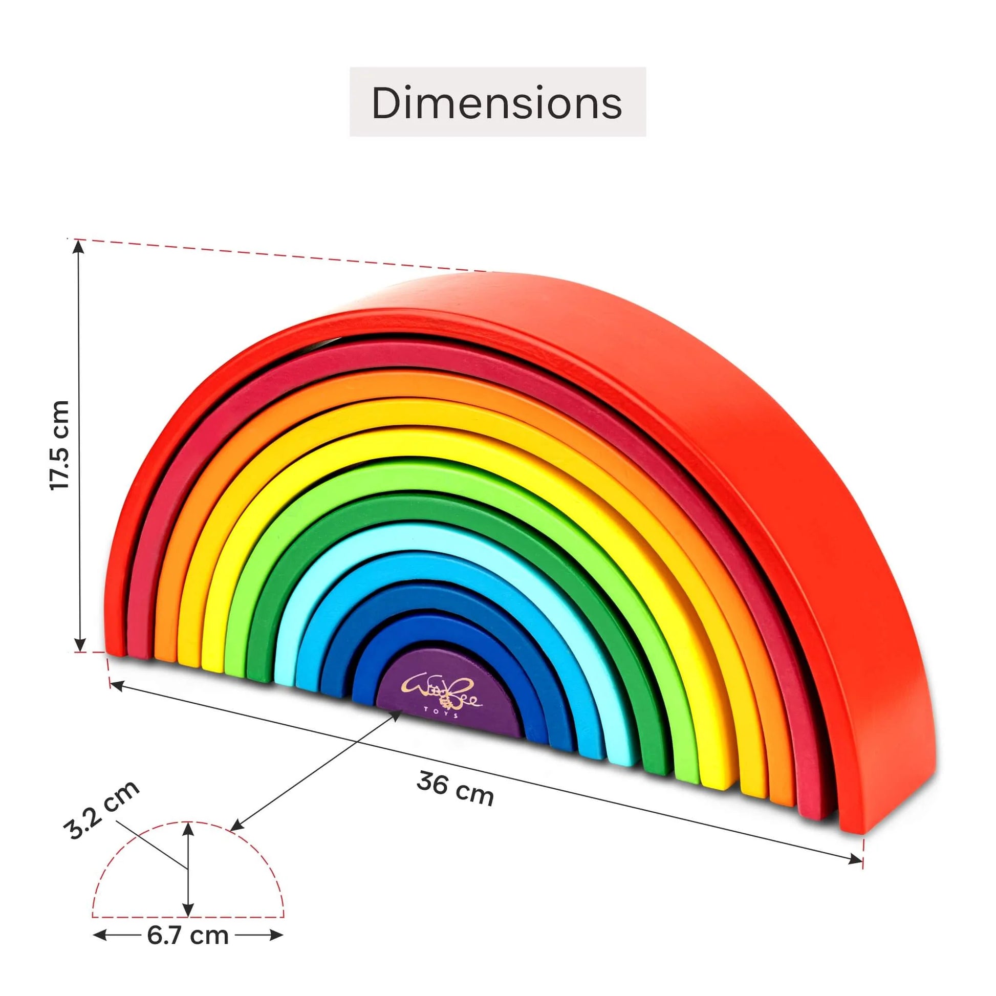 Our best-seller 12 pieces large wooden Rainbow stacker toy features wooden arches