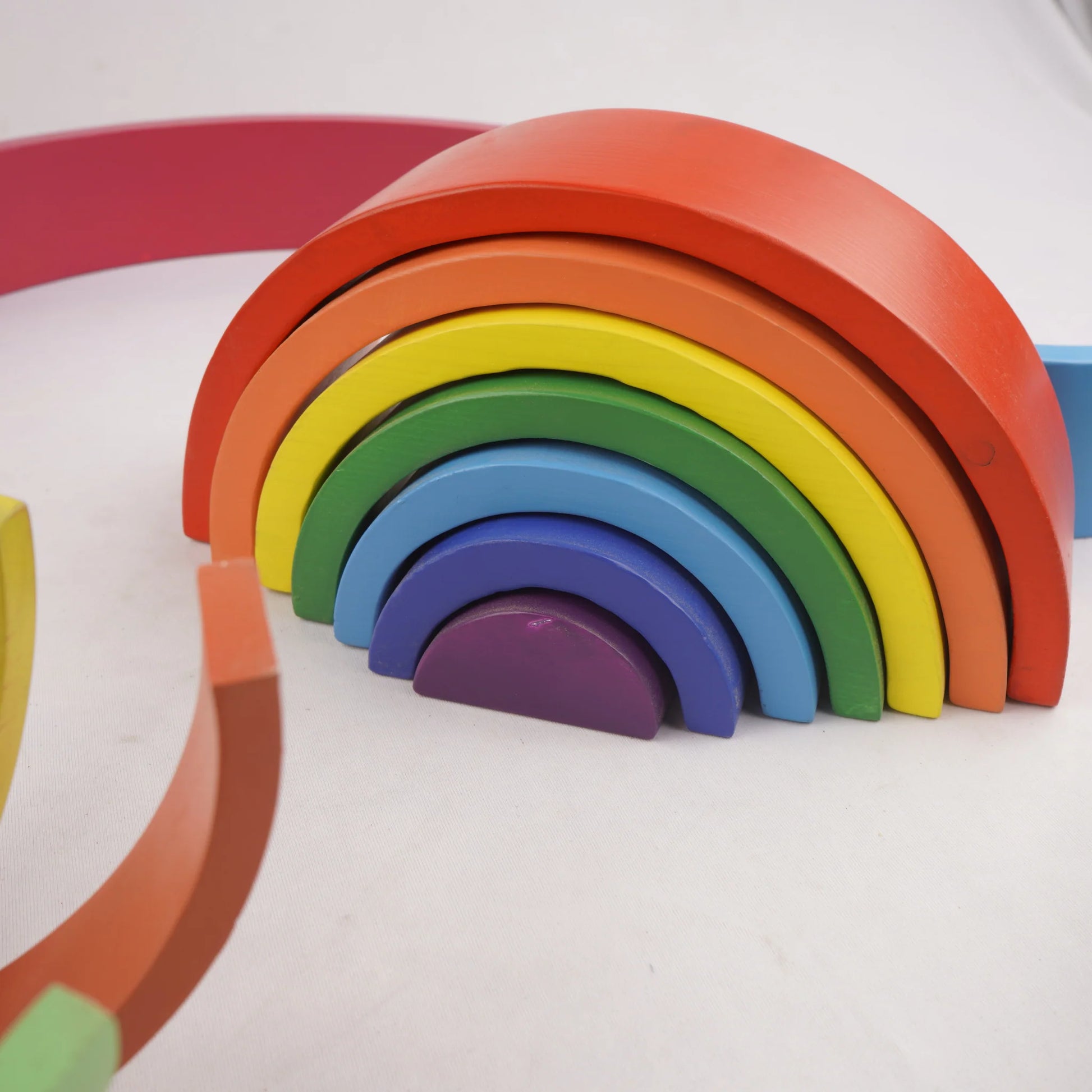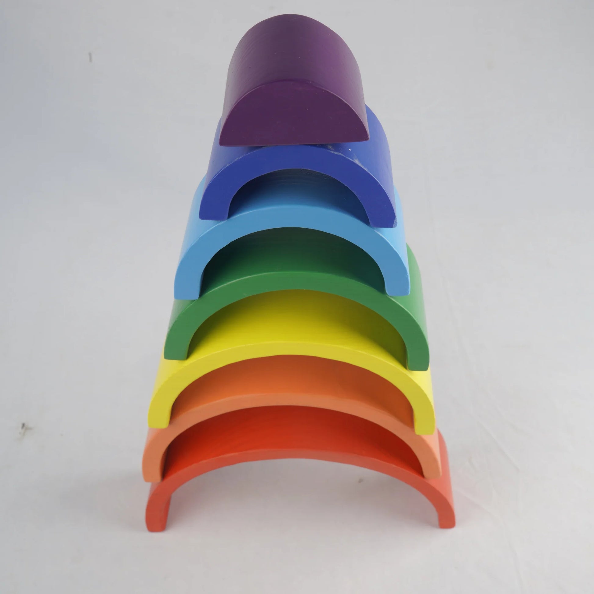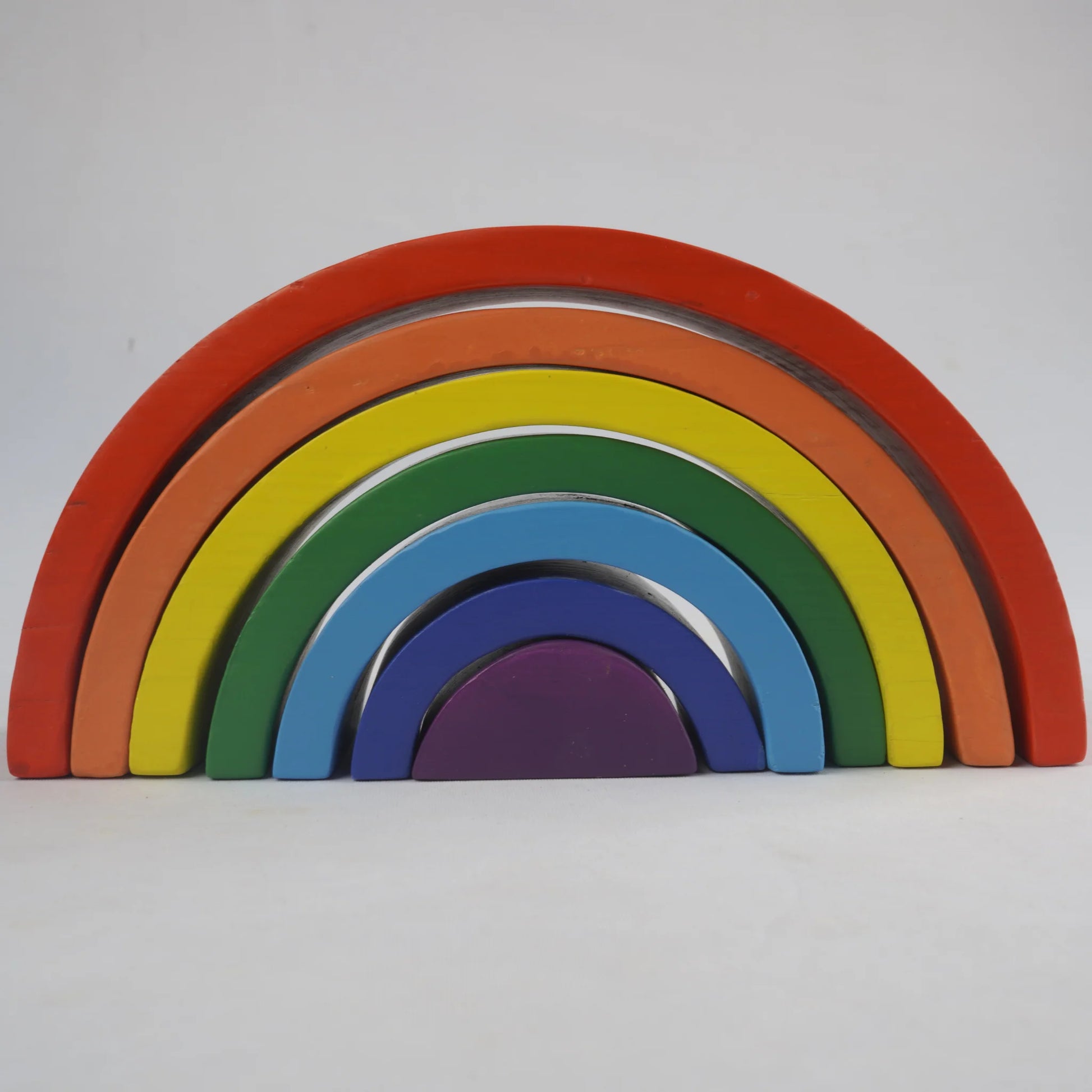 Our 7 pieces wooden Rainbow stacker toy features wooden arches of different colors to boost a child’s imagination, creativity, and captivate child in open-ended play.