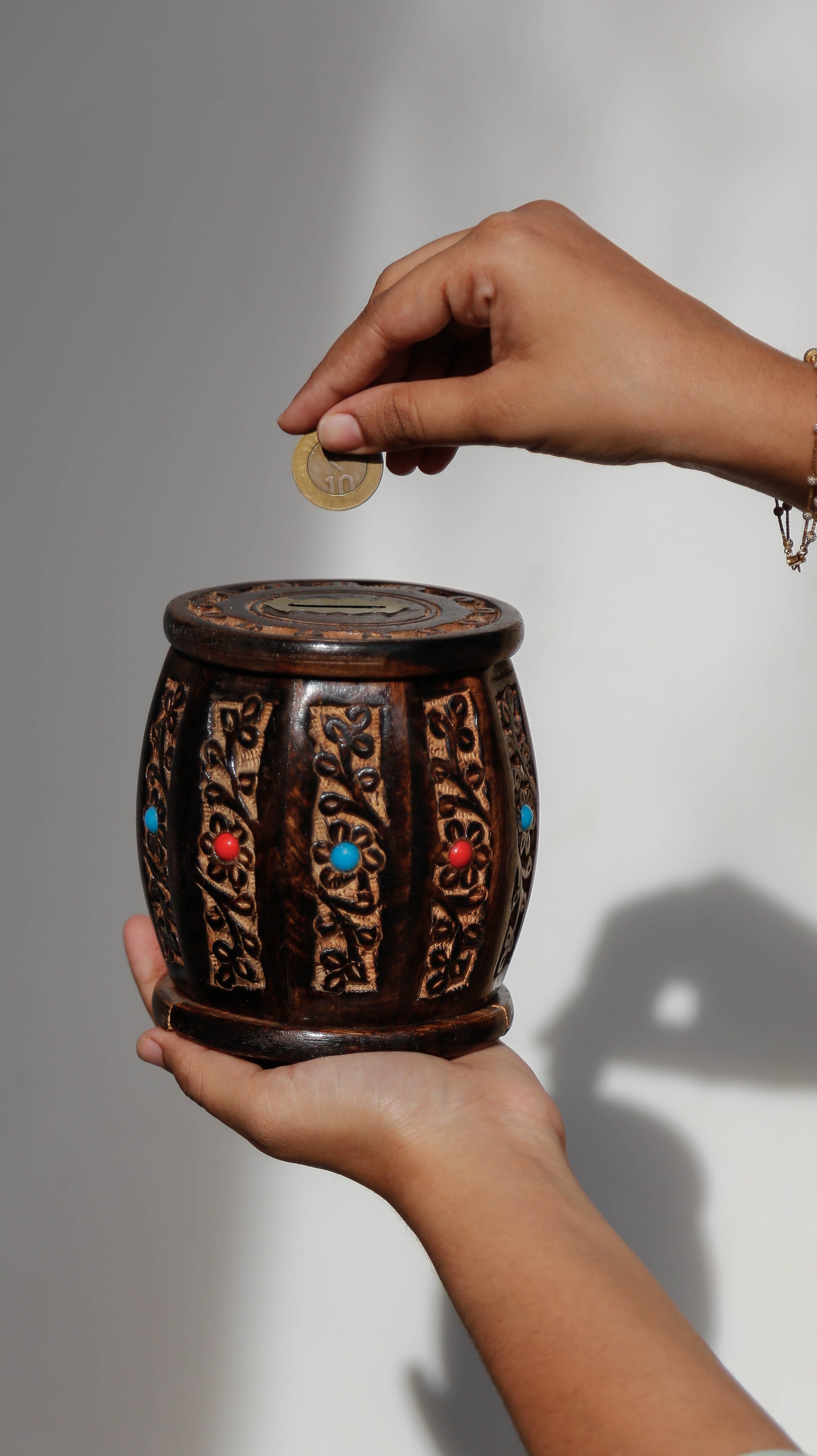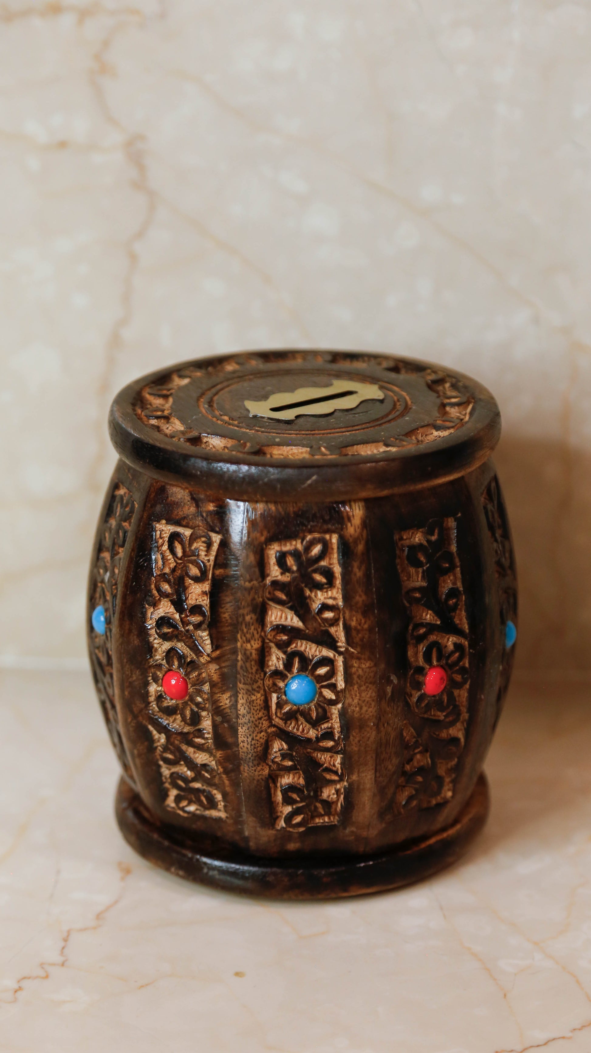 Every single saving becomes special with the Wooden Money Bank. Engraved in detail with floral designs representing traditional workmanship. Prepared by artisans, from fine wood and treated with a brownish antique finish to bring warmth and charm. Featuring a classic coin slot on the top while it securely opens from the base to retrieve savings, thus being a wonderful way of getting kids to learn to save or adding that nostalgic touch for grown-ups.