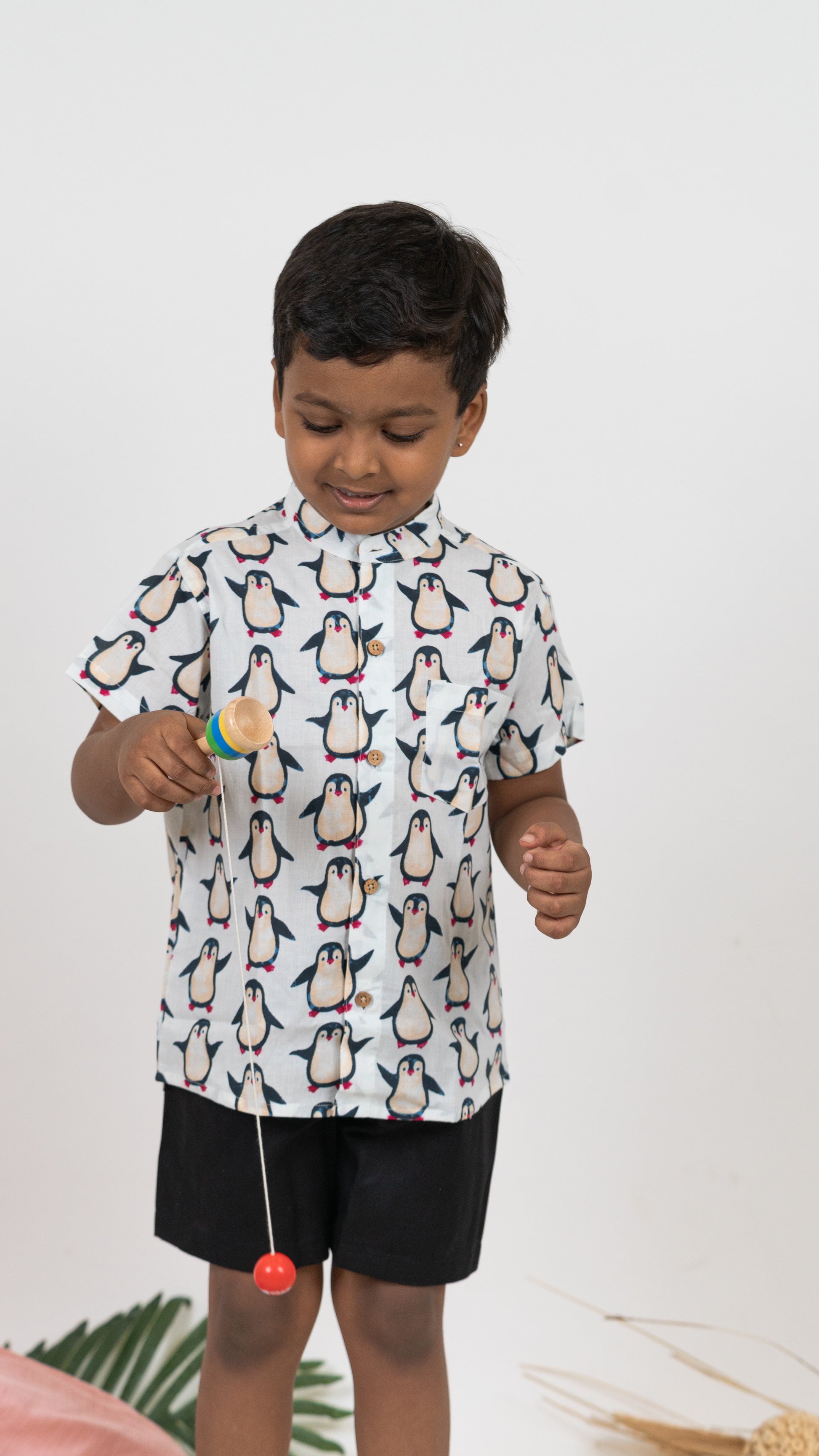 That’s what this Penguin Print Cotton Shirt and Shorts Set is made for. Bright, playful, and stitched in soft 100% cotton, it’s children’s clothing that moves with them—not against them. The shirt, sprinkled with penguins, short-sleeved for breezy comfort, and detailed with wooden buttons and a tiny chest pocket, brings a charm that’s both fun and grown-up. The solid black shorts? Built for movement, side pockets included—for all the “treasures” he finds along the way.