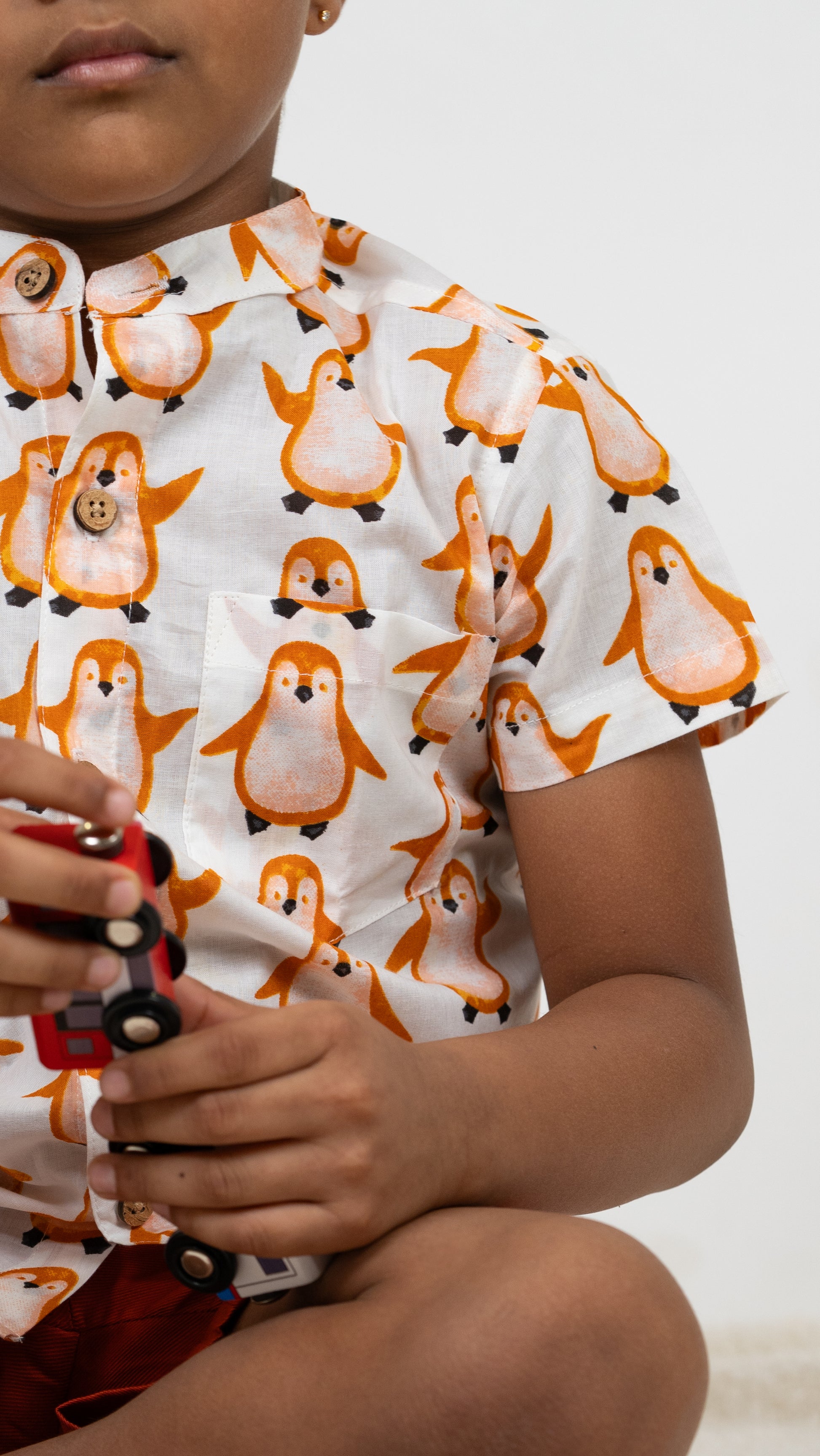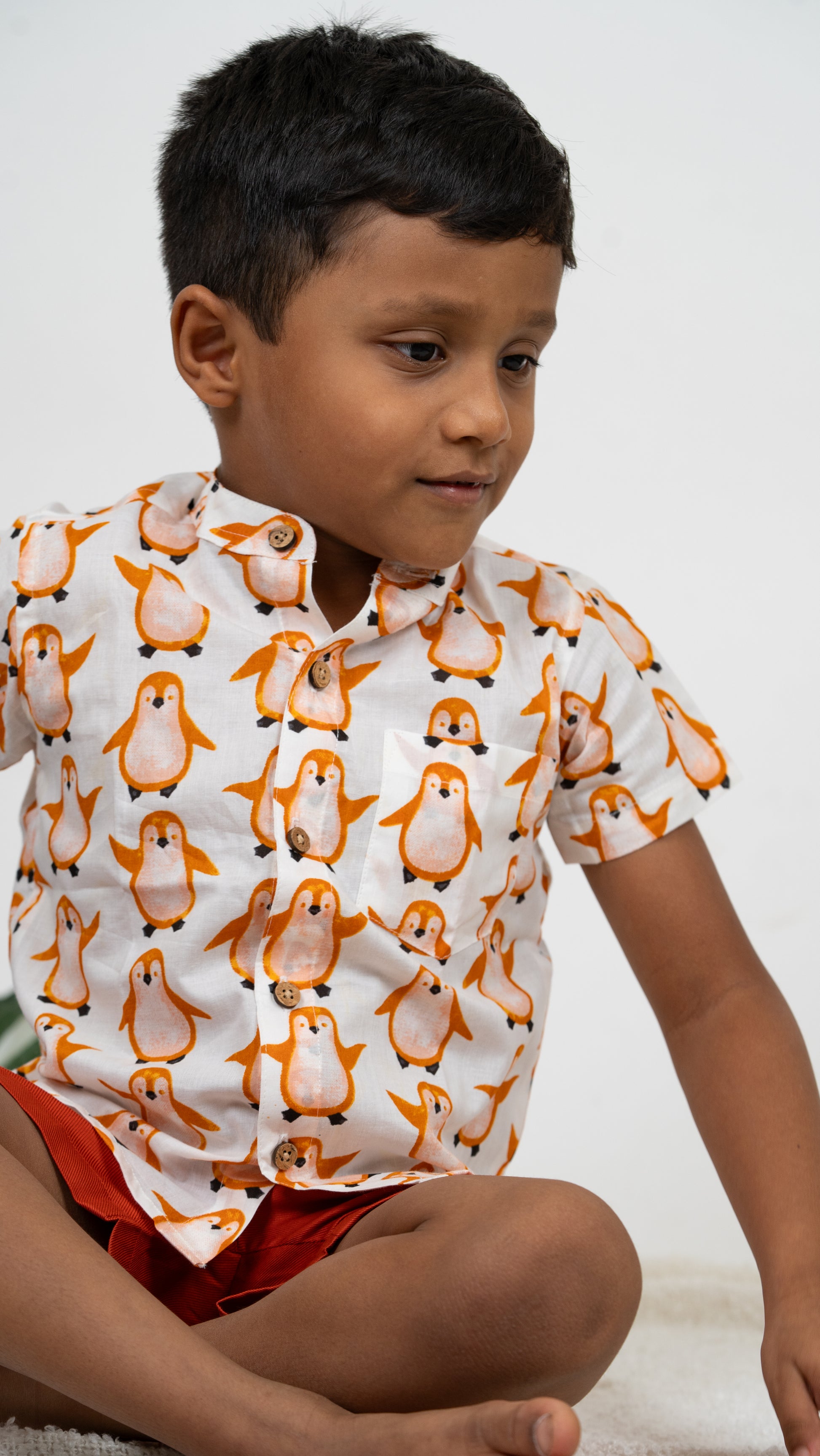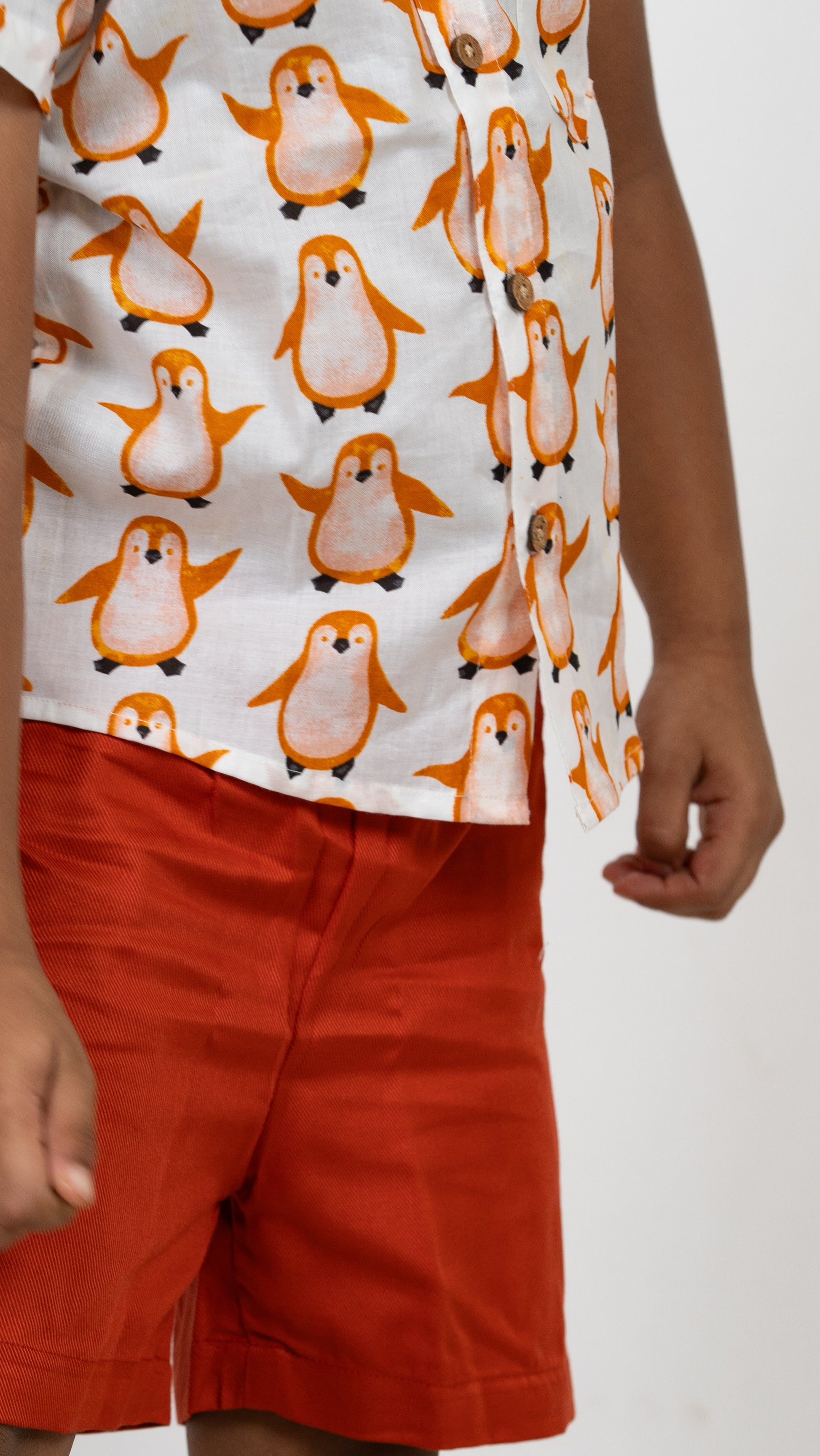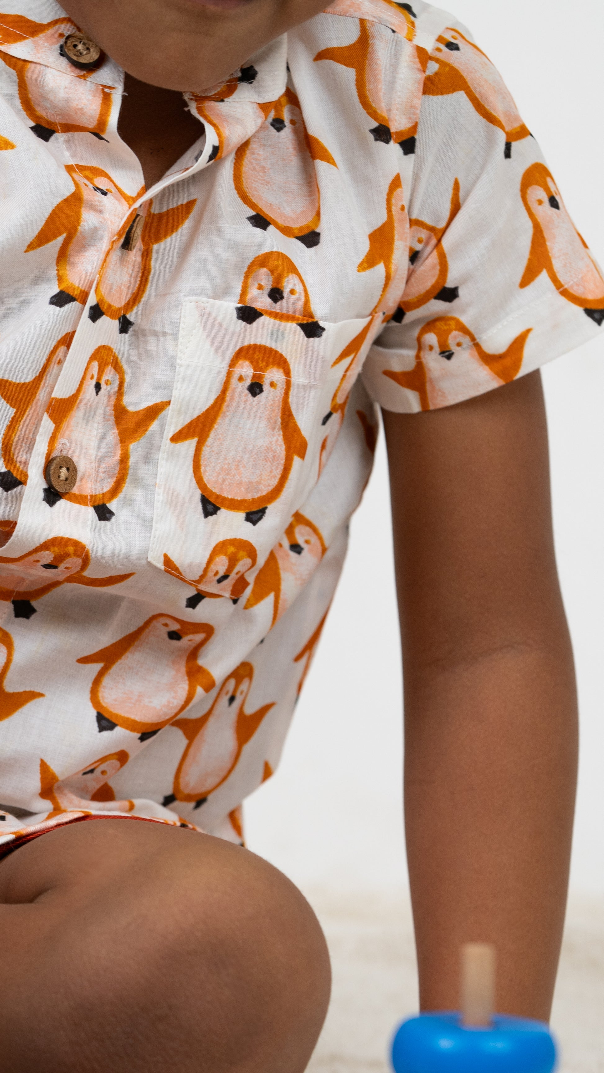 With this Boys Cotton Outfit: Orange Penguin Print, dress up your little one in utter playfulness. This Penguin Shirt and Shorts Set is made from 100% cotton. It features short sleeves with bright penguin prints on the shirt, while the shorts are solid orange and made right for ease and style. Stylized wooden front buttons, a chest pocket on the shirt, and shorts with side pockets that allow tiny hands to tuck away little treasures make for a great ensemble. Adorable and comfy, this outfit will surely become a favorite for playdates and family outings. It makes your child look stylish even in hot weather while being very comfortable. The shorts are elasticated for easy fitting and so that they can move easily without being distorted after every adventure. The perfect attire for any occasion