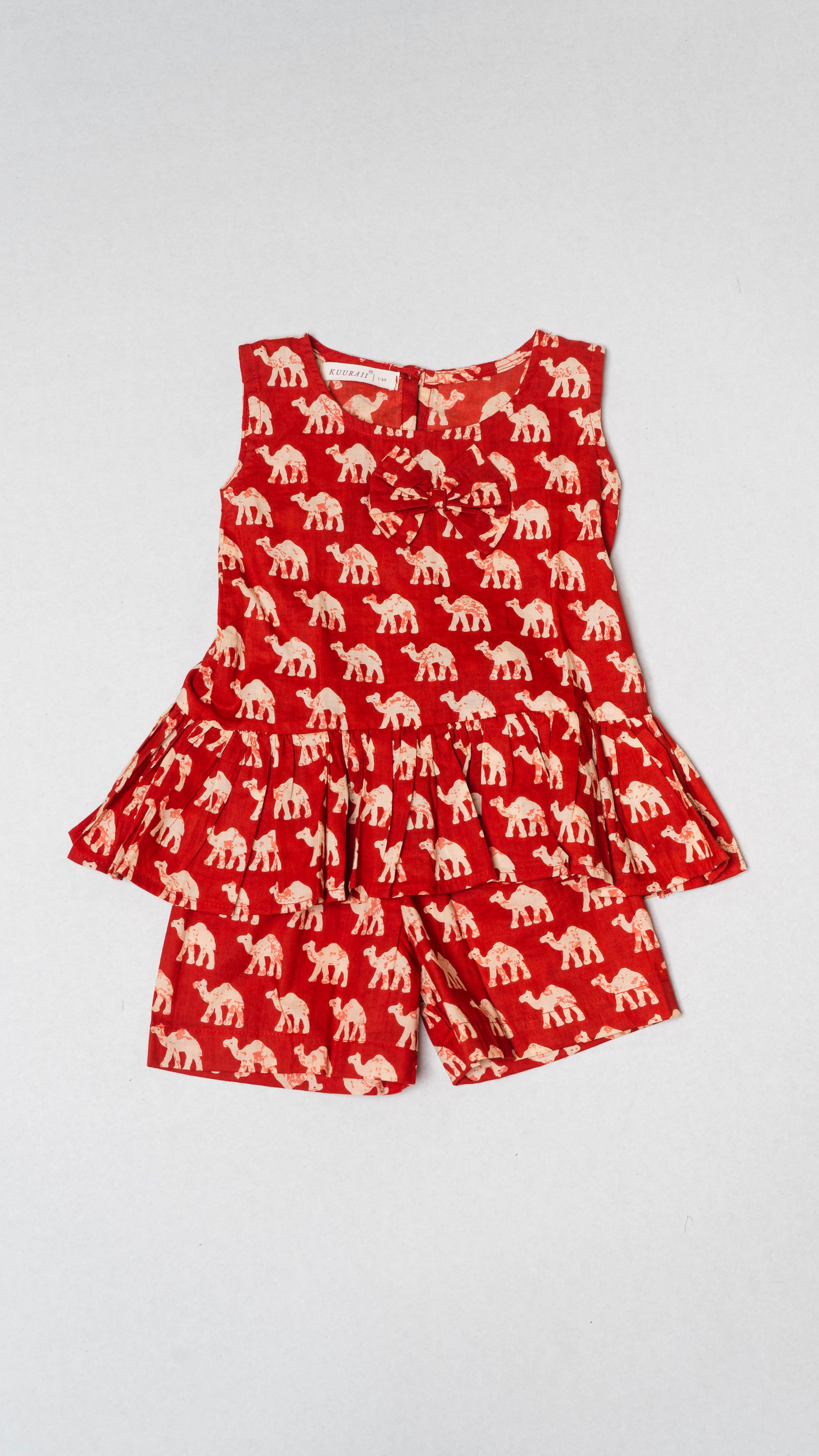 Let your young explorer have a stylish desert adventure with our Red Camel Bow Pattern Set for Girls. Featuring an opulent Red fabric with a sweet all-over white camel print and adorable bow detail at the neckline, this sweet two-piece is perfect for bright sunny days and play-filled adventures! The peplum ruffle at the top is a nice bonus of sweet playfulness.