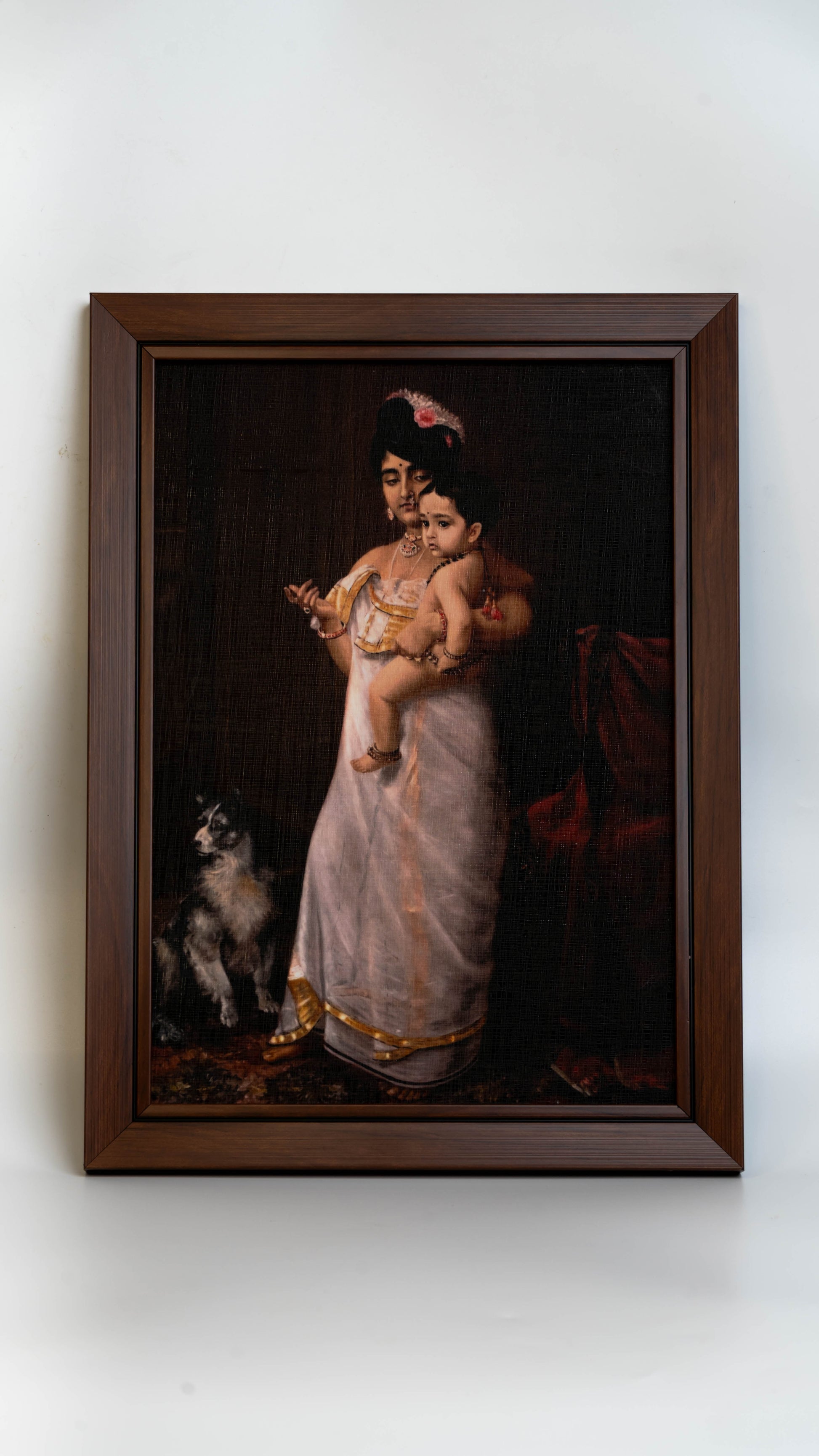 Bring some antique sophistication to your home with our Ravi Varma popular art - There comes papa. This painting by Raja Ravi Varma represents a touching moment of love and joy among family. A smiling child at the centre of the composition, standing with arms wide open and excited for her father to return home.